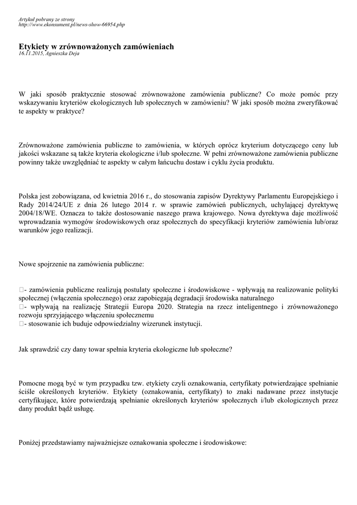 Artykuł pobrany ze strony http://www.ekonsument.pl/news-show-66954.php Etykiety w zrównoważonych zamówieniach 16.11.2015, Agnieszka Deja W jaki sposób praktycznie stosować zrównoważone zamówienia publiczne? Co może pomóc przy wskazywaniu kryteriów ekologicznych lub społecznych w zamówieniu? W jaki sposób można zweryfikować te aspekty w praktyce? Zrównoważone zamówienia publiczne to zamówienia, w których oprócz kryterium dotyczącego ceny lub jakości wskazane są także kryteria ekologiczne i/lub społeczne. W pełni zrównoważone zamówienia publiczne powinny także uwzględniać te aspekty w całym łańcuchu dostaw i cyklu życia produktu. Polska jest zobowiązana, od kwietnia 2016 r., do stosowania zapisów Dyrektywy Parlamentu Europejskiego i Rady 2014/24/UE z dnia 26 lutego 2014 r. w sprawie zamówień publicznych, uchylającej dyrektywę 2004/18/WE. Oznacza to także dostosowanie naszego prawa krajowego. Nowa dyrektywa daje możliwość wprowadzania wymogów środowiskowych oraz społecznych do specyfikacji kryteriów zamówienia lub/oraz warunków jego realizacji. Nowe spojrzenie na zamówienia publiczne: - zamówienia publiczne realizują postulaty społeczne i środowiskowe - wpływają na realizowanie polityki społecznej (włączenia społecznego) oraz zapobiegają degradacji środowiska naturalnego - wpływają na realizację Strategii Europa 2020. Strategia na rzecz inteligentnego i zrównoważonego rozwoju sprzyjającego włączeniu społecznemu - stosowanie ich buduje odpowiedzialny wizerunek instytucji. Jak sprawdzić czy dany towar spełnia kryteria ekologiczne lub społeczne? Pomocne mogą być w tym przypadku tzw. etykiety czyli oznakowania, certyfikaty potwierdzające spełnianie ściśle określonych kryteriów. Etykiety (oznakowania, certyfikaty) to znaki nadawane przez instytucje certyfikujące, które potwierdzają spełnianie określonych kryteriów społecznych i/lub ekologicznych przez dany produkt bądź usługę. Poniżej przedstawiamy najważniejsze oznakowania społeczne i środowiskowe: - Fairtrade - Fair For Life - Naturland Fair - Fair Stone - Forest Stewardship Council (FSC) - Global Organic Textile Standard (GOTS) - SA 8000 - EU Ecolabel Zgodnie z art. 43, ust. 1, aby dana etykieta mogła zostac