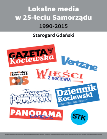 Lokalne media w 25-leciu Samorządu 1990-2015 Starogard Gdański Wystawa przygotowana przez Muzeum Ziemi Kociewskiej w Starogardzie Gdańskim, czasopisma i gazety pochodzą ze zbiorów Miejskiej Biblioteki Publicznej im. ks. Bernarda Sychty w Starogardzie Gdańskim Gazeta Kociewska jest najstarszą gazetą lokalną na Kociewiu. W tym roku obchodzi 25. urodziny. Trudno sobie wyobrazić dzisiaj rynek prasowy bez Gazety Kociewskiej. Ten tytuł, który powstał w 1990 r., w 1991 r. wszedł do rodziny gazet lokalnych wydawanych przez Wydawnictwo Pomorskie. Od tego czasu następował jego dynamiczny rozwój oraz umacnianie pozycji lidera. Kociewska to od wielu lat niezmiennie marka rozpoznawana w regionie i mająca swoich stałych Czytelników. Przez 25 lat wydawania „Gazety Kociewskiej” wydarzyło się wiele – dokonywały się w kraju wielkie przemiany społeczno – polityczne, rozwinęła się samorządność, w niepodległej Polsce żyjemy bardziej dla siebie – w naszych małych Ojczyznach. Te zmiany miały również znaczenie dla rynku prasowego. „Gazeta Kociewska” od początku do dziś jest tygodnikiem lokalnym, służącym mieszkańcom. Podejmuje często trudne tematy i obszernie, w sposób bardzo zaangażowany, działa aż do wyjaśnienia, czy też „załatwienia” spraw, z jakimi zwracają się do nas Czytelnicy. Przecież często nie zostaje im już inna droga na walkę o swoje sprawy. I tu rola gazety jest, jak pokazuje doświadczenie - bardzo skuteczna, o czym prze wiele lat społeczeństwo Starogardu i pobliskich gmin mogło się przekonać. Traktujemy Czytelników poważnie. Staramy się równoważyć prawidłową komunikację pomiędzy władzą a lokalną społecznością. Nie jesteśmy stroną w sporach, pokazujemy każdy aspekt starając się doprowadzić do rozwiązania. Nie sposób przypomnieć i wymienić wszystkich opisywanych przez nas spraw, podejmowanych interwencji, odwiedzonych miejsc, zaprezentowanych sylwetek. Wertując kolejne numery „Gazety” przypominamy sobie o niektórych z nich – co udało się dzięki nagłośnieniu w „Gazecie Kociewskiej” zrobić dla lokalnej społeczności. Jest to swoista kronika wydarzeń, dokumentacja życia na Kociewiu. Od ponad pięciu lat mam przyjemność prowadzić redakcję Gazety Kociewskiej a także nasz lokalny portal Kociewiak.pl. Jedno jest pewne, cały czas się rozwijamy. Idziemy z duchem czasu i staramy się sprostać oczekiwaniom potężnego grona naszych wiernych Czytelników. Dwukrotnie zostaliśmy wyróżnieni w ogólnopolskim, prestiżowym konkursie SGL LOCAL PRESS. Za 2012 rok w kategorii Społeczeństwo a za 2014 rok w kategorii Dziennikarstwo Śledcze i Interwencyjne. Z całą stanowczością mogę stwierdzić, że przyświecający nam cel to przekazywanie najbardziej obiektywnej i możliwie najszybszej informacji mieszkańcom powiatu starogardzkiego. Gazeta Kociewska oraz portal Kociewiak.pl są tworzone z myślą o ludziach i dla ludzi. Każdego dnia staramy się być, jak najbliżej naszych Czytelników - ich codziennych trosk i radości. Zapewniam, że Gazeta Kociewska oraz portal Kociewiak.pl to media, na które mieszkańcy Kociewia zawsze mogą liczyć. Anna Czyżewska Wystawa przygotowana przez Muzeum Ziemi Kociewskiej w Starogardzie Gdańskim, czasopisma i gazety pochodzą ze zbiorów Miejskiej Biblioteki Publicznej im. ks. Bernarda Sychty w Starogardzie Gdańskim Magazyn VERIZANE, to stosunkowo nowe pismo na lokalnym rynku wydawniczym. Dotychczas nie było takiego produktu. Twórcy stawiają na jakość. Począwszy od papieru, skończywszy na artykułach i fotografiach. - Uznaliśmy, że poręczny format połączony z niebanalnymi rozwiązaniami graficznymi sprawią, że chętniej czytelnik sięgnie po nasz tytuł. VERIZANE jako nazwa łacińska, według większości badaczy oznacza plemię słowiańskie - Wierzyczanie, zamieszkujące tereny wzdłuż rzeki Wierzycy. Stąd też piszemy o ludziach, wydarzeniach i miejscach znajdujących się wokół nas. Za pośrednictwem naszego magazynu chcemy dać Państwu zastrzyk pozytywnych emocji przybliżając dokonania lokalnej społeczności, często niedostrzegane przez inne media w zalewie brutalnej informacji i narastającego „hejtowania” pozytywnych inicjatyw. Nie przechodzimy też obojętnie obok spraw trudnych i ważnych. Zespół redakcyjny jest połączeniem młodości z doświadczeniem. Ważną rolę odgrywają młodzi reporterzy, wiedzący już na czym polega sztuka dziennikarska. Małgorzata Rogala, Maciej Knuth i Mateusz Cymanowski przedstawiają czytelnikom VERIZANE świeże spojrzenie na codzienne sprawy, z jakimi na co dzień się stykamy. Doświadczoną część zespołu redakcyjnego reprezentuje dziennikarz Radia Głos, lokalnych gazet, a także współtwórca Multimedialnego Portalu Informacyjnego 24STAROGARD.PL - Łukasz Rocławski. Redakcją kieruje Krzysztof Łach, który pracował w wielu tytułach prasowych, zaczynając od Głosu Wybrzeża, Gazety Kociewskiej, Nowej Kociewskiej, Wiadomości Kociewskich, Wieści z Kociewia, Panoramy Kociewia. Jest też właścicielem Multimedialnego Portalu Informacyjnego 24STAROGARD.PL, a także współtwórcą i byłym redaktorem naczelnym dwutygodnika Dzień Dobry Starogard. Wielkim atutem VERIZANE jest obraz. Wyjątkowość otaczających nas ludzi i miejsc w swoich fotografiach wydobywa Krzysztof Rudek - fotografik, który swoimi zdjęciami sprawił, że do VERIZANE czytelnicy nie podchodzą obojętnie. Co ważne VERIZANE jest czasopismem bezpłatnym, a z myślą o czytelnikach, szczególnie tych, którym nie udaje się zdobyć magazynu w formie tradycyjnej (papierowej), do dyspozycji jest wersja elektroniczna, wzbogacona o materiały wideo i audio. Multimedialna forma pozwala na dotarcie do szerzej grupy odbiorców. Krzysztof Łach Wystawa przygotowana przez Muzeum Ziemi Kociewskiej w Starogardzie Gdańskim, czasopisma i gazety pochodzą ze zbiorów Miejskiej Biblioteki Publiczne