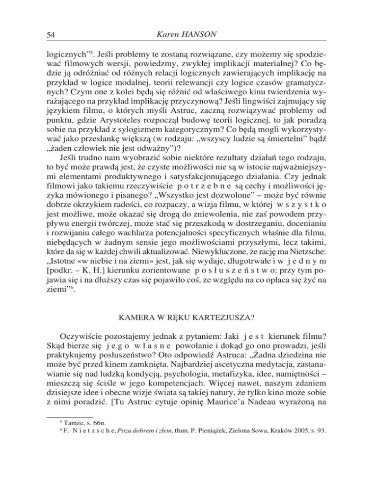 Karen HANSON 54 logicznych”5. Jeśli problemy te zostaną rozwiązane, czy możemy się spodzie− wać filmowych wersji, powiedzmy, zwykłej implikacji materialnej? Co bę− dzie ją odróżniać od różnych relacji logicznych zawierających implikację na przykład w logice modalnej, teorii relewancji czy logice czasów gramatycz− nych? Czym one z kolei będą się różnić od właściwego kinu twierdzenia wy− rażającego na przykład implikację przyczynową? Jeśli lingwiści zajmujący się językiem filmu, o których myśli Astruc, zaczną rozwiązywać problemy od punktu, gdzie Arystoteles rozpoczął budowę teorii logicznej, to jak poradzą sobie na przykład z sylogizmem kategorycznym? Co będą mogli wykorzysty− wać jako przesłankę większą (w rodzaju: „wszyscy ludzie są śmiertelni” bądź „żaden człowiek nie jest odważny”)? Jeśli trudno nam wyobrazić sobie niektóre rezultaty działań tego rodzaju, to być może prawdą jest, że czyste możliwości nie są w istocie najważniejszy− mi elementami produktywnego i satysfakcjonującego działania. Czy jednak filmowi jako takiemu rzeczywiście p o t r z e b n e są cechy i możliwości ję− zyka mówionego i pisanego? „Wszystko jest dozwolone” – może być równie dobrze okrzykiem radości, co rozpaczy, a wizja filmu, w której w s z y s t k o jest możliwe, może okazać się drogą do zniewolenia, nie zaś powodem przy− pływu energii twórczej, może stać się przeszkodą w dostrzeganiu, docenianiu i rozwijaniu całego wachlarza potencjalności specyficznych właśnie dla filmu, niebędących w żadnym sensie jego możliwościami przyszłymi, lecz takimi, które da się w każdej chwili aktualizować. Niewykluczone, że rację ma Nietzsche: „Istotne «w niebie i na ziemi» jest, jak się wydaje, długotrwałe i w j e d n y m [podkr. – K. H.] kierunku zorientowane p o s ł u s z e ń s t w o: przy tym po− jawia się i na dłuższy czas się pojawiło coś, ze względu na co opłaca się żyć na ziemi”6. KAMERA W RĘKU KARTEZJUSZA? Oczywiście pozostajemy jednak z pytaniem: Jaki j e s t kierunek filmu? Skąd bierze się j e g o w ł a s n e powołanie i dokąd go ono prowadzi, jeśli praktykujemy posłuszeństwo? Oto odpowiedź Astruca: „Żadna dziedzina nie może być przed kinem zamknięta. Najbardziej ascetyczna medytacja, zastana− wianie się nad ludzką kondycją, psychologia, metafizyka, idee, namiętności – mieszczą się ściśle w jego kompetencjach. Więcej nawet, naszym zdaniem dzisiejsze idee i obecne wizje świata są takiej natury, że tylko kino może sobie z nimi poradzić. [Tu Astruc cytuje opinię Maurice’a Nadeau wyrażoną na 5 6 Tamże, s. 66n. F. N i e t z s c h e, Poza dobrem i złem, tłum. P. Pieniążek, Zielona Sowa, Kraków 2005, s. 93. Minerwa w kinie. O relacjach między filozofią a filmem 55 łamach gazety «Combat»: «Gdyby Kartezjusz żył w naszych czasach, pisałby powieści» – K. H.]. Otóż nie chcę robić przykrości Nadeau, ale dzisiaj Karte− zjusz zamknąłby się w pokoju z kamerą 16 mm i taśmą i stworzyłby swoją Rozprawę o metodzie w postaci filmu, ponieważ natura jego dzisiejszej Roz− prawy o metodzie byłaby taka, że jedynie kino mogłoby jej sprostać”7. Trzeba jednak pamiętać, że Kartezjuszowa Rozprawa o metodzie zawiera żywe i porywające fragmenty intelektualnej autobiografii. Poza tym nie zosta− ła napisana po łacinie, w języku akademii, lecz po francusku, w języku ludu, tak aby mogła dotrzeć do szerszego grona odbiorców, także poza uniwersytec− kimi kolegiami i Kościołem, i być dla nich zrozumiała. Prawdą jest, że pragnie− nie stworzenia dzieła autobiograficznego i przekazania własnych poglądów może z powodzeniem znaleźć wyraz w produkcji filmu. (Jakkolwiek wydaje się, że to, czy wyraz ów byłby a d e k w a t n y, jeśli film miałby powstać „w zamknię− ciu”, w pokoju jego twórcy, zależałoby od rodzaju życia, które twórca pragnie zarejestrować, od tego, co chce przekazać, a być może także od tego, czy zamknął się on w tym pokoju sam, czy razem z innymi ludźmi. Żyjący w siedemnas− tym wieku Kartezjusz w istocie przedstawia sobą obraz pracującego w samot− ności pisarza i oczywiście mógłby nakręcić taki film sam. Jego myśli mają jednakże szeroki zakres: obejmują konwersacje, podróże, architekturę spo− łeczną i planowanie miast, jak również koncentrują się na jego niepowątpie− walnym przeświadczeniu o istnieniu duszy i Boga i na niektórych problemach z zakresu biologii i kosmologii. Kartezjański filmowiec, zamknięty w swoim pokoju, będzie zapewne musiał pomieszczenie to zapełnić rekwizytami; praw− dopodobnie nie będzie mógł pracować zupełnie sam albo też będzie musiał ukazać zupełnie inny wachlarz zjawisk). W każdym razie, jeśli pominiemy element autobiograficzny i kwestię odbiorcy dzieła, tym, co większość filozofów prawdopodobnie zapamiętuje jako pierwszą rzecz z Rozprawy o metodzie, jest fakt, że stanowi ona opis i uzasadnienie metody, którą moglibyśmy stosować, by – jak mówi Kartezjusz – odkryć „wszyst− kie rzeczy dostępne poznaniu ludzkiemu”8. Metoda ta stanowi syntezę kom− petentnego podziwu Kartezjusza dla „sztuk czy też nauk”9, czyli dla logiki, analizy geometrycznej i algebry, i jest zazwyczaj określana jako „geometrycz− na”, zaleca bowiem, w przypadku każdego badania, wychodzenie od ograni− czonej liczby aksjomatów i dokonywanie, drogą dedukcji, małych kroków, ograniczanych przez wyraźne reguły. W ten sposób, jak w siedemnastym wie− ku tłumaczył Kartezjusz, możemy tworzyć „długie łańcuchy uzasadnień, zu− 7 A s t r u c, dz. cyt., s. 63. R. D e s c a r t e s, Rozprawa o metodzie właściwego kierowania rozumem i poszukiwania prawdy w naukach, tłum. W. Wojciechowska, PWN, Warszawa 1988, cz. 2, s. 23. 9 Tamże, cz. 2, s. 2