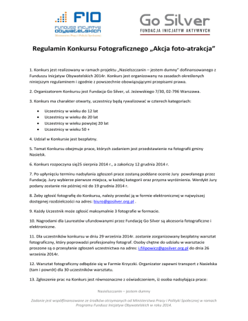 Regulamin Konkursu Fotograficznego „Akcja foto-atrakcja” 1. Konkurs jest realizowany w ramach projektu „Nasielszczanin – jestem dumny” dofinansowanego z Funduszu Inicjatyw Obywatelskich 2014r. Konkurs jest organizowany na zasadach określonych niniejszym regulaminem i zgodnie z powszechnie obowiązującymi przepisami prawa. 2. Organizatorem Konkursu jest Fundacja Go Silver, ul. Jeżewskiego 7/30, 02-796 Warszawa. 3. Konkurs ma charakter otwarty, uczestnicy będą rywalizować w czterech kategoriach: Uczestnicy w wieku do 12 lat Uczestnicy w wieku do 20 lat Uczestnicy w wieku powyżej 20 lat Uczestnicy w wieku 50 + 4. Udział w Konkursie jest bezpłatny. 5. Temat Konkursu obejmuje prace, których zadaniem jest przedstawienie na fotografii gminy Nasielsk. 6. Konkurs rozpoczyna się25 sierpnia 2014 r., a zakończy 12 grudnia 2014 r. 7. Po upłynięciu terminu nadsyłania zgłoszeń prace zostaną poddane ocenie Jury powołanego przez Fundację. Jury wybierze pierwsze miejsca, w każdej kategorii oraz przyzna wyróżnienia. Werdykt Jury podany zostanie nie później niż do 19 grudnia 2014 r. 8. Żeby zgłosić fotografię do Konkursu, należy przesłać ją w formie elektronicznej w najwyższej dostępnej rozdzielczości na adres: [email protected] . 9. Każdy Uczestnik może zgłosić maksymalnie 3 fotografie w formacie. 10. Nagrodami dla Laureatów ufundowanymi przez Fundację Go Silver są akcesoria fotograficzne i elektroniczne. 11. Dla uczestników konkursu w dniu 29 września 2014r. zostanie zorganizowany bezpłatny warsztat fotograficzny, który poprowadzi profesjonalny fotograf. Osoby chętne do udziału w warsztacie proszone są o przesyłanie zgłoszeń uczestnictwa na adres: [email protected] do dnia 26 września 2014r. 12. Warsztat fotograficzny odbędzie się w Farmie Krzyczki. Organizator zapewni transport z Nasielska (tam i powrót) dla 30 uczestników warsztatu. 13. Zgłoszenie prac na Konkurs jest równoznaczne z oświadczeniem, iż osoba nadsyłająca prace: Nasielszczanin – jestem dumny Zadanie jest współfinansowane ze środków otrzymanych od Ministerstwa Pracy i Polityki Społecznej w ramach Programu Fundusz Inicjatyw Obywatelskich w roku 2014. jest autorem/autorką załączonych zdjęć oraz przyjmuje na siebie wszelkie roszczenia jakiejkolwiek natury, związane z nadesłanymi fotografiami, które osoby trzecie mogłyby kierować przeciwko organizatorom Konkursu; kwestie związane z ochroną wizerunku zostały uregulowane z osobami fotografowanymi, a osoby sportretowane wyrażają zgodę na ich publikowanie, również dla celów reklamowych Konkursu, przyjmuje warunki Regulaminu Konkursu, wyraża zgodę na przetwarzanie swoich danych osobowych dla celów przeprowadzenia konkursu i przekazania nagród zgodnie z ustawą o Ochronie Danych Osobowych ( Dz.U.Nr.133 pozycja 883), wyraża zgodę na nieodpłatne wykorzystywanie przez Organizatora Konkursu nadesłanych zdjęć w dowolnym czasie i formie dla celów promocji konkursu . 14. Organizatorzy zastrzegają sobie prawo zmiany postanowień niniejszego Regulaminu w przypadku zmian przepisów prawnych lub innych istotnych zdarzeń mających wpływ na organizowany Konkurs. 15. Niniejszy Regulamin wchodzi w życie z dniem rozpoczęcia Konkursu i obowiązuje do czasu jego zakończenia. Nasielszczanin – jestem dumny Zadanie jest współfinansowane ze środków otrzymanych od Ministerstwa Pracy i Polityki Społecznej w ramach Programu Fundusz Inicjatyw Obywatelskich w roku 2014.