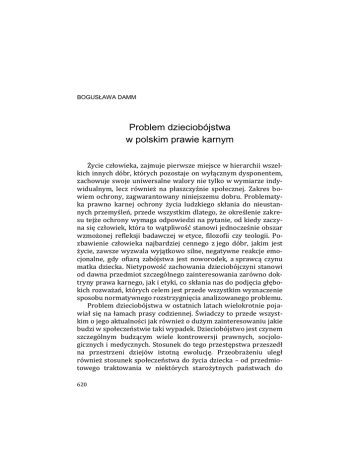 BOGUSŁAWA DAMM Problem dzieciobójstwa w polskim prawie karnym Życie człowieka, zajmuje pierwsze miejsce w hierarchii wszelkich innych dóbr, których pozostaje on wyłącznym dysponentem, zachowuje swoje uniwersalne walory nie tylko w wymiarze indywidualnym, lecz również na płaszczyźnie społecznej. Zakres bowiem ochrony, zagwarantowany niniejszemu dobru. Problematyka prawno karnej ochrony życia ludzkiego skłania do nieustannych przemyśleń, przede wszystkim dlatego, że określenie zakresu tejże ochrony wymaga odpowiedzi na pytanie, od kiedy zaczyna się człowiek, która to wątpliwość stanowi jednocześnie obszar wzmożonej refleksji badawczej w etyce, filozofii czy teologii. Pozbawienie człowieka najbardziej cennego z jego dóbr, jakim jest życie, zawsze wyzwala wyjątkowo silne, negatywne reakcje emocjonalne, gdy ofiarą zabójstwa jest noworodek, a sprawcą czynu matka dziecka. Nietypowość zachowania dzieciobójczyni stanowi od dawna przedmiot szczególnego zainteresowania zarówno doktryny prawa karnego, jak i etyki, co skłania nas do podjęcia głębokich rozważań, których celem jest przede wszystkim wyznaczenie sposobu normatywnego rozstrzygnięcia analizowanego problemu. Problem dzieciobójstwa w ostatnich latach wielokrotnie pojawiał się na łamach prasy codziennej. Świadczy to przede wszystkim o jego aktualności jak również o dużym zainteresowaniu jakie budzi w społeczeństwie taki wypadek. Dzieciobójstwo jest czynem szczególnym budzącym wiele kontrowersji prawnych, socjologicznych i medycznych. Stosunek do tego przestępstwa przeszedł na przestrzeni dziejów istotną ewolucję. Przeobrażeniu uległ również stosunek społeczeństwa do życia dziecka – od przedmiotowego traktowania w niektórych starożytnych państwach do 620 Problem dzieciobójstwa w polskim prawie karnym całkowitej ochrony w czasach współczesnych. Obecnie pozbawienie życia bezbronnego nowonarodzonego dziecka przez matkę często spotyka się z wysokim rygoryzmem i odrzuceniem1. W następstwie zmian światopoglądowych również ustawodawcy zaczęli zajmować stanowisko wobec problemu dzieciobójstwa. Część z państw nie zdecydowała się na wyodrębnienie dzieciobójstwa jako jedyny w swoim rodzaju, inne zaś traktowały dzieciobójstwo jako czyn w typie uprzywilejowanym, a jeszcze inne zaostrzyły odpowiedzialność karną, tworząc typ kwalifikowany. W Polsce dzieciobójstwo zostało uregulowane już w k.k. z 1818 r. Aczkolwiek od samego początku regulacje przestępstwa dzieciobójstwa wzbudzały liczne wątpliwości, dyskusje i spory. Na gruncie przyjętych w k.k. z 1932 r. rozwiązań kontynuowanych w kolejnych polskich kodeksach karnych to jest: kodeksie z 1969 r. i 1997 r., pojawiło się i nadal pojawia wiele niejasności wymagających uszczegółowienia. Kodeks karny z dnia 6 czerwca 1997 roku, w pierwotnym brzmieniu przedstawiał w sposób następujący przestępstwo dzieciobójstwa: „Matka, która zabija noworodka pod wpływem silnego przeżycia związanego z przebiegiem porodu, znacznym zniekształceniem dziecka lub ze szczególną sytuacja osobistą, podlega karze pozbawienia wolności od 3 miesięcy do lat 5”2. Dzieciobójstwem nazywamy zabicie przez matkę jej nowo narodzonego dziecka w okresie porodu i pod wpływem jego przebiegu. W myśl polskiego kodeksu karnego sprawcą dzieciobójstwa może być wyłącznie matka, a jego przedmiotem dziecko 3. Kodeks karny wyodrębnia dzieciobójstwo z ogółu zabójstw i traktuje je jako przestępstwo uprzywilejowane (art. 149 k.k.) By można było 1 K. Marzec, Odrębne scenariusze życiowe kobiet sprawczyń dzieciobójstwa, „Auxilium Socjale” 1998, nr 3–4, s. 9–10. 2 R. Krajewski, Prawne kontrowersje ochrony życia człowieka, Płock 2004, s. 123. 3 J. A. Bartoszewski, J. Halaunbrenner-Lisowska, Dzieciobójstwo. Aspekty prawne, medyczne i społeczne, Warszawa 1974. 621 Bogusława Damm mówić o zabójstwie określonym w artykule 149 k.k. muszą jednocześnie zaistnieć dwa warunki tj.: zabójstwo noworodka przez matkę musi nastąpić w okresie porodu, zabójstwo dziecka przez matkę musi nastąpić pod wpływem przebiegu porodu. Dzieciobójstwo niesie ze sobą wiele negatywnych emocji i spotyka się z nieprzychylnym odbiorem społecznym. Ludzie na ogół nie potrafią lub też nie chcą zrozumieć, dlaczego matka podejmuję decyzję o zabiciu lub porzuceniu własnego dziecka i skazaniu go na pewną śmierć. Należy zatem postawić tezę o wewnątrzrodzinnym charakterze dzieciobójstwa, bowiem większość sprawczyń nie podejmuje ryzyka ujawnienia ciąży – ukrywa ciążę lub też za przyzwoleniem rodziny dopuszcza się zabicia noworodka. W większości przypadków dzieciobójczynie maskują swoją ciążę i na tej podstawie należy postawić kolejną tezę o braku akceptacji ciąży i mającego urodzić się dziecka. W ocenie prawnej Kodeksu karnego możemy wyróżnić dwa rodzaje dokonywania dzieciobójstwa: bierne, czynne. Dzieciobójstwo bierne polega na zaniechaniu udzielenia niezbędnej pomocy noworodkowi, czyli świadome – umyślne dopuszczenie do zgonu noworodka przez niepodwiązanie pępowiny, nienakarmienie i niezabezpieczenie przed działaniami szkodliwych wpływów czynników atmosferycznych4. Z medycznego punktu widzenia obowiązkiem jaki kobieta powinna spełnić po urodzeniu dziecka jest udzielenie pomocy noworodkowi. Sprowadza się to do odcięcia i do podwiązania pępowiny, umycia ciała i owinięcia dziecka w celu ochrony przed zimnem. Niewykonanie tych czynności może być traktowane jako dzieciobójstwo bierne. Z dzieciobójstwem czynnym, mamy do czynienia wówczas, gdy rodząca zadaje niemowlęciu uraz zewnętrzny w zamiarze pozbawienia go życia. Realizacja zamiaru przestępczego przebiega przy żuciu stosukowo typowych sposobów działania – około trzech 4 B. 622 Hołysz, Kryminalistyka, Warszawa 1981, s. 56. Problem dzieciobójstwa w polskim prawie karnym czw