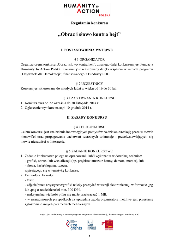 Regulamin konkursu „Obraz i słowo kontra hejt” I. POSTANOWIENIA WSTĘPNE § 1 ORGANIZATOR Organizatorem konkursu „Obraz i słowo kontra hejt”, zwanego dalej konkursem jest Fundacja Humanity In Action Polska. Konkurs jest realizowany dzięki wsparciu w ramach programu „Obywatele dla Demokracji”, finansowanego z Funduszy EOG. § 2 UCZESTNICY Konkurs jest skierowany do młodych ludzi w wieku od 16 do 30 lat. § 3 CZAS TRWANIA KONKURSU 1. Konkurs trwa od 22 września do 30 listopada 2014 r. 2. Ogłoszenie wyników nastąpi 10 grudnia 2014 r. II. ZASADY KONKURSU § 4 CEL KONKURSU Celem konkursu jest znalezienie innowacyjnych pomysłów na działanie/reakcję przeciw mowie nienawiści oraz propagowanie zachowań szerzących tolerancję i przeciwstawiających się mowie nienawiści w Internecie. § 5 ZADANIE KONKURSOWE 1. Zadanie konkursowe polega na opracowaniu lub/i wykonaniu w dowolnej technice: - grafiki, obrazu lub wizualizacji (np. projektu tatuażu z henny, demota, muralu), lub - słowa, hasła/sloganu, tweeta, wpisującego się w tematykę konkursu. 2. Dozwolone formaty: - tekst, - zdjęcia/prace artystyczne/grafiki należy przesyłać w wersji elektronicznej, w formacie .jpg lub .png o rozdzielczości min. 300 DPI, - maksymalna wielkość pliku nie może przekraczać 1 MB, - w uzasadnionych przypadkach za uprzednią zgodą organizatora możliwe jest przesłanie zgłoszenia o innych parametrach technicznych. Projekt jest realizowany w ramach programu Obywatele dla Demokracji, finansowanego z Funduszy EOG 1 § 6 KRYTERIA OCENY 1. Ocenie będzie podlegać: - wartość merytoryczna, - oryginalność pomysłu w zakresie treści i formy, - estetyka wykonania. 1. 2. 3. 4. 5. 1. 2. 3. 4. § 7 PRZEBIEG KONKURSU Warunkiem udziału w konkursie jest wysłanie zadania konkursowego poprzez elektroniczny formularz konkursowy podany przez organizatora w terminie do 30 listopada 2014 r. Do konkursu można zgłaszać wyłącznie prace dotąd nigdzie nie publikowane, nie nagrodzone i nie wyróżnione w innych konkursach. Formularz konkursowy można znaleźć na stronie: https://humanityinaction.wufoo.com/forms/konkurs-fundacji-humanity-in-action-polska/ Organizator nie bierze odpowiedzialności za naruszenie praw autorskich przez uczestników konkursu. Odpowiedzialność ta spoczywa wynika tylko i wyłącznie na uczestnikach konkursu. Rozstrzygnięcie konkursu nastąpi w dniu 10 grudnia 2014 r. Oficjalne ogłoszenie wyników konkursu nastąpi 10 grudnia 2014 r. § 8 NAGRODY Jury konkursu wybiera zwycięskie prace, wyłonione w wyniku głosowania członków Jury. Zwycięskie prace mogą zdobyć pierwsze, drugie, trzecie miejsce lub wyróżnienie. Nagrodami konkursu są 4 tablety multimedialne. Jury może podjąć decyzję o nagrodzeniu większej ilości prac i przyznaniu dodatkowych nagród. III. ODPOWIEDZIAŁNOŚĆ ORGANIZATORA § 9 OPŁATY I PODATKI Organizator nie ponosi odpowiedzialności za jakiekolwiek ewentualne opłaty i podatki, do uiszczenia, których mogą być zobowiązani zwycięzcy konkursu. § 10 ODPOWIEDZIALNOŚĆ ZA PRZESYŁKI POCZTOWE Organizator nie ponosi odpowiedzialności za doręczenia i terminowość korespondencji wysyłanej za pomocą poczty, formularza elektronicznego lub poczty elektronicznej. § 11 DECYZJE JURY Projekt jest realizowany w ramach programu Obywatele dla Demokracji, finansowanego z Funduszy EOG 2 1. Decyzje Jury są ostateczne i nie przysługuje od nich odwołanie. 2. Jury może zrezygnować z przyznania którejkolwiek z nagród w przypadku, gdy uzna, że przedstawione prace nie spełniają wymagań konkursowych. 3. Opinie Jury o poszczególnych pracach nie będą udostępniane. IV. POSTANOWIENIA KOŃCOWE 1. 2. 3. 4. § 12 Wszelkie materiały związane z konkursem, w tym prace konkursowe, przekazane Organizatorowi przez uczestników konkursu nie podlegają zwrotowi. Z chwilą przekazania zadania konkursowego Organizatorowi, uczestnik konkursu przenosi na Organizatora prawo własności wraz z prawami autorskimi. Organizator zastrzega sobie prawo do rozpowszechniania prac konkursowych w mediach (prasie, radiu i telewizji, Internecie) i w innych materiałach promocyjnych konkursu opracowywanych przez Organizatora oraz Operatora Programu „Obywatele dla Demokracji”, jak również materiałach edukacyjnych. Organizator zastrzega sobie prawo do opublikowania imion, nazwisk, zdjęć i innych informacji o zwycięzcach konkursu na stronach internetowych, blogach, newsletterze, stronie na serwisie Facebook oraz Twitter Fundacji Humanity In Action Polska oraz Operatora Programu „Obywatele dla Demokracji”, a także w innych mediach. Poprzez zgłoszenie Organizatorowi chęci udziału w konkursie uczestnik wyraża zgodę na publikacje określone w § 12. § 13 We wszystkich sprawach nieuregulowanych w niniejszym Regulaminie zastosowanie mają przepisy Kodeksu Cywilnego, Ustawy o ochronie danych osobowych oraz Ustawy o prawie autorskim i prawach pokrewnych. § 14 Przystąpienie i udział w konkursie oraz wyrażenie zgody na przetwarzanie danych osobowych oznacza akceptację warunków niniejszego Regulaminu. § 15 Organizator zastrzega sobie możliwość zmiany postanowień Regulaminu. Projekt jest realizowany w ramach programu Obywatele dla Demokracji, finansowanego z Funduszy EOG 3