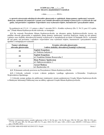 UCHWAŁA NR ....../......./14 RADY MIASTA KĘDZIERZYN-KOŹLE z dnia .................... 2014 r. w sprawie utworzenia odrębnych obwodów głosowania w szpitalach, domu pomocy społecznej i areszcie śledczym, ustalenia ich numerów i granic oraz siedzib obwodowych komisji wyborczych w wyborach do rad gmin, rad powiatów i sejmików województw oraz wyborach wójtów, burmistrzów i prezydentów miast. Na podstawie art.12 § 4 i 11 ustawy z dnia 5 stycznia 2011 r. Kodeks wyborczy (Dz. U. Nr 21, poz.112 z późn. zm.1)) Rada Miasta Kędzierzyn-Koźle uchwala, co następuje: § 1. Na wniosek Prezydenta Miasta Kędzierzyn-Koźle, na obszarze gminy Kędzierzyn-Koźle tworzy się odrębne obwody głosowania w szpitalach, domu pomocy społecznej i areszcie śledczym, ustala się ich numery i granice oraz siedziby obwodowych komisji wyborczych w zarządzonych na dzień 16 listopada 2014 r. wyborach do rad gmin, rad powiatów i sejmików województw oraz wyborach wójtów, burmistrzów i prezydentów miast, zgodnie z następującym wykazem: Numer odrębnego obwodu głosowania 32 33 34 35 Granice obwodu głosowania i adres siedziby obwodowej komisji wyborczej Szpital Zespolony ul. Doktora Judyma 4 Szpital Zespolony ul. Franklina Delano Roosevelta 2 Dom Pomocy Społecznej ul. Dąbrowszczaków 1 Areszt Śledczy ul. Racławicka 10 § 2. Wykonanie uchwały powierza się Prezydentowi Miasta Kędzierzyn-Koźle. § 3. 1. Uchwała wchodzi w życie z dniem podjęcia i podlega ogłoszeniu w Dzienniku Urzędowym Województwa Opolskiego. 2. Uchwała zostaje podana do publicznej wiadomości stronie podmiotowej Urzędu Miasta Kędzierzyn-Koźle w Biuletynie Informacji Publicznej oraz na tablicy ogłoszeń Urzędu Miasta Kędzierzyn-Koźle. 1) Zmiany wymienionej ustawy zostały ogłoszone w Dz. U. Nr 26, poz. 134, Nr 94, poz. 550, Nr 102, poz. 588, Nr 134, poz. 777, Nr 147, poz. 881, Nr 149, poz. 889, Nr 171, poz. 1016 i Nr 217, poz. 1281, z 2012 r. poz. 849,951 i 1529 oraz z 2014 r. poz. 179,180 i 1072. Id: 253232BC-04B9-493D-8EB7-6E12F4C15273. Projekt Strona 1 Uzasadnienie projektu uchwały w sprawie utworzenia odrębnych obwodów głosowania w szpitalach, domu pomocy społecznej i areszcie śledczym, ustalenia ich numerów i granic oraz siedzib obwodowych komisji wyborczych w wyborach do rad gmin, rad powiatów i sejmików województw oraz wyborach wójtów, burmistrzów i prezydentów miast. W myśl art. 12 § 4 ustawy z dnia 5 stycznia 2011 r. Kodeks wyborczy (Dz.U. z Nr 21, poz. 112 z późn.zm.), rada gminy w drodze uchwały, na wniosek prezydenta miasta, zobowiązana jest utworzyć odrębny obwód głosowania w zakładzie opieki zdrowotnej, domu pomocy społecznej, zakładzie karnym i areszcie śledczym oraz w oddziale zewnętrznym takiego zakładu i aresztu, jeżeli w dniu wyborów będzie w nim przebywać co najmniej 15 wyborców. Nieutworzenie obwodu jest możliwe wyłącznie w uzasadnionych przypadkach na wniosek osoby kierującej daną jednostką. Utworzenie odrębnych obwodów głosowania następuje najpóźniej w 35 dniu przed dniem wyborów. Zgodnie z dokumentacją wyborów przeprowadzanych w latach ubiegłych oraz w 2014 r., w Szpitalu Zespolonym przy ul. Doktora Judyma 4, Szpitalu Zespolonym przy ul. Franklina Delano Roosevelta 2, Domu Pomocy Społecznej przy ul. Dąbrowszczaków 1 oraz Areszcie Śledczym przy ul. Racławickiej 10, w dniu wyborów każdorazowo przebywało więcej niż 15 wyborców. Żadna z osób kierujących ww. jednostkami nie złożyła wniosku o nieutworzenie w nich obwodów odrębnych. W świetle przytoczonego wyżej stanu prawnego, w związku zarządzeniem na dzień 16 października 2014 r. wyborów do rad gmin, rad powiatów i sejmików województw oraz wyborów wójtów, burmistrzów i prezydentów miast, podjęcie uchwały w sprawie utworzenia odrębnych obwodów głosowania w zakładach opieki zdrowotnej, domu pomocy społecznej oraz areszcie śledczym na obszarze gminy Kędzierzyn-Koźle winno nastąpić najpóźniej w dniu 12 października 2014 r. Id: 253232BC-04B9-493D-8EB7-6E12F4C15273. Projekt Strona 1