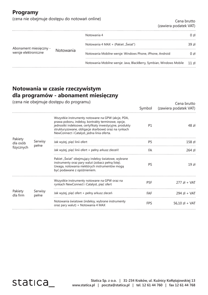 Programy (cena nie obejmuje dostępu do notowań online) Cena brutto (zawiera podatek VAT) 0 zł Notowania 4 Abonament miesięczny wersje elektroniczne 39 zł Notowania 4 MAX + (Pakiet „Świat”) Notowania 0 zł Notowania Mobilne wersje: Windows Phone, iPhone, Android Notowania Mobilne wersje: Java, BlackBerry, Symbian, Windows Mobile 11 zł Notowania w czasie rzeczywistym dla programów - abonament miesięczny (cena nie obejmuje dostępu do programu) Pakiety dla osób fizycznych Pakiety dla firm Serwisy pełne Serwisy pełne Symbol Cena brutto (zawiera podatek VAT) Wszystkie instrumenty notowane na GPW (akcje, PDA, prawa poboru, indeksy, kontrakty terminowe, opcje, jednostki indeksowe, certyfikaty inwestycyjne, produkty strukturyzowane, obligacje skarbowe) oraz na rynkach NewConnect i Catalyst, jedna linia oferta. P1 48 zł Jak wyżej, pięć linii ofert P5 158 zł Jak wyżej, pięć linii ofert + pełny arkusz zleceń! FA 264 zł Pakiet „Świat” obejmujący indeksy światowe, wybrane instrumenty oraz pary walut (zobacz pełną listę). Uwaga, notowania niektórych instrumentów mogą być podawane z opóźnieniem. PS 19 zł Wszystkie instrumenty notowane na GPW oraz na rynkach NewConnect i Catalyst, pięć ofert P5F 277 zł + VAT Jak wyżej, pięć ofert + pełny arkusz zleceń FAF 294 zł + VAT Notowania światowe (indeksy, wybrane instrumenty oraz pary walut) + Notowania 4 MAX FPS 56,10 zł + VAT Statica Sp. z o.o. | 31-234 Kraków, ul. Kuźnicy Kołłątajowskiej 13 www.statica.pl | [email protected] | tel. 12 61 44 760 | fax 12 61 44 768