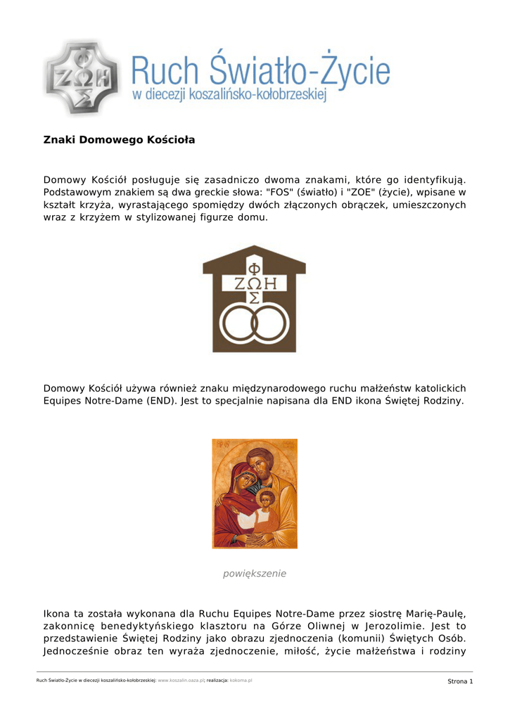 Znaki Domowego Kościoła Domowy Kościół posługuje się zasadniczo dwoma znakami, które go identyfikują. Podstawowym znakiem są dwa greckie słowa: "FOS" (światło) i "ZOE" (życie), wpisane w kształt krzyża, wyrastającego spomiędzy dwóch złączonych obrączek, umieszczonych wraz z krzyżem w stylizowanej figurze domu. Domowy Kościół używa również znaku międzynarodowego ruchu małżeństw katolickich Equipes Notre-Dame (END). Jest to specjalnie napisana dla END ikona Świętej Rodziny. powiększenie Ikona ta została wykonana dla Ruchu Equipes Notre-Dame przez siostrę Marię-Paulę, zakonnicę benedyktyńskiego klasztoru na Górze Oliwnej w Jerozolimie. Jest to przedstawienie Świętej Rodziny jako obrazu zjednoczenia (komunii) Świętych Osób. Jednocześnie obraz ten wyraża zjednoczenie, miłość, życie małżeństwa i rodziny Ruch Światło-Życie w diecezji koszalińsko-kołobrzeskiej: www.koszalin.oaza.pl; realizacja: kokoma.pl Strona 1 chrześcijańskiej, która dąży do świętości i do tworzenia komunii we własnym małżeństwie i rodzinie. Święty Józef przygarnia Maryję. Podanymi sobie rękoma Oboje trzymają i obejmują Chrystusa. Chrystus lewą rękę łączy z Ich rękoma, zaś prawą ręką podniesioną do błogosławieństwa wskazuje na Maryję. Te trzy złączone dłonie wyrażają jedność Chrystusa z parą małżeńską złączoną przysięgą małżeńską. Wyrażają one drogę i zadania małżonków chrześcijańskich: każde z nich z osobna i oboje razem powinni trzymać się Chrystusa. On jest między nami – małżonkami chrześcijańskimi. Uwagę naszą zwraca serdeczność i troskliwość, z jaką święty Józef obejmuje małżonkę. Nasuwa się tu zalecenie Św. Pawła: "Mężowie, miłujcie żony, bo i Chrystus umiłował Kościół i wydał za niego samego siebie". (Ef 4, 25). Ikona ta jest więc obrazem miłości Chrystusa do Kościoła, której uosobieniem ma być każde małżeństwo. "Łuk mój kładę na obłoki, aby był znakiem przymierza między Mną a Ziemią" (Rdz 9, 13). W ikonografii, w sztuce łuk często oznacza obecność Bożą – przymierze Boga z ludźmi. Łuk łączący i jednoczący Maryję i Józefa, całą Świętą Rodzinę, mówi nam o Bożym przymierzu z rodziną, z małżonkami. Może on, jak i cała ikona, symbolizować miłość Boga do swego ludu, która już w Starym Testamencie była zobrazowana przez miłość małżeńską: "Bo małżonkiem twoim Święty Izraela, nazywają Go Bogiem całej ziemi. Zaiste, jak niewiastę porzuconą i zgnębioną na duchu, wezwał Cię Jahwe. I jakby do porzuconej żony młodości mówi Bóg: na krótką chwilę porzuciłem ciebie, ale z ogromną miłością cię przygarnę" (Iz 54, 4-10). Ikona ta mówi: "Bóg jest miłością. Jeżeli miłujemy się wzajemnie, Bóg trwa w nas" (1 J 4, 7-18).O takiej wymowie może świadczyć fakt, że środek koła, którego fragmentem jest ten łuk, znajduje się w miejscu zetknięcia, przytulenia Maryi i Józefa. Żółty i złoty kolor wiążą się ze światłością. Złocisty łuk wyobraża światło Boże, jakim się kierowali Maryja z Józefem w swoim życiu i jakim my w swoim życiu małżeńskim i rodzinnym chcemy się kierować. Żółty kolor nad łukiem jest znakiem światła, którym mamy być jako uczniowie Chrystusa: "Wy jesteście światłem świata. Nie zapala się też światła i nie stawia pod korcem, ale na świeczniku, aby świeciło wszystkim, którzy są w domu. Tak niech świeci wasze światło przed ludźmi, aby widzieli wasze dobre uczynki i chwalili Ojca Waszego, który jest w niebie" (Mt 5, 14-16). Ikona ta przypomina także o zadaniach, które chcemy podejmować, jako należący do Ruchu. Wspólne wyciągnięcie rąk ku Chrystusowi, złączenie się z Nim oraz Jego błogosławieństwo i oparcie Jego ręki na dłoniach małżonków przypomina o modlitwie małżeńskiej i dialogu małżeńskim. O dialogu małżeńskim przypominają też czułość i serdeczność w geście objęcia, przytulenia Maryi i Józefa. Dialog małżeński to miejsce, gdzie z miłością obejmujemy sprawy drugiego człowieka, szczególnie tego najbliższego – współmałżonka i myślimy jak zjednoczyć się bardziej, by być bliżej Boga i siebie, by móc Go razem nieść innym, tym, z którymi dzielimy się naszymi osiągnięciami i trudnościami na spotkaniach. To serdeczne objęcie i łączące się dłonie przypominają o regule życia, gdy swymi czynami, swym postępowaniem obejmujemy także drugiego człowieka i jednoczymy się z nim. Rodzina w łuku Miłości Bożej, w przymierzu z Bogiem przypomina o szczególnym czasie uaktualnienia przymierza Boga z naszą rodzina, jakim jest czas modlitwy rodzinnej. Ruch Światło-Życie w diecezji koszalińsko-kołobrzeskiej: www.koszalin.oaza.pl; realizacja: kokoma.pl Strona 2 Na rękach Maryi i Józefa jest Chrystus. W naszych – jest Słowo Boże, gdy rozważamy je i wprowadzamy w codzienne życie. Oczy Maryi – skierowane do błogosławiącego Jezusa przypominają o modlitwie osobistej. Ikona ta zawiera wiele symboli i znaczeń. Przez to bogactwo, może więc w różny sposób do nas przemawiać. Na pewno wzywa: "Przygarniajcie siebie nawzajem, bo i Chrystus przygarnął was ku chwale Boga" (Rz 15, 7) "Bądźcie i wy doskonali, jak doskonały jest Ojciec wasz niebieski" (Mt 5, 48) Chciejmy usłyszeć te wezwania i realizować je z Bożą pomocą w trudach i radościach codziennego, rodzinnego życia. Ruch Światło-Życie w diecezji koszalińsko-kołobrzeskiej: www.koszalin.oaza.pl; realizacja: kokoma.pl Strona 3