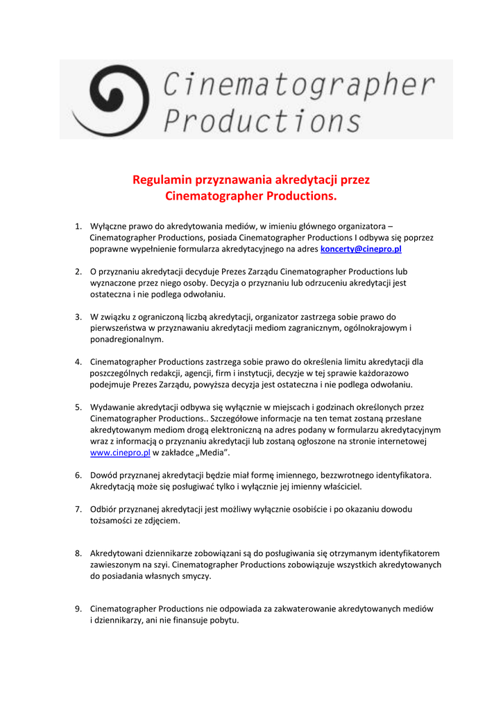 Regulamin przyznania akredytacji Cinematographer Productions