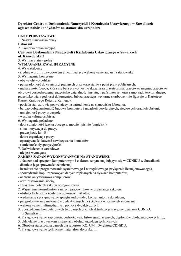 Dyrektor Centrum Doskonalenia Nauczycieli i Kształcenia Ustawicznego w Suwałkach ogłasza nabór kandydatów na stanowisko urzędnicze DANE PODSTAWOWE 1. Nazwa stanowiska pracy Laborant 2. Komórka organizacyjna Centrum Doskonalenia Nauczycieli i Kształcenia Ustawicznego w Suwałkach ul. Kamedulska 3 3. Wymiar etatu – pełny WYMAGANIA KWALIFIKACYJNE 4. Wykształcenie - średnie o profilu zawodowym umoŜliwiające wykonywanie zadań na stanowisku 5. Wymagania konieczne - obywatelstwo polskie, - pełna zdolność do czynności prawnych oraz korzystanie z pełni praw publicznych, - niekaralność (osoba, która nie była prawomocnie skazana za przestępstwa: przeciwko mieniu, przeciwko obrotowi gospodarczemu, przeciwko działalności instytucji państwowych oraz samorządu terytorialnego, przeciwko wiarygodności dokumentów lub za przestępstwo karne skarbowe - nie figuruje w Kartotece Karnej Krajowego Rejestru Karnego), - posiada stan zdrowia pozwalający na zatrudnienie na stanowisku laboranta, laboranta - bardzo dobra znajomość budowy komputera i urządzeń peryferyjnych, sieciowych oraz ich obsługi, - umiejętność pracy w zespole, - wysoka kultura osobista. 6. Wymagania poŜądane - dobra znajomość języka obcego w mowie i piśmie (angielski) - silna motywacja do pracy, - prawo jazdy kat. B, - dobra organizacja pracy, - operatywność, łatwość nawiązywania kontaktów, - sumienność, dyspozycyjność. 7. Doświadczenie zawodowe - nie jest wymagane ZAKRES ZADAŃ WYKONYWANYCH NA STANOWISKU 1. Nadzór nad sprzętem komputerowym i elektronicznym znajdującym się w CDNiKU w Suwałkach - dbanie o jego sprawność techniczną, - instalowanie oprogramowania systemowego i narzędziowego (wyłącznie licencjonowanego), - sporządzanie kopii zapasowych danych zapisanych na dyskach komputerów, - ochrona antywirusowa komputerów, - administrowanie siecią, - zgłaszanie potrzeb zakupu oprogramowań. 2. Wspieranie konsultantów i innych pracowników w organizacji szkoleń: - obsługa techniczna konferencji, kursów i szkoleń, - wydawanie i przyjmowanie sprzętu audio-video konsultantom i doradcom, - przygotowywanie materiałów dydaktycznych na szkolenia w formie elektronicznej, - wykonywanie multimedialnych pomocy dydaktycznych, 3. Sporządzanie komputerowych baz danych oraz ich aktualizacji w rejonie działania CDNiKU w Suwałkach. 4. Przygotowywanie zaproszeń, podziękowań, listów gratulacyjnych, dyplomów okolicznościowych itp., 5. Udzielanie pracownikom instruktaŜu obsługi urządzeń technicznych 6. Obróbka statystyczna danych dla raportów KO, UM i Dyrektora CDNiKU. 7. Przygotowywanie techniczne materiałów do drukarni. 8. Wykonywanie zadań określonych i aktualizowanych dla zajmowanego stanowiska w obowiązujących powszechnie aktach normatywnych oraz zarządzeniach wewnętrznych. WYMAGANE DOKUMENTY 1. List motywacyjny. 2. CV z dokładnym opisem przebiegu pracy zawodowej. 3. Oryginał kwestionariusza osobowego dla osoby ubiegającej się o zatrudnienie. 4. Kserokopie świadectw pracy. 5. Zaświadczenie lekarskie o braku przeciwwskazań zdrowotnych do zajmowanego stanowiska. 6. Kserokopie dokumentów potwierdzających kwalifikacje i wykształcenie zawodowe, 7. Oświadczenie o niekaralności (osoby, którym zostanie zaproponowana praca w CDNiKU będą zobowiązane do dostarczenia zapytania z Krajowego Rejestru Karnego o niekaralności za przestępstwo popełnione umyślnie), 8. Referencje z poprzedniego miejsca pracy. 9. Inne dokumenty o posiadanych kwalifikacjach i umiejętnościach. Dokumenty aplikacyjne: list motywacyjny oraz CV powinny być opatrzone klauzulą: „WyraŜam zgodę na przetwarzanie moich danych osobowych zawartych w ofercie pracy dla potrzeb niezbędnych do realizacji procesu rekrutacji zgodnie z ustawą z dnia 29 sierpnia 1997 r. o ochronie danych osobowych (t.j. z 2002 roku Dz. U. Nr 101, poz. 926 z późn. zm.) oraz ustawą z dnia 21 listopada 2008 r. o pracownikach samorządowych (Dz. U. Nr 223, poz. 1458)”. Warunkiem dopuszczenia kandydata do udziału w dalszym postępowaniu konkursowym jest spełnianie wymogów formalnych określonych w art. 6 ustawy o pracownikach samorządowych. Wymagane dokumenty naleŜy składać w siedzibie Centrum Doskonalenia Nauczycieli i Kształcenia Ustawicznego w Suwałkach 16 – 400 Suwałki, ul. Kamedulska 3 w terminie do 1 kwietnia 2009 r. do godz. 15,00 z dopiskiem na kopercie „Oferta pracy na stanowisko Laborant”. Lista kandydatów spełniających wymagania formalne zostanie ogłoszona w Biuletynie Informacji Publicznej CDNiKU. Zgłoszenia kandydatów złoŜone po terminie, w inny sposób niŜ określony w ogłoszeniu, bez kompletu wymaganych dokumentów, nie będą brane pod uwagę w postępowaniu rekrutacyjnym. ZłoŜonych dokumentów CDNiKU nie zwraca. Oferty niewykorzystane zostaną komisyjnie zniszczone. Informacja o wynikach rekrutacji będzie umieszczona w BIP oraz na tablicy informacyjnej w siedzibie CDNiKU w Suwałkach przy ul. Kamedulska 3. Dodatkowe informacje moŜna uzyskać pod numerem telefonu (087) 5663646 Suwałki, dnia 10 marca 2009 r.