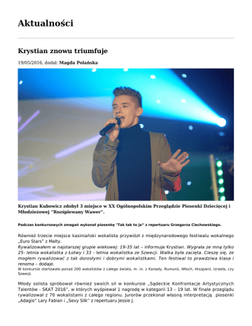 Aktualności Krystian znowu triumfuje 19/05/2016, dodał: Magda Polańska Krystian Kubowicz zdobył 3 miejsce w XX Ogólnopolskim Przeglądzie Piosenki Dziecięcej i Młodzieżowej ”Rozśpiewany Wawer”. Podczas konkursowych zmagań wykonał piosenkę "Tak tak to ja” z repertuaru Grzegorza Ciechowskiego. Również trzecie miejsce kasiniański wokalista przywiózł z międzynarodowego festiwalu wokalnego „Euro Stars” z Malty. Rywalizowałem w najstarszej grupie wiekowej: 19-35 lat – informuje Krystian. Wygrała ze mną tylko 25- letnia wokalistka z Łotwy i 33 - letnia wokalistka ze Szwecji. Walka była zacięta. Cieszę się, że mogłem rywalizować z tak dorosłymi i dobrymi wokalistkami. Ten festiwal to prawdziwa klasa i renoma – dodaje. W konkursie startowało ponad 200 wokalistów z całego świata, m. in. z Kanady, Rumunii, Włoch, Hiszpanii, Izraela, czy Szwecji. Młody solista spróbował również swoich sił w konkursie „Sądeckie Konfrontacje Artystycznych Talentów - SKAT 2016”, w których wyśpiewał 1 nagrodę w kategorii 13 – 19 lat. W finale przeglądu rywalizował z 70 wokalistami z całego regionu. Jurorów przekonał własną interpretacją piosenki „Adagio” Lary Fabian i „Sexy Silk” z repertuaru Jessie J. Magda Polańska