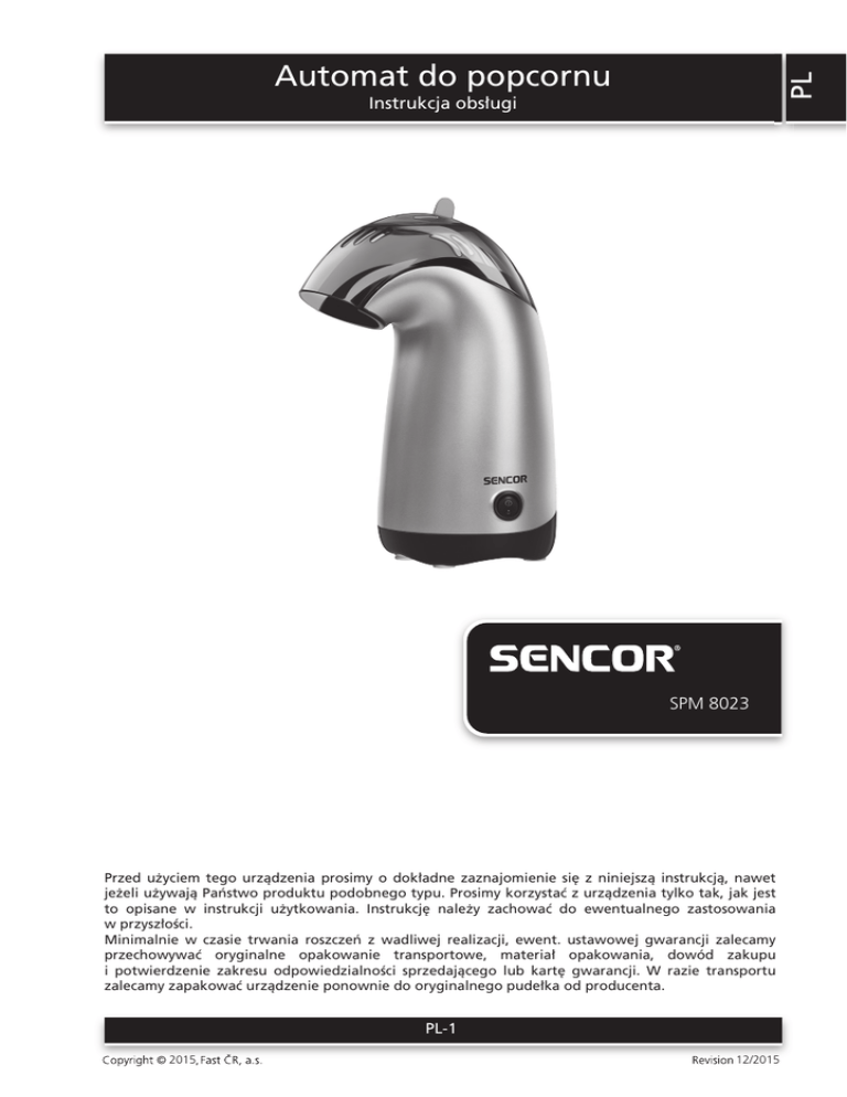 PL Automat do popcornu Instrukcja obsługi SPM 8023 Przed użyciem tego urządzenia prosimy o dokładne zaznajomienie się z niniejszą instrukcją, nawet jeżeli używają Państwo produktu podobnego typu. Prosimy korzystać z urządzenia tylko tak, jak jest to opisane w instrukcji użytkowania. Instrukcję należy zachować do ewentualnego zastosowania w przyszłości. Minimalnie w czasie trwania roszczeń z wadliwej realizacji, ewent. ustawowej gwarancji zalecamy przechowywać oryginalne opakowanie transportowe, materiał opakowania, dowód zakupu i potwierdzenie zakresu odpowiedzialności sprzedającego lub kartę gwarancji. W razie transportu zalecamy zapakować urządzenie ponownie do oryginalnego pudełka od producenta. PL-1 2015 12/2015 PL Automat do popcornu SPM 8023 SPIS TREŚCI ISTOTNE WSKAZÓWKI BEZPIECZEŃSTWA..................................................................................................... 3 OPIS URZĄDZENIA........................................................................................................................................... 6 PRZED PIERWSZYM UŻYCIEM......................................................................................................................... 7 INSTRUKCJE DOTYCZĄCE DAWKOWANIA ZIARN KUKURYDZIANYCH....................................................... 7 OBSŁUGA URZĄDZENIA.................................................................................................................................. 7 KONSERWACJA I CZYSZCZENIE...................................................................................................................... 8 MAGAZYNOWANIE......................................................................................................................................... 9 DANE TECHNICZNE........................................................................................................................................ 10 WSKAZÓWKI I INFORMACJE DOTYCZĄCE POSTĘPOWANIA ZE ZUŻYTYM OPAKOWANIEM.................. 10 LIKWIDACJA ZUŻYTYCH URZĄDZEŃ ELEKTRYCZNYCH I ELEKTRONICZNYCH.......................................... 10 PL-2 2015 12/2015 PL Automat do popcornu SPM 8023 ISTOTNE WSKAZÓWKI BEZPIECZEŃSTWA PROSIMY UWAŻNIE PRZECZYTAĆ I ZACHOWAĆ NA PRZYSZŁOŚĆ. • Z niniejszego urządzenia mogą korzystać dzieci w wieku od 8 lat oraz osoby o obniżonych zdolnościach fizycznych, percepcyjnych i umysłowych lub niewielkim doświadczeniu i wiedzy, o ile jest nad nimi sprawowany nadzór lub zostały one pouczone o korzystaniu z urządzenia w bezpieczny sposób i zdają sobie sprawę z ewentualnego niebezpieczeństwa. Czyszczenia i konserwacji nie mogą wykonywać dzieci poniżej 8 roku życia i o ile nie są pod nadzorem. Urządzenie i jego kabel sieciowy należy przechowywać poza zasięgiem dzieci poniżej 8 roku życia. Dzieci nie powinny się bawić urządzeniem. • Urządzenie jest przeznaczone do użytku w gospodarstwach domowych oraz podobnego rodzaju pomieszczeniach, takich jak: −− aneksy kuchenne przeznaczone dla personelu w sklepach, biurach i innych miejscach pracy; −− pokoje hotelowe lub motelowe i inne pomieszczenia mieszkalne; −− przedsiębiorstwa zapewniające nocleg ze śniadaniem. • Z urządzenia nie korzystaj w środowisku przemysłowym albo na dworze, ani nie stosuj go do innych celów, niż do których jest przeznaczone. • Urządzenie podłączaj wyłącznie do poprawnie uziemionego gniazdka sieciowego. • Przed podłączeniem urządzenia do gniazdka sieciowego upewnij się, czy napięcie podane w tabliczce znamionowej odpowiada napięciu w Twoim gniazdku. Dbaj o to, by przewód sieciowy nie zwisał przez krawędź stołu albo by nie dotykał gorącej powierzchni. Ostrzeżenie: Niniejsze urządzenie nie jest przeznaczone do sterowania za pośrednictwem programatora, zewnętrznego wyłącznika czasowego lub zdalnego sterowania. PL-3 2015 12/2015 PL Automat do popcornu SPM 8023 • Nie odkładaj urządzenia na płytę elektryczną lub gazową ani nie kładź go w pobliżu nich, na skraju płyty roboczej ani na niestabilnym podłożu. Urządzenie należy zawsze umieszczać na stabilnej, równej, suchej powierzchni. • Urządzenie musi zostać umieszczone w odległości minimum 20 cm od firanek, ścian oraz innych materiałów wrażliwych na ciepło. • Korzystaj wyłącznie z akcesoriów dostarczonych z niniejszym urządzeniem. • Przed uruchomieniem urządzenia zawsze upewnij się, że zintegrowana łyżka została zdjęta z wieka. Do komory do produkcji popcornu wsyp ziarna kukurydzy, które przeznaczone są do produkcji popcornu. Nigdy nie wkładaj do niej oleju, masła, margaryny lub innych tłuszczów, soli ani innych przypraw. Jeżeli doszło by do dodania tłuszczu do komory do produkcji popcornu, mogło by dojść do poparzeń lub uszkodzenia urządzenia. • Komory do produkcji popcornu nie napełniaj powyżej ryski MAX, która jest wyznaczona na jej ścianie wewnętrznej. • Podczas używania urządzenia zapewnij dostateczną przestrzeń dla obiegu powietrza nad urządzeniem i wokół niego. Urządzenie zagrzewa się podczas swej pracy. Uważaj, aby nie dotknąć rozgrzanej powierzchni wieka. • Przed jakąkolwiek manipulacją pozostaw urządzenie na co najmniej 5 minut do wystygnięcia. W celu ochrony skóry ręki zalecamy zastosować rękawicę kuchenną. • Podczas pracy nie manipuluj z wiekiem albo miską na masło / dozownikiem do ziarn kukurydzianych, jeżeli miska umieszczona jest na wieku. • Jeżeli dojdzie do uchylenia wieka podczas pracy, bezpiecznik ochronny przerwie pracę urządzenia. PL-4 2015 12/2015 PL Automat do popcornu SPM 8023 • Nie pozostawiaj urządzenia pracować bez przerwy dłużej niż przez 5 minuty. Jeżeli chcesz wyprodukować większą ilość popcornu, przed kolejnym zastosowaniem pozostaw urządzenie ostygnąć przez 10 minut. • Urządzenie zawsze wyłącz i odłącz od gniazdka sieciowego, je