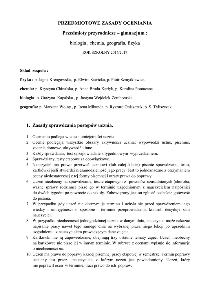 PRZEDMIOTOWE ZASADY OCENIANIA Przedmioty przyrodnicze – gimnazjum : biologia , chemia, geografia, fizyka ROK SZKOLNY 2016/2017 Skład zespołu : fizyka : p. Jagna Krengowska, p. Elwira Sawicka, p. Piotr Szmytkiewicz chemia: p. Krystyna Chinalska, p. Anna Broda-Karłyk, p. Karolina Pomazana biologia: p. Grażyna Kapalska , p. Justyna Wejdelek-Zembrzuska geografia: p. Marzena Wolny , p. Irena Mikunda, p. Ryszard Oniszczuk, p. S. Tyliszczak 1. Zasady sprawdzania postępów ucznia. 1. Ocenianiu podlega wiedza i umiejętności ucznia. 2. Ocenie podlegają wszystkie obszary aktywności ucznia: wypowiedzi ustne, pisemne, zadania domowe, aktywność i inne. 3. Każdy sprawdzian, test są zapowiadane z tygodniowym wyprzedzeniem. 4. Sprawdziany, testy etapowe są obowiązkowe. 5. Nauczyciel ma prawo przerwać uczniowi (lub całej klasie) pisanie sprawdzianu, testu, kartkówki jeśli stwierdzi niesamodzielność jego pracy. Jest to jednoznaczne z otrzymaniem oceny niedostatecznej z tej formy pisemnej i utraty prawa do poprawy. 6. Uczeń nieobecny na sprawdzianie, teście etapowym z powodów uzasadnionych (choroba, ważne sprawy rodzinne) pisze go w terminie uzgodnionym z nauczycielem najpóźniej do dwóch tygodni po powrocie do szkoły. Zobowiązany jest on zgłosić osobiście gotowość do pisania. 7. W przypadku gdy uczeń nie dotrzymuje terminu i uchyla się przed sprawdzeniem jego wiedzy i umiejętności o sposobie i terminie przeprowadzenia kontroli decyduje sam nauczyciel. 8. W przypadku nieobecności jednogodzinnej ucznia w danym dniu, nauczyciel może nakazać napisanie pracy nawet tego samego dnia na wybranej przez niego lekcji po uprzednim uzgodnieniu z nauczycielem prowadzącym dane zajęcia. 9. Kartkówki nie są zapowiedziane, obejmują trzy ostatnie tematy zajęć. Uczeń nieobecny na kartkówce nie pisze jej w innym terminie. W rubryce z ocenami wpisuje się informację o nieobecności nb. 10. Uczeń ma prawo do poprawy każdej pisemnej pracy etapowej w semestrze. Termin poprawy ustalany jest przez nauczyciela, o którym uczeń jest powiadomiony. Uczeń, który nie poprawił ocen w terminie, traci prawo do ich popraw. 11. W przypadku, gdy sprawdzian, test etapowy nie odbędzie się z różnych powodów, ich termin jest automatycznie przesunięty na najbliższą godzinę lekcyjną, chyba, że nauczyciel po ustaleniu z uczniami wyznaczy inny termin. 12. Ocena uzyskana z poprawy sprawdzianu jest wpisana do dziennika obok pierwszego stopnia. 13. Po omówieniu wyników sprawdzianów, testów etapowych uczniowie oddają swoje prace, które przechowywane są do końca roku szkolnego. Zainteresowani rodzice mają prawo wglądu do prac swoich dzieci. 14. Uczeń ma prawo zgłosić 1 raz w semestrze brak przygotowania do lekcji. Należy to zrobić przed lekcją. Późniejsze zgłoszenie nieprzygotowania nie będzie uwzględniane. 15. Uczeń , który uchyla się od oceniania i uczęszczania na zajęcia może być nieklasyfikowany. 16. Ocena roczna oraz ocena semestralna nie jest średnią arytmetyczną ocen, lecz średnią ważoną. 17. Na lekcjach nie wolno używać telefonów komórkowych (również kalkulatora w telefonie). Telefon powinien być schowany i wyłączony/wyciszony. 2. Ustalenie oceny klasyfikacyjnej. 1. Przy ustalaniu oceny semestralnej /końcowej liczona jest średnia ważona. 2. Przy wystawianiu oceny semestralnej/końcowej stosuje się następującą skalę średniej ocen: S- średnia S > 5,35 - celujący 4,75 < S 5,35 - bardzo dobry 3,75 < S ≤ 4,75 - dobry 2,75 < S ≤ 3,75 - dostateczny 1,80 ≤ S ≤ 2,75 - dopuszczający S <1,80 - niedostateczny Waga : 4, 5 - sprawdziany , testy, olimpiady , konkursy 2, 3 - odpowiedź ustna , kartkówka 1 - referaty, zadanie domowe , aktywność, zeszyt ćwiczeń 3. Aby sprawdzian, test etapowy były zaliczone przynajmniej na ocenę dopuszczającą należy zdobyć 40 % wszystkich punktów jakie można było otrzymać z formy pisemnej.. Skala : Dopuszczający Dostateczny Dobry Bardzo dobry 40 %- 50% 51% - 68% 69 % - 76% 77 %- 90% Celujący 91 % - 100% 4. Dopuszcza się podwyższenie oceny semestralnej/końcowej uczniowi przez nauczyciela w wyjątkowych sytuacjach . 3. Ogólne kryteria ocen z przedmiotów przyrodniczych( chemia, fizyka, biologia, geografia). Ocena celująca Ocenę otrzymuje uczeń, który uzyskuje 100% na sprawdzianach i potrafi: samodzielnie rozwiązywać zadania; wykazać się znajomością pojęć, wzorów, map, doświadczeń , oraz umiejętnością ich zastosowania w zadaniach; posługiwać się poprawnym językiem tematycznie związanym z przedmiotem. samodzielnie zdobywać wiedzę; przeprowadzać rozmaite rozumowania dedukcyjne. Ocena bardzo dobra Ocenę otrzymuje uczeń, który opanował pełen zakres wiadomości przewidziany w podstawie programowej nauczania oraz potrafi: sprawnie dokonuje opisów, obliczeń rachunkowych, swobodnie odczytuje diagramy , wykresy- interpretuje; samodzielnie rozwiązywać zadania; wykazać się znajomością wiedzy oraz umiejętnością jej zastosowania w zadaniach; posługiwać się poprawnym językiem np.: chemicznym, fizycznym , geograficznym…; samodzielnie zdobywać wiedzę; przeprowadzać rozmaite rozumowania dedukcyjne. Ocena dobra Ocenę otrzymuje uczeń, który opanował wiadomości i umiejętności przewidziane w podstawie programowej oraz wybrane elementy programu nauczania, a także potrafi: samodzielnie rozwiązać typowe zadania; wykazać się znajomością i rozumieniem poznanych pojęć i twierdzeń oraz algorytmów; posługiwać się językiem tematycznym, który może, zawierać jedynie nieliczne błędy i potknięcia; sprawnie rachować; przeprowadzić proste rozumowania dedukcyjne. Ocena dostateczna Ocenę otrzymuje uczeń, który opanował podstawowe wiadomości i umiejętności przewidziane w podstawie programowej, co pozwala mu na: wykazanie się znajomością i rozumieniem podstawowej wiedzy. stosowanie poznanych wzorów i pojęć w rozwiązywaniu typowych