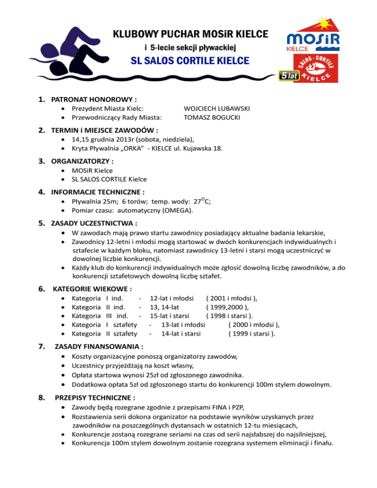 1. PATRONAT HONOROWY : Prezydent Miasta Kielc: Przewodniczący Rady Miasta: WOJCIECH LUBAWSKI TOMASZ BOGUCKI 2. TERMIN i MIEJSCE ZAWODÓW : 14,15 grudnia 2013r (sobota, niedziela), Kryta Pływalnia „ORKA” - KIELCE ul. Kujawska 18. 3. ORGANIZATORZY : MOSiR Kielce SL SALOS CORTILE Kielce 4. INFORMACJE TECHNICZNE : Pływalnia 25m; 6 torów; temp. wody: 27OC; Pomiar czasu: automatyczny (OMEGA). 5. ZASADY UCZESTNICTWA : W zawodach mają prawo startu zawodnicy posiadający aktualne badania lekarskie, Zawodnicy 12-letni i młodsi mogą startować w dwóch konkurencjach indywidualnych i sztafecie w każdym bloku, natomiast zawodnicy 13-letni i starsi mogą uczestniczyć w dowolnej liczbie konkurencji. Każdy klub do konkurencji indywidualnych może zgłosić dowolną liczbę zawodników, a do konkurencji sztafetowych dowolną liczbę sztafet. 6. KATEGORIE WIEKOWE : Kategoria Kategoria Kategoria Kategoria Kategoria I ind. II ind. III ind. I sztafety II sztafety 12-lat i młodsi ( 2001 i młodsi ), 13, 14-lat ( 1999,2000 ), 15-lat i starsi ( 1998 i starsi ). - 13-lat i młodsi ( 2000 i młodsi ), - 14-lat i starsi ( 1999 i starsi ). 7. ZASADY FINANSOWANIA : Koszty organizacyjne ponoszą organizatorzy zawodów, Uczestnicy przyjeżdżają na koszt własny, Opłata startowa wynosi 25zł od zgłoszonego zawodnika. Dodatkowa opłata 5zł od zgłoszonego startu do konkurencji 100m stylem dowolnym. 8. PRZEPISY TECHNICZNE : Zawody będą rozegrane zgodnie z przepisami FINA i PZP, Rozstawienia serii dokona organizator na podstawie wyników uzyskanych przez zawodników na poszczególnych dystansach w ostatnich 12-tu miesiącach, Konkurencje zostaną rozegrane seriami na czas od serii najsłabszej do najsilniejszej, Konkurencja 100m stylem dowolnym zostanie rozegrana systemem eliminacji i finału. 9. PROGRAM ZAWODÓW : Blok I - sobota 14 grudnia 2013r Rozgrzewka Otwarcie zawodów godz. 1400 - 1455 godz. 1500 . Kobiety Mężczyźni 1. 50m st. motylkowym ( kat. I ) 2. 50m st. motylkowym ( kat. I ) 3. 100m st. motylkowym ( kat. II i III ) 4. 100m st. motylkowym ( kat. II i III ) 5. 100m st. grzbietowym 6. 100m st. grzbietowym 7. 100m st. dowolnym - open (eliminacje) 8. 100m st. dowolnym - open (eliminacje) 9. 50m st. klasycznym 10. 50m st. klasycznym 11. 200m st. zmiennym 12. 200m st. zmiennym 13. 400m st. dowolnym 14. 400m st. dowolnym 15. 8x50m st. dowolnym MIX (kat. I szt., kat. II szt.) Blok II - niedziela, 15 grudnia 2013r Rozgrzewka Otwarcie zawodów 16. 18. 20. 7F. 22. 24. 26. 28. godz. 900 - 955 godz. 1000 . Kobiety 50m st. dowolnym ( kat. I ) 200m st. dowolnym ( kat. II i III ) 100m st. klasycznym 100m st. dowolnym ( FINAŁ ) 100m st. zmiennym 50m st. grzbietowym 400m st. zmiennym 4x50m st. zmiennym (kat I szt., kat II szt.) 17. 19. 21. 8F. 23. 25. 27. 29. Mężczyźni 50m st. dowolnym ( kat. I ) 200m st. dowolnym ( kat. II i III ) 100m st. klasycznym 100m st. dowolnym ( FINAŁ ) 100m st. zmiennym 50m st. grzbietowym 400m st. zmiennym 4x50m st. zmiennym (kat I szt., kat II szt.) ) 10. ZGŁOSZENIA DO ZAWODÓW : Zgłoszenia do zawodów w formie elektronicznej ( SPLASH ENTRY EDITOR *.lxf ) należy przesłać na adres: [email protected] w terminie do 10 grudnia 2013r. Zgłoszenie musi zawierać: imię i nazwisko zawodnika; pełną datę urodzenia; nazwę klubu; konkurencje wraz z najlepszym wynikiem uzyskanym w ostatnich 12-tu miesiącach na danym dystansie. Wykreślenia zawodników bez konieczności ponoszenia opłaty startowej możliwe do 12 grudnia 2013r. Zaproszenie, wszystkie komunikaty i informacje dotyczące zawodów oraz wyniki rywalizacji w systemie LIVE publikowane będą na stronach www.omegatiming.pl i www.swimtiming.pl . 11. NAGRODY : Dyplomy za trzy pierwsze miejsca w każdej konkurencji i kategorii wiekowej, Dla 3 pierwszych osób serii finałowych w konkurencji 100m st. dowolnym nagrody finansowe odpowiednio: 1 miejsce - 200zł; 2 m. - 150zł; 3 m. - 100zł, oraz dla wszystkich uczestników serii finałowej upominki i dyplomy, Statuetka dla 3 najlepszych zawodniczek i zawodników w każdej kategorii wiekowej za sumę punktów z trzech najlepszych startów wg punktacji FINA, Puchary dla trzech najlepszych klubów, wg punktacji medalowej. Słodka nagroda dla zwycięskiej sztafety. 12. POSTANOWIENIA KOŃCOWE : Za dyscyplinę zawodników w czasie trwania zawodów odpowiedzialni są trenerzy/kierownicy ekip. Dekoracje odbywać się będą z poślizgiem jednej konkurencji, Organizator zastrzega sobie prawo do wykorzystania zdjęć i materiałów filmowych wykonanych podczas zawodów do umieszczenia na stronie internetowej klubu i w celach promocyjnych klubu. W sprawach nie objętych niniejszym komunikatem decyduje naczelnik zawodów. Zgłoszenie na zawody jest równoznaczne z akceptacją niniejszego regulaminu. 13. ZAKWATEROWANIE I WYŻYWIENIE : HOTEL „MARATON” - Kielce, ul. Boczna 15; tel. 041-3629116; e-mail: [email protected] - koszt noclegu 40zł; HOTEL „STADION” - Kielce, ul. Ściegiennego 8; tel. 041-3687715; e-mail: [email protected] - koszt noclegu 40zł; Restauracja „Olimpijska” - Kielce, ul. Boczna 15 ; p. Ewelina Lech tel. 609-800129; wyżywienie: śniadanie - 15zł, obiad - 20zł, kolacja - 15zł; wyżywienie pełne 48zł. Restauracja „Stadion” - Kielce, ul. Ściegiennego 8 ; p. Ewa Ptak tel. 603-751973, 0413617513; wyżywienie: śniadanie - 15zł, obiad - 20zł, kolacja - 18zł; wyżywienie pełne 53zł. Rezerwacja miejsc noclegowych do dnia 7 grudnia 2013r. Płatności gotówką w miejscu hotelowym i restauracji. 14. OSOBY KONTAKTOWE : W sprawach organizacyjnych: Odnośnie zgłoszeń do zawodów: Piotr Karpiński tel. 507-142 083, Leszek Pustuła tel. 604-757 558. ZAPRASZAMY DO KIELC !