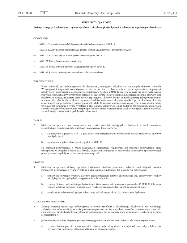 29.11.2008 Dziennik Urzędowy Unii Europejskiej PL INTERPRETACJA KIMSF 1 Zmiany istniejących zobowiązań z tytułu wycofania z eksploatacji, rekultywacji i zobowiązań o podobnym charakterze ODWOŁANIA — MSR 1 Prezentacja sprawozdań finansowych (zaktualizowanego w 2003 r.) — MSR 8 Zasady (polityka) rachunkowości, zmiany wartości szacunkowych i korygowanie błędów — MSR 16 Rzeczowe aktywa trwałe (zaktualizowanego w 2003 r.) — MSR 23 Koszty finansowania zewnętrznego — MSR 36 Utrata wartości aktywów (zaktualizowanego w 2004 r.) — MSR 37 Rezerwy, zobowiązania warunkowe i aktywa warunkowe WPROWADZENIE 1 Wiele jednostek jest zobowiązanych do demontażu, usunięcia i rekultywacji rzeczowych aktywów trwałych. W niniejszej interpretacji zobowiązania te określa się jako „zobowiązania z tytułu wycofania z eksploatacji, rekultywacji i zobowiązania o podobnym charakterze”. Zgodnie z MSR 16 na cenę nabycia lub koszt wytworzenia pozycji rzeczowych aktywów trwałych składają się szacowane koszty demontażu, usunięcia składnika aktywów oraz rekultywacji miejsca, na którym dana pozycja się znajduje, a które to koszty jednostka staje się zobligowana ponieść w momencie nabycia lub na skutek używania składnika rzeczowych aktywów trwałych przez określony okres dla celów innych niż produkcja wyrobów gotowych. MSR 37 zawiera wymogi mówiące o tym, w jaki sposób należy wyceniać zobowiązania z tytułu wycofania z eksploatacji, rekultywacji i inne podobne zobowiązania. Interpretacja zawiera wytyczne dotyczące ujęcia księgowego skutków zmian wartości istniejących zobowiązań z tytułu wycofania z eksploatacji, rekultywacji i podobnych zobowiązań. ZAKRES 2 Niniejsza interpretacja ma zastosowanie do zmian wartości istniejących zobowiązań z tytułu wycofania z eksploatacji, rekultywacji lub podobnych zobowiązań, które zarówno: a) są ujmowane zgodnie z MSR 16 jako część ceny nabycia/kosztu wytworzenia pozycji rzeczowych aktywów trwałych; jak i b) są ujmowane jako zobowiązanie zgodnie z MSR 37. Na przykład zobowiązanie z tytułu wycofania z eksploatacji, rekultywacji lub podobne zobowiązanie może występować w związku z likwidacją fabryki, usunięciem zniszczeń w środowisku naturalnym spowodowanych przez przemysł wydobywczy lub usunięciem urządzeń. PROBLEM 3 Niniejsza interpretacja dotyczy sposobu traktowania skutków poniższych zdarzeń, zmieniających wartość istniejących zobowiązań z tytułu wycofania z eksploatacji, rekultywacji lub podobnych zobowiązań: a) zmiany szacowanego wypływu zasobów reprezentujących korzyści ekonomiczne (np. przepływów środków pieniężnych) niezbędnych do uregulowania zobowiązania; b) zmiany bieżącej rynkowej stopy dyskontowej, która została zdefiniowana w paragrafie 47 MSR 37 (obejmuje zmiany wartości pieniądza w czasie oraz ryzyka związanego z danym zobowiązaniem); oraz c) zwiększenia odzwierciedlającego upływ czasu (określanego także jako odwracanie dyskonta). UZGODNIONE STANOWISKO 4 Zmiany wartości istniejącego zobowiązania z tytułu wycofania z eksploatacji, rekultywacji lub podobnego zobowiązania, które wynikają ze zmiany szacowanego czasu lub kwot wypływu zasobów reprezentujących korzyści ekonomiczne, niezbędnych do uregulowania zobowiązania lub ze zmiany stopy dyskontowej, rozlicza się zgodnie z paragrafami 5–7. 5 Jeżeli odnośny składnik aktywów jest wyceniany zgodnie z modelem ceny nabycia lub kosztu wytworzenia: a) z zastrzeżeniem pkt b), zmiany wartości zobowiązania należy dodać lub odjąć od ceny nabycia lub kosztu wytworzenia odnośnego składnika aktywów w bieżącym okresie; L 320/439 L 320/440 Dziennik Urzędowy Unii Europejskiej PL 6 b) kwota odjęta od ceny nabycia lub kosztu wytworzenia składnika aktywów nie powinna przewyższać jego wartości bilansowej. Jeśli zmniejszenie zobowiązania będzie większe od wartości bilansowej składnika aktywów, kwotę tej nadwyżki należy ująć niezwłocznie w zysku lub stracie; c) jeżeli korekta prowadzi do zwiększenia ceny nabycia lub kosztu wytworzenia składnika aktywów, jednostka powinna rozważyć, czy istnieje przesłanka wskazująca, iż nowa wartość bilansowa składnika aktywów nie jest w pełni odzyskiwalna. Jeżeli taka przesłanka istnieje, jednostka powinna przeprowadzić test na utratę wartości składnika aktywów, dokonując szacunku jego wartości odzyskiwalnej, oraz rozliczyć odpis aktualizujący z tytułu utraty wartości zgodnie z MSR 36. Jeżeli odnośny składnik aktywów jest wyceniany zgodnie z modelem przeszacowania: a) zmiany wartości zobowiązania powodują zmianę nadwyżki lub straty z przeszacowania wcześniej ujętej dla tego składnika aktywów, dlatego: (i) zmniejszenie zobowiązania (z zastrzeżeniem pkt b)) bezpośrednio zwiększa nadwyżkę z przeszacowania ujętą w kapitale własnym, z wyjątkiem sytuacji, gdy zostaje ujęte w zysku lub stracie w stopniu, w jakim odwraca stratę z przeszacowania tego składnika aktywów, która wcześniej została ujęta w zysku lub stracie; (ii) zwiększenie zobowiązania należy ująć w zysku lub stracie, chyba że w kapitale własnym wykazana jest nadwyżka z aktualizacji wyceny odnośnego składnika aktywów i wówczas zwiększenie zobowiązania pomniejsza tę nadwyżkę; b) w przypadku gdy zmniejszenie zobowiązania przewyższa wartość bilansową, która zostałaby ujęta, gdyby składnik aktywów był wykazywany w oparciu o model ceny nabycia lub kosztu wytworzenia, nadwyżkę należy niezwłocznie ująć w zysku lub stracie; c) zmiana wartości zobowiązania może wskazywać, że składnik aktywów powinien zostać przeszacowany w celu zapewnienia, iż wartość bilansowa nie różni się w sposób istotny od jego wartości godziwej ustalonej na dzień bilansowy. Wszelkie takie przeszacowania należy uwzględnić przy ustalaniu kwot, które zostaną odniesione na zysk lub stratę 