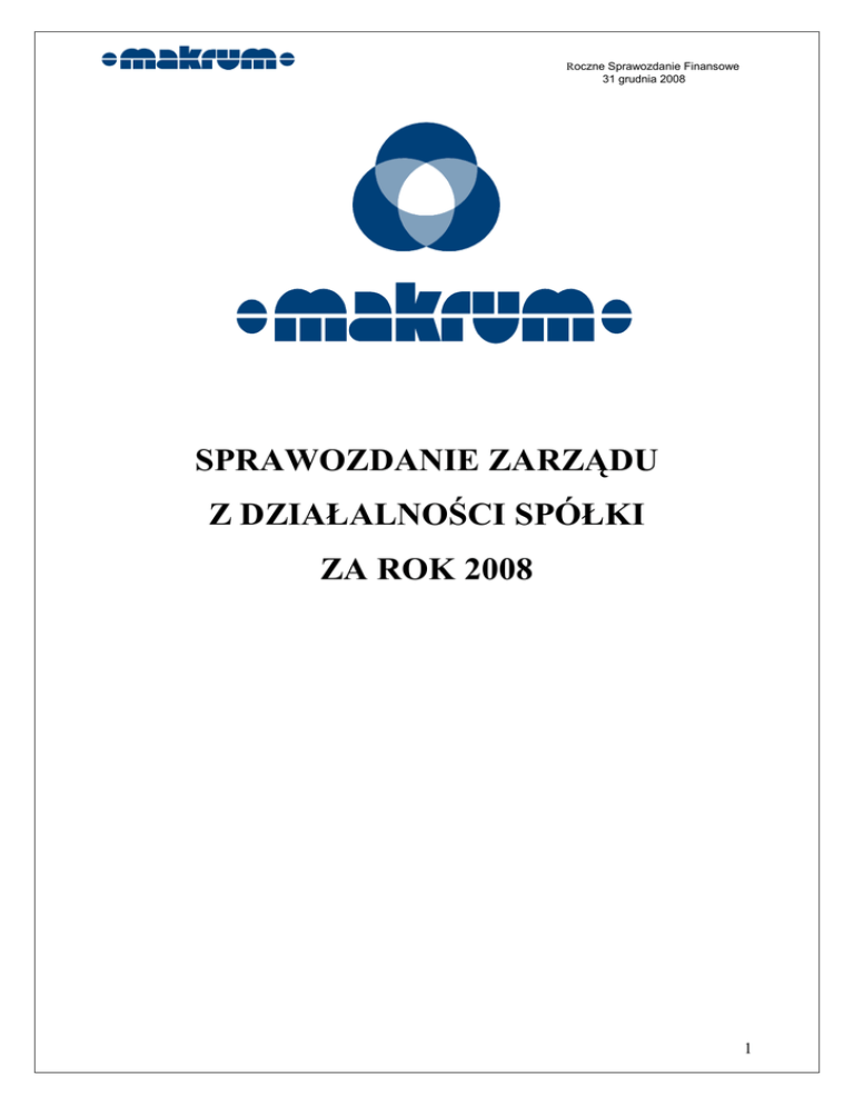 Roczne Sprawozdanie Finansowe 31 grudnia 2008 SPRAWOZDANIE ZARZĄDU Z DZIAŁALNOŚCI SPÓŁKI ZA ROK 2008 1 Roczne Sprawozdanie Finansowe 31 grudnia 2008 SPIS TREŚCI SPIS TREŚCI ___________________________________________________________________________ 2 1. OMÓWIENIE PODSTAWOWYCH WIELKOŚCI EKONOMICZNO-FINANSOWYCH ZA 2008 ROK. _____________________________________________________________________________ 4 1.1 CHARAKTERYSTYKA SPRZEDAśY I ŹRÓDEŁ ZAOPATRZENIA __________________________________ 4 1.1.1 Ogólna charakterystyka sprzedaŜy _____________________________________________ 4 1.1.2 SprzedaŜ krajowa _____________________________________________________________ 6 1.1.3 SprzedaŜ eksportowa _________________________________________________________ 6 1.1.4 Źródła zaopatrzenia ___________________________________________________________ 7 1.2 WYNIKI FINANSOWE __________________________________________________________________ 7 1.2.1 Rachunek wyników ___________________________________________________________ 7 1.2.2 Bilans _______________________________________________________________________ 11 1.2.3. Przepływy pienięŜne _________________________________________________________ 13 1.2.4 Analiza Wskaźnikowa ________________________________________________________ 14 2. OPIS ISTOTNYCH CZYNNIKÓW RYZYKA I ZAGROśEŃ. ______________________________ 16 3. OŚWIADCZENIE O STOSOWANIU ŁADU KORPORACYJNEGO. _______________________ 17 3.1 DEKLARACJA ŁADU KORPORACYJNEGO ________________________________________________ 17 3.2 AKCJONARIAT SPÓŁKI ______________________________________________________________ 20 3.3 OPIS SPOSOBU DZIAŁANIA W ALNEGO ZGROMADZENIA I JEGO ZASADNICZYCH UPRAWNIEŃ ORAZ PRAW AKCJONARIUSZY I SPOSOBU ICH WYKONYWANIA __________________________________________ 21 3.4 SKŁAD OSOBOWY WRAZ ZE ZMIANAMI ORAZ ZASADY DZIAŁANIA ORGANÓW ZARZĄDZAJĄCYCH I NADZORCZYCH SPÓŁKI ______________________________________________________________ 23 3.5 ZASADY ZMIANY STATUTU ___________________________________________________________ 26 3.6 OPIS PODSTAWOWYCH CECH STOSOWANYCH W SPÓŁCE SYSTEMÓW KONTROLI WEWNĘTRZNEJ I ZARZĄDZANIA RYZYKIEM W ODNIESIENIU DO PROCESU SPORZĄDZANIA SPRAWOZDAŃ FINANSOWYCH. 26 4. POSTĘPOWANIA TOCZĄCE SIĘ PRZED SĄDEM, ORGANEM WŁAŚCIWYM DLA POSTĘPOWANIA ARBITRAśOWEGO LUB ORGANEM ADMINISTRACJI PUBLICZNEJ. _ 27 5. INFORMACJE O ZAWARTYCH UMOWACH ZNACZĄCYCH DLA DZIAŁALNOŚCI SPÓŁKI. 27 5.1 UMOWY ZNACZĄCE ZAWARTE PRZEZ SPÓŁKĘ W 2008 ROKU. _______________________________ 27 5.2 UMOWY ZNACZĄCE ZAWARTE PRZEZ SPÓŁKĘ PO DNIU BILANSOWYM. _________________________ 30 6. INFORMACJA O POWIĄZANIACH ORGANIZACYJNYCH LUB KAPITAŁOWYCH SPÓŁKI Z INNYMI PODMIOTAMI. ____________________________________________________________ 31 7. OPIS ISTOTNYCH TRANSAKCJI Z PODMIOTAMI POWIĄZANYMI NA WARUNKACH INNYCH NIś RYNKOWE. __________________________________________________________ 32 8. INFORMACJE O ZACIĄGNIĘTYCH I WYPOWIEDZIANYCH W DANYM ROKU OBROTOWYM UMOWACH DOTYCZĄCYCH KREDYTÓW I POśYCZEK ______________________________ 32 9. INFORMACJA O UDZIELONYCH POśYCZKACH._____________________________________ 32 10. INFORMACJA O UDZIELONYCH I OTRZYMANYCH W DANYM ROKU OBROTOWYM PORĘCZEŃ I GWARANCJI.________________________________________________________ 33 11. OBJAŚNIENIE RÓśNIC POMIĘDZY WYNIKAMI FINANSOWYMI WYKAZANYMI W RAPORCIE ROCZNYM A WCZEŚNIEJ PUBLIKOWANYMI PROGNOZAMI WYNIKÓW NA DANY ROK. ______________________________________________________________________ 33 12. OCENA DOTYCZĄCA ZARZĄDZANIA ZASOBAMI FINANSOWYMI. ____________________ 35 13. OCENA MOśLIWOŚCI REALIZACJI ZAMIERZEŃ INWESTYCYJNYCH__________________ 35 13.1 INWESTYCJE W RZECZOWE ŚRODKI TRWAŁE ORAZ W WARTOŚCI NIEMATERIALNE I PRAWNE W OBECNIE POSIADANYCH LOKALIZACJACH. _______________________________________________________ 35 13.2 AKWIZYCJE ______________________________________________________________________ 36 14. . OCENA CZYNNIKÓW I NIETYPOWYCH ZDARZEŃ MAJĄCYCH WPŁYW NA WYNIK SPÓŁKI ZA DANY ROK OBROTOWY. ______________________________________________________ 36 2 Roczne Sprawozdanie Finansowe 31 grudnia 2008 15. CHARAKTERYSTYKA ZEWNĘTRZNYCH I WEWNĘTRZNYCH CZYNNIKÓW ISTOTNYCH DLA ROZWOJU SPÓŁKI. __________________________________________________________ 36 15.1 CZYNNIKI ZEWNĘTRZNE_____________________________________________________________ 36 15.2 CZYNNIKI WEWNĘTRZNE ____________________________________________________________ 37 16. ZMIANY W PODSTAWOWYCH ZASADACH ZARZĄDZANIA PRZEDSIĘBIORSTWEM SPÓŁKI __________________________________________________________________________ 38 17. UMOWY ZAWARTE POMIĘDZY SPÓŁKĄ A OSOBAMI ZARZĄDZAJĄCYMI, PRZEWIDUJĄCE REKOMPENSATĘ W PRZYPADKU ICH REZYGNACJI LUB ZWOLNIENIA Z ZAJMOWANEGO STANOWISKA BEZ WAśNEJ PRZYCZYNY LUB GDY ICH ODWOŁANIE LUB ZWOLNIENIE NASTĘPUJE Z POWODU POŁĄCZENIA SPÓŁKI PRZEZ PRZEJĘCIE. 38 18. WARTOŚĆ WYNAGRODZEŃ DLA OSÓB ZARZĄDZAJĄCYCH I NADZORUJĄCYCH SPÓŁKĘ. ________________________________________________________________________ 39 18.1 W ARTOŚĆ WYNAGRODZEŃ DLA OSÓB ZARZĄDZAJĄCYCH SPÓŁKĄ __________________________ 39 18.2 W ARTOŚĆ WYNAGRODZEŃ DLA OSÓB NADZORUJACYCH SPÓŁKĘ ___________________________ 39 19. AKCJE I UDZIAŁY SPÓŁKI ORAZ JEDNOSTEK POWIĄZANYCH BĘDĄCE W POSIADANIU OSÓB ZARZĄDZAJĄCYCH I NADZORUJĄCYCH SPÓŁKĘ ___________________________ 39 20. INFORMACJE O ZNANYCH SPÓŁCE UMOWACH, W WYNIKU KTÓRYCH MOGĄ W PRZYSZŁOŚCI NASTĄPIĆ ZMIANY W PROPORCJACH POSIADANYCH AKCJI PRZEZ DOTYCHCZASOWYCH AKCJONARIUSZY __________________________________________ 40 21. INFORMACJE O SYSTEMIE KONTROLI PROGRAMÓW AKCJI PRACOWNICZYCH. _____ 40 22. INFORMACJE O PODMIOCIE UPRAWNIONYM DO BADANIA SPRAWOZDAŃ FINANSOWYCH: _________________________________________________________________ 40 . 3 Roczne Sprawozdanie Finansowe 31 grudnia 2008 1. Omówienie podstawow