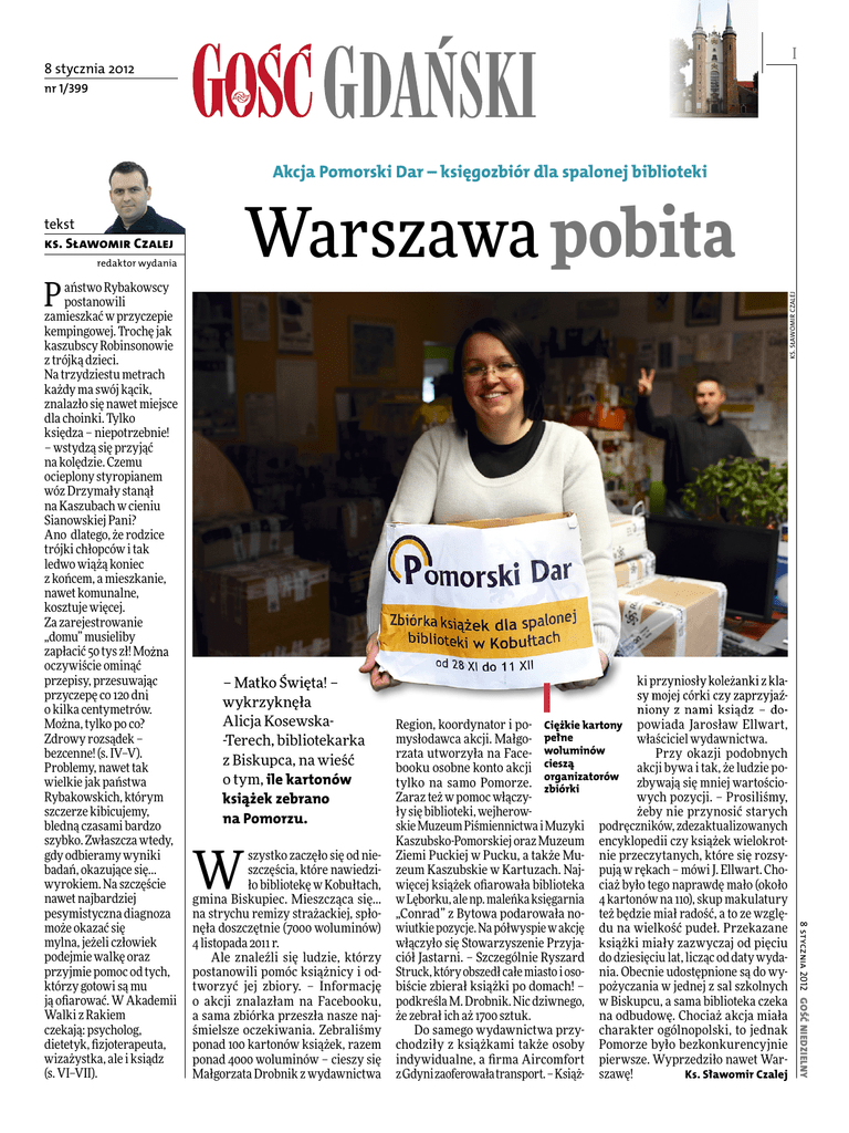 I 8 stycznia 2012 nr 1/ Akcja Pomorski Dar – księgozbiór dla spalonej biblioteki Warszawa pobita tekst ks. Sławomir Czalej redaktor wydania – Matko Święta! – wykrzyknęła Alicja Kosewska-Terech, bibliotekarka z Biskupca, na wieść o tym, ile kartonów książek zebrano na Pomorzu. W szystko zaczęło się od nieszczęścia, które nawiedziło bibliotekę w Kobułtach, gmina Biskupiec. Mieszcząca się... na strychu remizy strażackiej, spłonęła doszczętnie (7000 woluminów) 4 listopada 2011 r. Ale znaleźli się ludzie, którzy postanowili pomóc książnicy i odtworzyć jej zbiory. – Informację o akcji znalazłam na Facebooku, a sama zbiórka przeszła nasze najśmielsze oczekiwania. Zebraliśmy ponad 100 kartonów książek, razem ponad 4000 woluminów – cieszy się Małgorzata Drobnik z wydawnictwa ki przyniosły koleżanki z klasy mojej córki czy zaprzyjaźniony z nami ksiądz – doRegion, koordynator i po- Ciężkie kartony powiada Jarosław Ellwart, mysłodawca akcji. Małgo- pełne właściciel wydawnictwa. rzata utworzyła na Face- woluminów Przy okazji podobnych booku osobne konto akcji cieszą akcji bywa i tak, że ludzie poorganizatorów zbywają się mniej wartościotylko na samo Pomorze. zbiórki Zaraz też w pomoc włączywych pozycji. – Prosiliśmy, żeby nie przynosić starych ły się biblioteki, wejherowskie Muzeum Piśmiennictwa i Muzyki podręczników, zdezaktualizowanych Kaszubsko-Pomorskiej oraz Muzeum encyklopedii czy książek wielokrotZiemi Puckiej w Pucku, a także Mu- nie przeczytanych, które się rozsyzeum Kaszubskie w Kartuzach. Naj- pują w rękach – mówi J. Ellwart. Chowięcej książek ofiarowała biblioteka ciaż było tego naprawdę mało (około w Lęborku, ale np. maleńka księgarnia 4 kartonów na 110), skup makulatury „Conrad” z Bytowa podarowała no- też będzie miał radość, a to ze wzglęwiutkie pozycje. Na półwyspie w akcję du na wielkość pudeł. Przekazane włączyło się Stowarzyszenie Przyja- książki miały zazwyczaj od pięciu ciół Jastarni. – Szczególnie Ryszard do dziesięciu lat, licząc od daty wydaStruck, który obszedł całe miasto i oso- nia. Obecnie udostępnione są do wybiście zbierał książki po domach! – pożyczania w jednej z sal szkolnych podkreśla M. Drobnik. Nic dziwnego, w Biskupcu, a sama biblioteka czeka że zebrał ich aż 1700 sztuk. na odbudowę. Chociaż akcja miała Do samego wydawnictwa przy- charakter ogólnopolski, to jednak chodziły z książkami także osoby Pomorze było bezkonkurencyjnie indywidualne, a firma Aircomfort pierwsze. Wyprzedziło nawet Warz Gdyni zaoferowała transport. – Książ- szawę! Ks. Sławomir Czalej 8 stycznia 2012 Gość NiedzielNy aństwo Rybakowscy postanowili zamieszkać w przyczepie kempingowej. Trochę jak kaszubscy Robinsonowie z trójką dzieci. Na trzydziestu metrach każdy ma swój kącik, znalazło się nawet miejsce dla choinki. Tylko księdza – niepotrzebnie! – wstydzą się przyjąć na kolędzie. Czemu ocieplony styropianem wóz Drzymały stanął na Kaszubach w cieniu Sianowskiej Pani? Ano dlatego, że rodzice trójki chłopców i tak ledwo wiążą koniec z końcem, a mieszkanie, nawet komunalne, kosztuje więcej. Za zarejestrowanie „domu” musieliby zapłacić 50 tys zł! Można oczywiście ominąć przepisy, przesuwając przyczepę co 120 dni o kilka centymetrów. Można, tylko po co? Zdrowy rozsądek – bezcenne! (s. IV–V). Problemy, nawet tak wielkie jak państwa Rybakowskich, którym szczerze kibicujemy, bledną czasami bardzo szybko. Zwłaszcza wtedy, gdy odbieramy wyniki badań, okazujące się… wyrokiem. Na szczęście nawet najbardziej pesymistyczna diagnoza może okazać się mylna, jeżeli człowiek podejmie walkę oraz przyjmie pomoc od tych, którzy gotowi są mu ją ofiarować. W Akademii Walki z Rakiem czekają: psycholog, dietetyk, fizjoterapeuta, wizażystka, ale i ksiądz (s. VI–VII). ks. sławomir Czalej P gość Gdański II Odszedł kapelan gdyńskiej „Solidarności” Burzenie Neptuna nasz Wrzeszcz. Nie ma starego Cristala, księgarni obok, teraz nie będzie Neptuna – mówi pani Anna, emerytka, która w mroźny poranek przyglądała się rozbiórce. – Ciuchy tu sobie kupowałem. To jakby coś prywatnego nam zabierali – dodaje pan Zygmunt. W miejscu dawnego PDT do końca 2014 roku powstanie kilkunastopiętrowy wieżowiec. ciem agnieszka skowrońska Gdańsk-Wrzeszcz. Kilka dni temu rozpoczęła się rozbiórka budynku dawnego Państwowego Domu Towarowego Neptun, który w latach 90. XX wieku został przemianowany na Galerię Centrum. Pedet z rozrzewnieniem wspominają mieszkańcy Gdyni. – Pralkę tu kiedyś z mężem wystaliśmy. Miłe wspomnienia w zasadzie. Szkoda, że odchodzi Gdynia. W wieku 78 lat 18 grudnia zmarł o.Edward Ryba, redemptorysta. Uroczystości pogrzebowe, które odbyły się w czwartek 22 grudnia na Cmentarzu Witomińskim pod przewodnictwem biskupa Ryszarda Kasyny, zgromadziły rzesze wiernych. – Dzięki Tobie w kościele portowym biło serce „Solidarności” i nasze robotnicze serca krzepiły się nadzieją – żegnał zmarłego Janusz Śniadek, poseł na Sejm RP. O.Edward Ryba w czasie sierpniowego strajku w 1980 roku, jako proboszcz parafii pw. Matki Bożej Nieustającej Pomocy i św. Piotra Rybaka, odprawiał codziennie Msze święte w Stoczni im. Komuny Paryskiej. W stanie wojennym opiekował się internowanymi i represjonowanymi, organizował pomoc dla potrzebujących i głosił patriotyczne kazania. Po latach pracy na placówkach zakonnych w Mierzynie i Szczecinie powrócił do Gdyni w roku 1995. Do końca życia bliscy mu byli ludzie pracy, którzy darzyli go wielkim szacunkiem. Za zaangażowanie społeczne i odwagę w 2009 śp. Lech Kaczyński, prezydent RP, uhonorował o. Rybę Krzyżem Komandorskim Orderu Odrodzenia Polski. ak Gość Niedzielny 8 stycznia 2012 ks. Sławomir Czalej fotofakty Port w Pucku, grudzień 2011. Tegoroczna aur