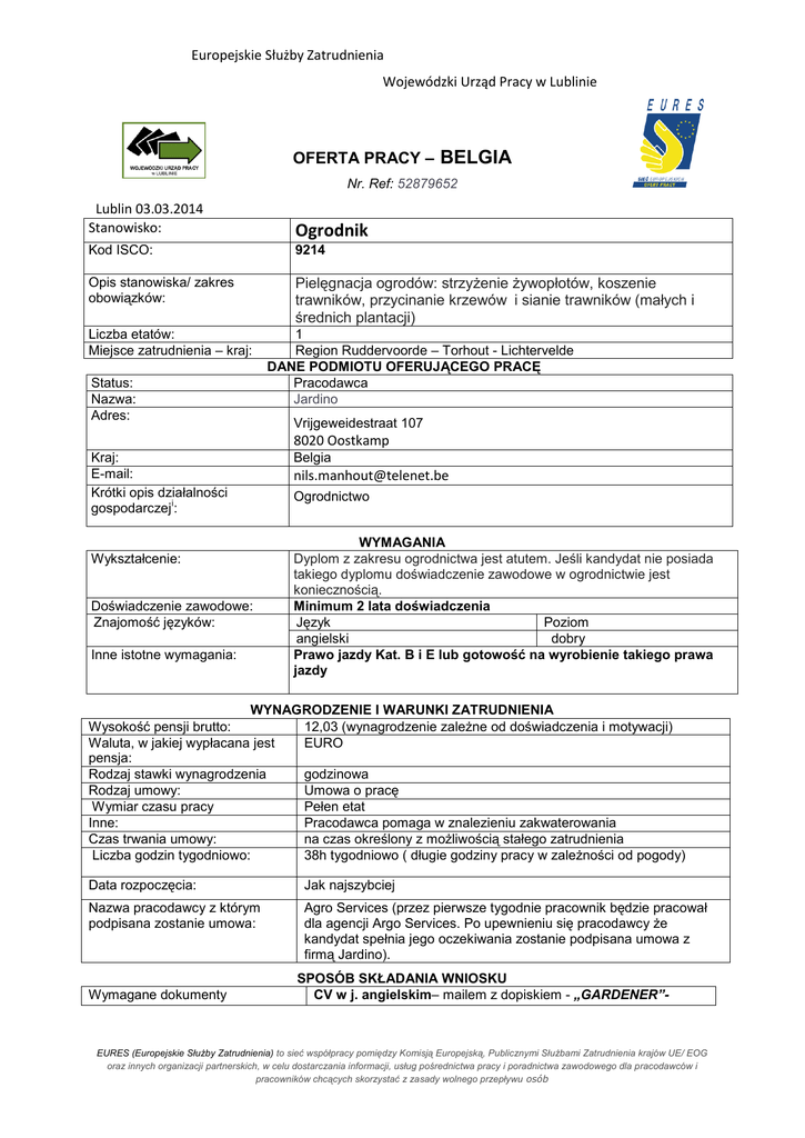Europejskie Służby Zatrudnienia Wojewódzki Urząd Pracy w Lublinie OFERTA PRACY – BELGIA Nr. Ref: 52879652 Lublin 03.03.2014 Stanowisko: Ogrodnik Kod ISCO: 9214 Opis stanowiska/ zakres obowiązków: Pielęgnacja ogrodów: strzyżenie żywopłotów, koszenie trawników, przycinanie krzewów i sianie trawników (małych i średnich plantacji) Liczba etatów: Miejsce zatrudnienia – kraj: Status: Nazwa: Adres: 1 Region Ruddervoorde – Torhout - Lichtervelde DANE PODMIOTU OFERUJĄCEGO PRACĘ Pracodawca Jardino Vrijgeweidestraat 107 8020 Oostkamp Kraj: E-mail: Krótki opis działalności i gospodarczej : Wykształcenie: Doświadczenie zawodowe: Znajomość języków: Inne istotne wymagania: Belgia [email protected] Ogrodnictwo WYMAGANIA Dyplom z zakresu ogrodnictwa jest atutem. Jeśli kandydat nie posiada takiego dyplomu doświadczenie zawodowe w ogrodnictwie jest koniecznością. Minimum 2 lata doświadczenia Język Poziom angielski dobry Prawo jazdy Kat. B i E lub gotowość na wyrobienie takiego prawa jazdy WYNAGRODZENIE I WARUNKI ZATRUDNIENIA Wysokość pensji brutto: 12,03 (wynagrodzenie zależne od doświadczenia i motywacji) Waluta, w jakiej wypłacana jest EURO pensja: Rodzaj stawki wynagrodzenia godzinowa Rodzaj umowy: Umowa o pracę Wymiar czasu pracy Pełen etat Inne: Pracodawca pomaga w znalezieniu zakwaterowania Czas trwania umowy: na czas określony z możliwością stałego zatrudnienia Liczba godzin tygodniowo: 38h tygodniowo ( długie godziny pracy w zależności od pogody) Data rozpoczęcia: Jak najszybciej Nazwa pracodawcy z którym podpisana zostanie umowa: Agro Services (przez pierwsze tygodnie pracownik będzie pracował dla agencji Argo Services. Po upewnieniu się pracodawcy że kandydat spełnia jego oczekiwania zostanie podpisana umowa z firmą Jardino). Wymagane dokumenty SPOSÓB SKŁADANIA WNIOSKU CV w j. angielskim– mailem z dopiskiem - „GARDENER”- EURES (Europejskie Służby Zatrudnienia) to sieć współpracy pomiędzy Komisją Europejską, Publicznymi Służbami Zatrudnienia krajów UE/ EOG oraz innych organizacji partnerskich, w celu dostarczania informacji, usług pośrednictwa pracy i poradnictwa zawodowego dla pracodawców i pracowników chcących skorzystać z zasady wolnego przepływu osób Język, w którym muszą być sporządzone przedkładane dokumenty: Do kogo należy wysłać dokumenty: Dane teleadresowe doradcy EURES lub przedstawiciela pracodawcy: Termin przedkładania podań o pracę / zakończenia ważności oferty: CV w języku angielskim. Dokumenty przysłane w języku polskim nie będą rozpatrywane. Do pracodawcy: [email protected] oraz do wiadomości doradcy w Belgii: [email protected] Annelies Thomas Euresadviser VDAB, Dienst Eures Koning Albert I-laan, 1.2. 8200 Brugge Belgium e-mail: [email protected] tel. + 32 (0) 50 44 04 97 fax +32 (0) 50 44 04 81 http://www.workinflanders.be WAŻNOŚĆ DO ODWOŁANIA Uprzejmie informujemy, że Agencja Pracy Tymczasowej ARGO SERVICES oświadczyła, że działa zgodnie przepisami prawa obowiązującymi na terenie Belgii. Uprzejmie informujemy, że skontaktujemy się wyłącznie z wybranymi kandydatami. UWAGA: Umowa z zagranicznym pracodawcą zostanie zawarta zgodnie z prawem kraju zatrudnienia. Oznacza to, że wszystkie roszczenia odnośnie do warunków, które obejmuje umowa, można kierować wyłącznie do odpowiedniego sądu w kraju zatrudnienia. Publiczne służby zatrudnienia (EURES) nie mogą pośredniczyć ani reprezentować pracownika w sądzie kraju zatrudnienia w przypadku sporu z pracodawcą. Publiczne służby zatrudnienia (EURES) dokładają wszelkich starań, aby zapewnić rzetelność i wiarygodność ofert pracy zgłoszonych w lokalnym urzędzie pracy. Należy wyjaśnić, że oferta pracy została zgłoszona przez stronę trzecią i EURES nie odpowiada za ewentualne rozbieżności między warunkami pracy określonymi w ofercie pracy i warunkami oferowanymi przez potencjalnego pracodawcę. Publiczne służby zatrudnienia (EURES) informują, że będą zbierać, przetwarzać i przekazywać potencjalnym pracodawcom zgodnie z przepisami dotyczącymi ochrony danych osobowych wszystkie dane osobowe dostarczone przez osoby poszukujące pracy. i Informacje o firmie, takie jak: status prawny, sektor, typ działalności, rodzaj produktów lub świadczonych usług, data rozpoczęcia działalności gospodarczej, liczba pracowników itp. EURES (Europejskie Służby Zatrudnienia) to sieć współpracy pomiędzy Komisją Europejską, Publicznymi Służbami Zatrudnienia krajów UE/ EOG oraz innych organizacji partnerskich, w celu dostarczania informacji, usług pośrednictwa pracy i poradnictwa zawodowego dla pracodawców i pracowników chcących skorzystać z zasady wolnego przepływu osób