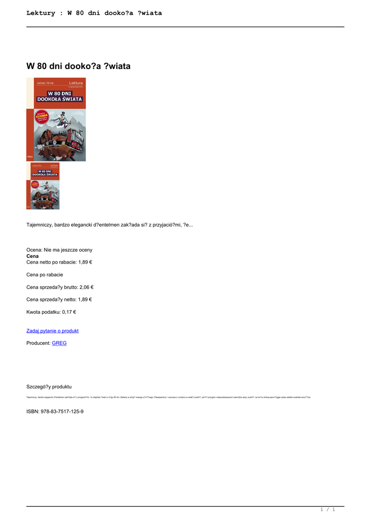 Lektury : W 80 dni dooko?a ?wiata W 80 dni dooko?a ?wiata Tajemniczy, bardzo elegancki d?entelmen zak?ada si? z przyjació?mi, ?e... Ocena: Nie ma jeszcze oceny Cena Cena netto po rabacie: 1,89 € Cena po rabacie Cena sprzeda?y brutto: 2,06 € Cena sprzeda?y netto: 1,89 € Kwota podatku: 0,17 € Zadaj pytanie o produkt Producent: GREG Szczegó?y produktu Tajemniczy, bardzo elegancki d?entelmen zak?ada si? z przyjació?mi, ?e objedzie ?wiat w ci?gu 80 dni. Zabiera w drog? nowego s?u??cego, Passepartout, i wyrusza z Londynu w wielk? podró?, pe?n? przygód, niespodziewanych zawrotów akcji, podró?, na ko?cu której pana Fogga czeka wielkie osobiste szcz??cie. ISBN: 978-83-7517-125-9 1 / 1 Powered by TCPDF (www.tcpdf.org)