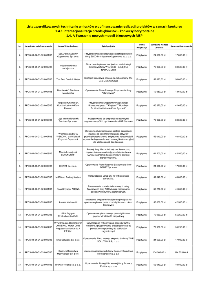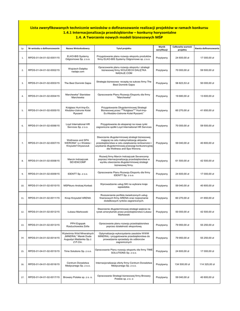 Lista zweryfikowanych technicznie wniosków o dofinansowanie realizacji projektów w ramach konkursu 1.4.1 Internacjonalizacja przedsiębiorstw – konkursy horyzontalne 1.4. A Tworzenie nowych modeli biznesowych MŚP Lp. Nr wniosku o dofinansowanie Nazwa Wnioskodawcy Tytuł projektu Wynik weryfikacji Całkowita wartość projektu Kwota dofinansowania 1. RPDS-01-04-01-02-0001/15 ELKO-BIS Systemy Odgromowe Sp. z o.o. Przygotowanie planu rozwoju eksportu produktów firmy ELKO-BIS Systemy Odgromowe sp. z o.o. Pozytywny 24 600,00 zł 17 000,00 zł 2. RPDS-01-04-01-02-0002/15 Wojciech Dalętka nadaje.com Opracowanie planu rozwoju eksportu i strategii biznesowej firmy WOJCIECH DALĘTKA NADAJE.COM Pozytywny 70 000,00 zł 59 500,00 zł 3. RPDS-01-04-01-02-0003/15 The Best Dominik Gajos Strategia biznesowa- receptą na sukces firmy The Best Dominik Gajos Pozytywny 58 823,53 zł 50 000,00 zł 4. RPDS-01-04-01-02-0004/15 Marchewka" Stanisław Marchewka Opracowanie Planu Rozwoju Eksportu dla firmy "Marchewka" Pozytywny 19 680,00 zł 13 600,00 zł 5. RPDS-01-04-01-02-0005/15 Kolglass Hurt-Imp-Ex. Kłodzko-Ustronie Kolat Ryszard Przygotowanie Długoterminowej Strategii Biznesowej przez """Kolglass""" Hurt-ImpEx.Kłodzko-Ustronie Kolat Ryszard.” Pozytywny 60 270,00 zł 41 650,00 zł 6. RPDS-01-04-01-02-0006/15 Loyd International HR Services Sp. z o.o. Przygotowanie do ekspansji na nowe rynki zagraniczne spółki Loyd International HR Services Pozytywny 70 000,00 zł 59 500,00 zł 7. RPDS-01-04-01-02-0007/15 Wellnsess and SPA WERONA” s.c Wioleta i Krzysztof Onyszczuk Stworzenie długoterminowej strategii biznesowej, mającej na celu maksymalizację aktywów przedsiębiorstwa w celu zwiększenia rentowności i uzyskania długoterminowej przewagi konkurencyjnej dla Wellness and Spa Werona. Pozytywny 59 040,00 zł 40 800,00 zł 8. RPDS-01-04-01-02-0008/15 Marcin Indrzejczak SEVENCOMP Rozwój firmy Marcin Indrzejczak Sevencomp poprzez internacjonalizację przedsiębiorstwa w wyniku stworzenia długoterminowej strategii biznesowej firmy. Pozytywny 61 500,00 zł 42 500,00 zł 9. RPDS-01-04-01-02-0009/15 IDENTT Sp. z o.o. Opracowanie Planu Rozwoju Eksportu dla firmy IDENTT Sp. z o.o. Pozytywny 24 600,00 zł 17 000,00 zł 10. RPDS-01-04-01-02-0010/15 MSPbiuro Andrzej Korbaś Wprowadzenie usług SKI na wybrane kraje sąsiedzkie. Pozytywny 59 040,00 zł 40 800,00 zł 11. RPDS-01-04-01-02-0011/15 Knop Krzysztof ARENA Rozszerzenie portfela świadczonych usług finansowych firmy ARENA oraz rozpoznanie dodatkowych rynków zagranicznych. Pozytywny 60 270,00 zł 41 650,00 zł 12. RPDS-01-04-01-02-0012/15 Łukasz Markowski Stworzenie długoterminowej strategii wejścia na rynek amerykański przez przedsiębiorstwo Łukasz Markowski Pozytywny 50 000,00 zł 42 500,00 zł 13. RPDS-01-04-01-02-0013/15 PPH Ergopak Rzeżuchowska Zofia Opracowanie planu rozwoju przedsiębiorstwa poprzez działalność eksportową Pozytywny 79 950,00 zł 55 250,00 zł 14. RPDS-01-04-01-02-0014/15 Wytwórnia Wód Mineralnych „MINERAL” Marek Duda Augustyn Maślanka Sp.J. Z.P.Chr. Optymalizacja wykorzystania zasobów WWM MINERAL i przygotowanie przedsiębiorstwa do prowadzenia sprzedaży do odbiorców zagranicznych Pozytywny 79 950,00 zł 55 250,00 zł 15. RPDS-01-04-01-02-0015/15 Time Solutions Sp. z o.o. Opracowanie Planu rozwoju eksportu dla firmy TIME SOLUTIONS Sp. z o.o. Pozytywny 24 600,00 zł 17 000,00 zł 16. RPDS-01-04-01-02-0016/15 Centrum Doradztwa Medycznego Sp. z o.o. Internacjonalizacja oferty firmy Centrum Doradztwa Medycznego Sp. z o.o. Pozytywny 134 500,00 zł 114 325,00 zł 17. RPDS-01-04-01-02-0017/15 Browary Polskie sp. z o. o. Opracowanie Strategii biznesowej firmy Browary Polskie sp. z o. o Pozytywny 59 040,00 zł 40 800,00 zł Zakup usług doradczej opracowania krótkookresowej strategii Planu Rozwoju Eksportu dla firmy LUXON sp. z o. o. Pozytywny 24 600,00 zł 17 000,00 zł RPDS-01-04-01-02-0019/15 PPH RELIS Renata Olszowa Zakup specjalistycznych usług doradczych szansą realizacji działań rozwojowych firmy RELIS na rynkach zagranicznych. Pozytywny 86 100,00 zł 59 500,00 zł RPDS-01-04-01-02-0020/15 Levier sp. z o. o. COMPANY DOCTORS - internacjonalizacja usług doradczych dla przedsiębiorstw w trudnej sytuacji finansowej Pozytywny 50 000,00 zł 42 500,00 zł RPDS-01-04-01-02-0021/15 ISYS sp. z o. o. Przygotowanie przedsiębiorstwa ISYS Sp. z o. o. do ekspansji zagranicznej poprzez opracowanie kompleksowej długoterminowej strategii biznesowej, w zakresie rozwoju na wybranych rynkach unijnych i poza unijnych Pozytywny 60 270,00 zł 41 650,00 zł 22. RPDS-01-04-01-02-0022/15 Polskie Centrum Dachowe sp. z o. o. Przygotowanie spółki Polskie Centrum Dachowe do rozwoju działalności eksportowej poprzez stworzenie kompleksowej, długofalowej dedykowanej Strategii Rozwoju na rynkach międzynarodowych Pozytywny 60 270,00 zł 41 650,00 zł 23. RPDS-01-04-01-02-0023/15 Welcomefinance.pl Sp. z.o.o. European Real Estate Agency – kluczem do rozwoju firmy na rynku zagranicznym Pozytywny 15 600,00 zł 13 260,00 zł 24. RPDS-01-04-01-02-0024/15 GPS-LOG sp. z o.o. Przygotowanie GPS LOG sp. z o.o. do internacjonalizacji działalności poprzez opracowanie Długoterminowej Strategii Rozwoju Biznesu Pozytywny 49 000,00 zł 41 650,00 zł 25. RPDS-01-04-01-02-0025/15 Hotlab.pl Długoterminowa strategia rozwoju biznesu i eksportu do 2020 roku przewagą konkurencyjną spółki Hotlab.pl Sp. z o.o. Pozytywny 53 874,00 zł 37 230,00 zł 26. RPDS-01-04-01-02-0026/15 Alkemie Group Sp. z o.o. S.K. Stworzenie Planu rozwoju eksportu dla Przedsiębiorstwa Alkemie Group Spółka z Ograniczoną Odpowiedzialnością Spółka Komandytowa Pozytywny 23 370,00 zł 16 150,00 zł 27. RPDS-01-04-01-02-0027/15 Agencja Rozwoju Innowacji S.A. Wspieranie bułgarskich, rumuńskich i ukraińskich przedsiębiorców w zakresie pozyskiwania funduszy na rozwój innowacji jako istotny element strategii rozwoju Agencji Rozwoju Innowacji S.A. na najbliższe 4 l