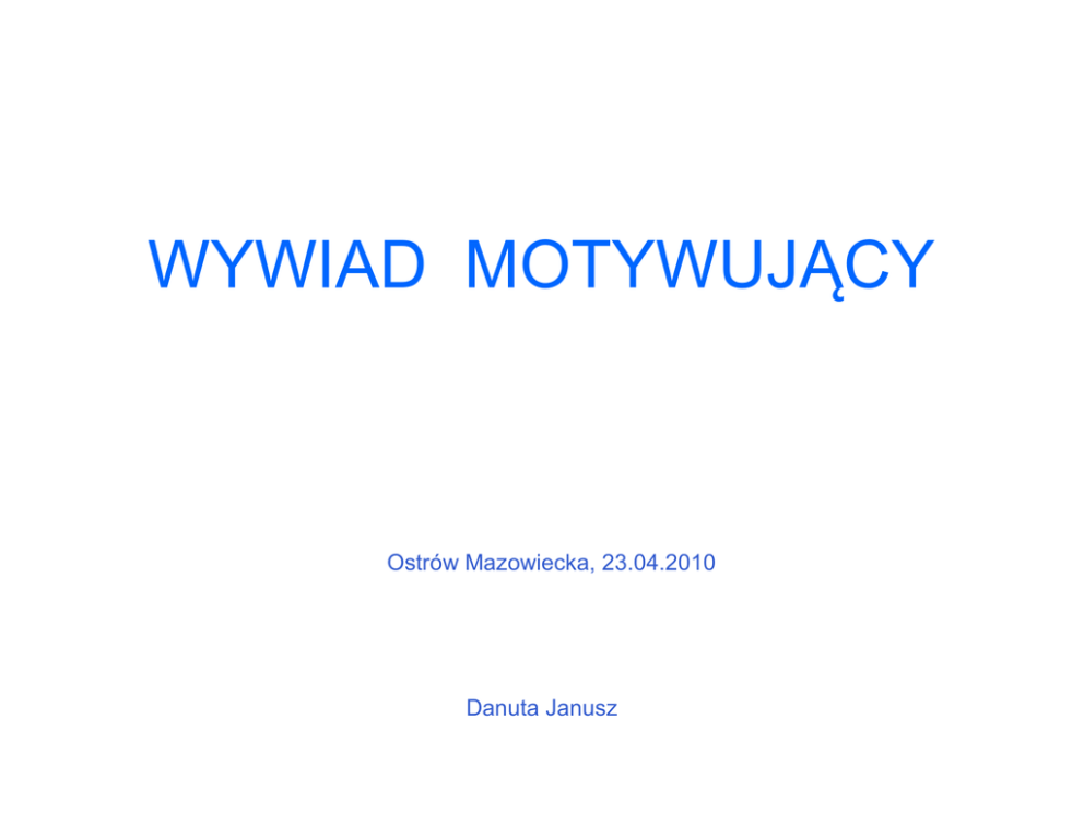 WYWIAD MOTYWUJĄCY Ostrów Mazowiecka, 23.04.2010 Danuta Janusz Wywiad motywujący • WM to nowatorska metoda pracy z trudnym klientem. • Oparta na podejściu humanistycznym, psychologii inspiracji i motywacji. • Polega na takim oddziaływaniu na klienta, aby wzmocnić jego zaangażowanie we wprowadzanie istotnych zmian w jego życiu, ułatwia odkrywanie jego wewnętrznych źródeł motywacji do zmiany Wywiad Motywujący • Motywacja od łacińskiego „motus“ = ruch • Motywacja: wszystkie pobudki decydujące o działaniach człowieka. WM- definicja • Wywiad motywacyjny to podejście dyrektywne, zorientowane na klienta, którego celem jest zainicjowanie zmiany zachowania poprzez uświadomienie klientowi jego ambiwalentnego nastawienia dotyczącego zmiany i pomoc w poradzeniu sobie z nim. Wywiad motywujacy TWÓRCY: – William R. Miller i Stephen Rollnick Wywiad motywujący. Jak przygotowywać ludzi do zmiany. Wyd. UJ, 2010 – Carl Rogers – Prochaska i DiClemente Wywiad motywujący Zarówno dobry przywódca jak i dobry terapeuta próbują znaleźć wspólny język ze swoimi pracownikami/pacjentami/klientami. Dzięki umiejętności uważnego słuchania najlepiej nawiązuje się kontakt z rozmówcą Rozmówca powinien czuć się spokojnie i bezpiecznie Przywódca docenia wysiłek rozmówcy na wiele sposobów, jest otwarty na każdego klienta, umożliwia wprowadzanie i rozwijanie własnych planów działania klienta Wywiad motywujący Rozmówca stosując metodę wywiadu motywującego: • nie przekonuje klienta o istnieniu problemu i potrzebie zmiany; • nie udziela rad i nie proponuje rozwiązań problemu bez zgody lub prośby klienta; • nie odgrywa roli „eksperta” stawiając klienta w pozycji pasywnego uczestnika; • nie moralizuje i nie poucza klienta; • nie przykleja diagnostycznych etykietek; • nie oskarża i do niczego nie zmusza. Motywacja • Inne słowo na określenie pobudki – a zatem wewnętrznego motoru pobudzającego nas do działania. Motywacji potrzebuję, aby osiągnąć cele, zamierzenia, dobre postanowienia. Prawdziwa dobra motywacja wiąże się z naprawdę dobrze przemyślanymi celami. Dopiero wtedy, kiedy będzie jasne, jaki wewnętrzny motor, jaka potrzeba kryje się za celem, będziemy w stanie się tak silnie zmotywować, że faktycznie wytrwamy. Ważne jest zrozumienie, że motywacja zawsze musi pochodzić z wewnątrz, czyli z nas samych. Wywiad motywujący 1 podstawowe pytanie: Dlaczego ludzie z autodestrukcyjnym zachowaniem nawet przy bardzo silnej presji z zewnątrz mają ogromne trudności, aby się zmienić? Wywiad motywujący 2 podstawowe pytanie: Jak ja jako terapeuta, pracodawca, nauczyciel mogę odnaleźć oraz wzmocnić motywację w moim rozmówcy? WM- Z A S A D Y • Okazywać empatię. • Eksplorować sprzeczne motywy i pracować z nimi. • Unikać sporów lub otwartej konfrontacji. • Zmniejszać opór. • Wzmacniać wiarę we własne możliwości i wypowiedzi na temat zmiany. Empatia Zadania terapeuty: • uważnie słuchać wypowiedzi klienta • stosować słuchanie odzwierciedlające • okazywać zrozumienie • NIE krytykować • NIE oceniać • NIE obwiniać Eksplorować sprzeczne motywy Zadania terapeuty: • pomóc klientowi uświadomić negatywne konsekwencje i ryzyko problemowych zachowań • wykazać sprzeczność pomiędzy bieżącym zachowaniem a celami i wartościami • dokładnie określić różnice między tym „co jest” i tym „co chcę aby było” • wzmacniać dążenia do zmiany zachowań Unikać konfrontacji Zadania terapeuty: • nie przekonywać • unikać sporów • nie przyklejać etykietek • nie dowodzić swojej racji • wspierać klienta w poszukiwaniu własnych rozwiązań Zmniejszać opór Zadania terapeuty: • analizować własne zachowania • zmieniać kierunek rozmowy • nie dążyć do przełamania oporu • patrzeć na problem „oczami klienta” Wzmacniać wiarę we własne możliwości Zadania terapeuty: • wzbudzać wiarę w możliwość dokonania zmian • dawać nadzieję i wspierać wiarę we własne siły • podkreślać mocne strony klienta • edukować w zakresie biologicznych mechanizmów uzależnienia • skoncentrować uwagę na mniejszych etapach prowadzących do celu WM - TECHNIKI Pytania otwarte (Open questions) Afirmacja (Affirmation) Słuchanie odzwierciedlające (Reflective listening) Podsumowanie (Summarizing) OARS =WIOSŁA Pytania otwarte • pomagają rozpocząć wywiad • pomagają ustalić fakty • odgrywają kluczową rolę przy ocenie problemu Afirmacja • pomaga rozwijać i wzmacniać niezależne podejmowanie decyzji przez klienta • wyraża szacunek wobec doświadczeń i uczuć klienta • może pomóc uniknąć rozczarowań i utraty motywacji Słuchanie odzwierciedlające • pozwala okazać klientowi, że uważnie się go słucha • pomaga ustalić, czy wypowiedzi klienta zostały właściwie zrozumiane • pomaga wzmocnić pewność klienta w tym, że zmiana jest niezbędna Podsumowanie - Potwierdzanie • pomaga podkreślić najbardziej istotne wypowiedzi klienta • daje możliwość połączyć wypowiedzi klienta na różne tematy • pomaga przejść do omawiania innego tematu po uprzednim uogólnieniu tego, co już było powiedziane Taktyka Kolombo • Pomaga przełożyć odpowiedzialność za rozwiązanie sprzeczności z terapeuty na klienta. • Przykład: • „Hmm... Proszę mi pomóc to zrozumieć. Powiedziałeś, że najważniejsze dla ciebie jest teraz bycie dobrym ojcem i zachowanie prawa opieki nad córką. Jak twoje branie heroiny ma się do tego wszystkiego?” Wywiad motywujący – podstawowa koncepcja • • • • • Podstawowe zasady Empatia, kongruencja, akceptacja, Integrowanie sprzeczności, Unikanie udowadniania, Praca nad oporem, Wzmacnianie wiary we własne umiejętności • • • • • Na czym koncentruje się terapeuta Model zmiany / stadia zmiany Ambiwalencja, sprzeczności Prowadzenie rozmow