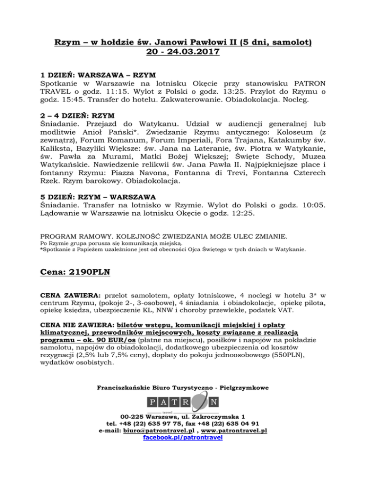 Rzym – w hołdzie św. Janowi Pawłowi II (5 dni, samolot) 20 - 24.03.2017 1 DZIEŃ: WARSZAWA – RZYM Spotkanie w Warszawie na lotnisku Okęcie przy stanowisku PATRON TRAVEL o godz. 11:15. Wylot z Polski o godz. 13:25. Przylot do Rzymu o godz. 15:45. Transfer do hotelu. Zakwaterowanie. Obiadokolacja. Nocleg. 2 – 4 DZIEŃ: RZYM Śniadanie. Przejazd do Watykanu. Udział w audiencji generalnej lub modlitwie Anioł Pański*. Zwiedzanie Rzymu antycznego: Koloseum (z zewnątrz), Forum Romanum, Forum Imperiali, Fora Trajana, Katakumby św. Kaliksta, Bazyliki Większe: św. Jana na Lateranie, św. Piotra w Watykanie, św. Pawła za Murami, Matki Bożej Większej; Święte Schody, Muzea Watykańskie. Nawiedzenie relikwii św. Jana Pawła II. Najpiękniejsze place i fontanny Rzymu: Piazza Navona, Fontanna di Trevi, Fontanna Czterech Rzek. Rzym barokowy. Obiadokolacja. 5 DZIEŃ: RZYM – WARSZAWA Śniadanie. Transfer na lotnisko w Rzymie. Wylot do Polski o godz. 10:05. Lądowanie w Warszawie na lotnisku Okęcie o godz. 12:25. PROGRAM RAMOWY. KOLEJNOŚĆ ZWIEDZANIA MOŻE ULEC ZMIANIE. Po Rzymie grupa porusza się komunikacją miejską. *Spotkanie z Papieżem uzależnione jest od obecności Ojca Świętego w tych dniach w Watykanie. Cena: 2190PLN CENA ZAWIERA: przelot samolotem, opłaty lotniskowe, 4 noclegi w hotelu 3* w centrum Rzymu, (pokoje 2-, 3-osobowe), 4 śniadania i obiadokolacje, opiekę pilota, opiekę księdza, ubezpieczenie KL, NNW i choroby przewlekłe, podatek VAT. CENA NIE ZAWIERA: biletów wstępu, komunikacji miejskiej i opłaty klimatycznej, przewodników miejscowych, koszty związane z realizacją programu – ok. 90 EUR/os (płatne na miejscu), posiłków i napojów na pokładzie samolotu, napojów do obiadokolacji, dodatkowego ubezpieczenia od kosztów rezygnacji (2,5% lub 7,5% ceny), dopłaty do pokoju jednoosobowego (550PLN), wydatków osobistych. Franciszkańskie Biuro Turystyczno - Pielgrzymkowe 00-225 Warszawa, ul. Zakroczymska 1 tel. +48 (22) 635 97 75, fax +48 (22) 635 04 91 e-mail: [email protected] , www.patrontravel.pl facebook.pl/patrontravel