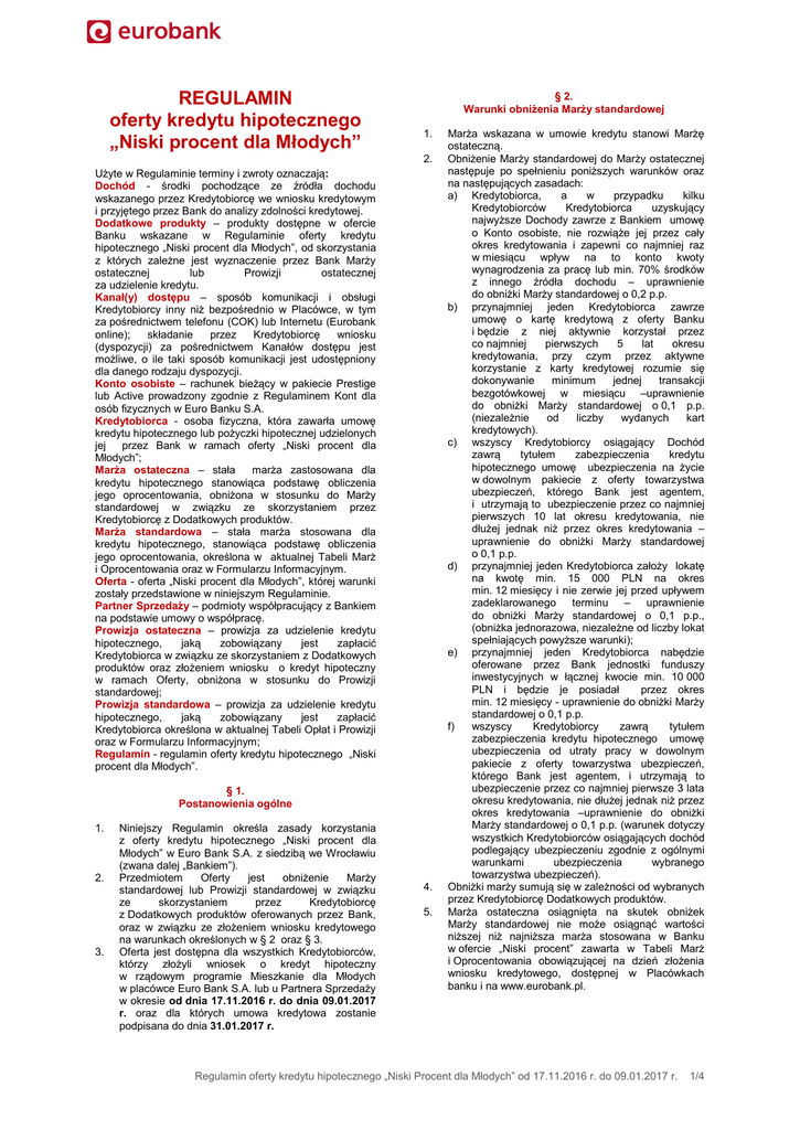 REGULAMIN oferty kredytu hipotecznego „Niski procent dla Młodych” § 2. Warunki obniżenia Marży standardowej 1. 2. Użyte w Regulaminie terminy i zwroty oznaczają: Dochód - środki pochodzące ze źródła dochodu wskazanego przez Kredytobiorcę we wniosku kredytowym i przyjętego przez Bank do analizy zdolności kredytowej. Dodatkowe produkty – produkty dostępne w ofercie Banku wskazane w Regulaminie oferty kredytu hipotecznego „Niski procent dla Młodych”, od skorzystania z których zależne jest wyznaczenie przez Bank Marży ostatecznej lub Prowizji ostatecznej za udzielenie kredytu. Kanał(y) dostępu – sposób komunikacji i obsługi Kredytobiorcy inny niż bezpośrednio w Placówce, w tym za pośrednictwem telefonu (COK) lub Internetu (Eurobank online); składanie przez Kredytobiorcę wniosku (dyspozycji) za pośrednictwem Kanałów dostępu jest możliwe, o ile taki sposób komunikacji jest udostępniony dla danego rodzaju dyspozycji. Konto osobiste – rachunek bieżący w pakiecie Prestige lub Active prowadzony zgodnie z Regulaminem Kont dla osób fizycznych w Euro Banku S.A. Kredytobiorca - osoba fizyczna, która zawarła umowę kredytu hipotecznego lub pożyczki hipotecznej udzielonych jej przez Bank w ramach oferty „Niski procent dla Młodych”; Marża ostateczna – stała marża zastosowana dla kredytu hipotecznego stanowiąca podstawę obliczenia jego oprocentowania, obniżona w stosunku do Marży standardowej w związku ze skorzystaniem przez Kredytobiorcę z Dodatkowych produktów. Marża standardowa – stała marża stosowana dla kredytu hipotecznego, stanowiąca podstawę obliczenia jego oprocentowania, określona w aktualnej Tabeli Marż i Oprocentowania oraz w Formularzu Informacyjnym. Oferta - oferta „Niski procent dla Młodych”, której warunki zostały przedstawione w niniejszym Regulaminie. Partner Sprzedaży – podmioty współpracujący z Bankiem na podstawie umowy o współpracę. Prowizja ostateczna – prowizja za udzielenie kredytu hipotecznego, jaką zobowiązany jest zapłacić Kredytobiorca w związku ze skorzystaniem z Dodatkowych produktów oraz złożeniem wniosku o kredyt hipoteczny w ramach Oferty, obniżona w stosunku do Prowizji standardowej; Prowizja standardowa – prowizja za udzielenie kredytu hipotecznego, jaką zobowiązany jest zapłacić Kredytobiorca określona w aktualnej Tabeli Opłat i Prowizji oraz w Formularzu Informacyjnym; Regulamin - regulamin oferty kredytu hipotecznego „Niski procent dla Młodych”. § 1. Postanowienia ogólne 1. 2. 3. Niniejszy Regulamin określa zasady korzystania z oferty kredytu hipotecznego „Niski procent dla Młodych” w Euro Bank S.A. z siedzibą we Wrocławiu (zwana dalej „Bankiem”). Przedmiotem Oferty jest obniżenie Marży standardowej lub Prowizji standardowej w związku ze skorzystaniem przez Kredytobiorcę z Dodatkowych produktów oferowanych przez Bank, oraz w związku ze złożeniem wniosku kredytowego na warunkach określonych w § 2 oraz § 3. Oferta jest dostępna dla wszystkich Kredytobiorców, którzy złożyli wniosek o kredyt hipoteczny w rządowym programie Mieszkanie dla Młodych w placówce Euro Bank S.A. lub u Partnera Sprzedaży w okresie od dnia 17.11.2016 r. do dnia 09.01.2017 r. oraz dla których umowa kredytowa zostanie podpisana do dnia 31.01.2017 r. 4. 5. Marża wskazana w umowie kredytu stanowi Marżę ostateczną. Obniżenie Marży standardowej do Marży ostatecznej następuje po spełnieniu poniższych warunków oraz na następujących zasadach: a) Kredytobiorca, a w przypadku kilku Kredytobiorców Kredytobiorca uzyskujący najwyższe Dochody zawrze z Bankiem umowę o Konto osobiste, nie rozwiąże jej przez cały okres kredytowania i zapewni co najmniej raz w miesiącu wpływ na to konto kwoty wynagrodzenia za pracę lub min. 70% środków z innego źródła dochodu – uprawnienie do obniżki Marży standardowej o 0,2 p.p. b) przynajmniej jeden Kredytobiorca zawrze umowę o kartę kredytową z oferty Banku i będzie z niej aktywnie korzystał przez co najmniej pierwszych 5 lat okresu kredytowania, przy czym przez aktywne korzystanie z karty kredytowej rozumie się dokonywanie minimum jednej transakcji bezgotówkowej w miesiącu –uprawnienie do obniżki Marży standardowej o 0,1 p.p. (niezależnie od liczby wydanych kart kredytowych). c) wszyscy Kredytobiorcy osiągający Dochód zawrą tytułem zabezpieczenia kredytu hipotecznego umowę ubezpieczenia na życie w dowolnym pakiecie z oferty towarzystwa ubezpieczeń, którego Bank jest agentem, i utrzymają to ubezpieczenie przez co najmniej pierwszych 10 lat okresu kredytowania, nie dłużej jednak niż przez okres kredytowania – uprawnienie do obniżki Marży standardowej o 0,1 p.p. d) przynajmniej jeden Kredytobiorca założy lokatę na kwotę min. 15 000 PLN na okres min. 12 miesięcy i nie zerwie jej przed upływem zadeklarowanego terminu – uprawnienie do obniżki Marży standardowej o 0,1 p.p., (obniżka jednorazowa, niezależne od liczby lokat spełniających powyższe warunki); e) przynajmniej jeden Kredytobiorca nabędzie oferowane przez Bank jednostki funduszy inwestycyjnych w łącznej kwocie min. 10 000 PLN i będzie je posiadał przez okres min. 12 miesięcy - uprawnienie do obniżki Marży standardowej o 0,1 p.p. f) wszyscy Kredytobiorcy zawrą tytułem zabezpieczenia kredytu hipotecznego umowę ubezpieczenia od utraty pracy w dowolnym pakiecie z oferty towarzystwa ubezpieczeń, którego Bank jest agentem, i utrzymają to ubezpieczenie przez co najmniej pierwsze 3 lata okresu kredytowania, nie dłużej jednak niż przez okres kredytowania –uprawnienie do obniżki Marży standardowej o 0,1 p.p. (warunek dotyczy wszystkich Kredytobiorców osiągających dochód podlegający ubezpieczeniu zgodnie z ogólnymi warunkami ubezpieczenia wybranego towarzystwa ubezpieczeń). Obniżki marży sumują się w zależności od wybranych przez Kredytobiorcę Dodatkowych produktów. Marż