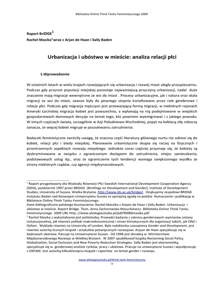 Biblioteka Online Think Tanku Feministycznego 2009 Raport BriDGE 1 Rachel Masika2 wraz z Arjan de Haan i Sally Baden Urbanizacja i ubóstwo w mieście: analiza relacji płci 1.Wprowadzenie W ostatnich latach w wielu krajach rozwijających się urbanizacja i rozwój miast uległy przyspieszeniu. Podczas gdy przyrost populacji miejskiej pozostaje najważniejszą przyczyną urbanizacji, nadal duże znaczenie mają migracje wewnętrzne ze wsi do miast . Procesy urbanizacyjne, jak i natura oraz skala migracji ze wsi do miast, zawsze były do pewnego stopnia kształtowane przez role genderowe i relacje płci. Podczas gdy migracja mężczyzn jest przeważającą formą migracji, w niektórych rejonach Ameryki Łacińskiej migracja kobiet jest powszechna, a wpływają na nią podejmowane w wiejskich gospodarstwach domowych decyzje na temat tego, kto powinien wyemigrować i z jakiego powodu. W innych częściach świata, szczególnie w Azji Południowo-Wschodniej, popyt na kobiecą siłę roboczą oznacza, że więcej kobiet migruje w poszukiwaniu zatrudnienia. Badaczki feministyczne zwróciły uwagę, że znaczna część literatury głównego nurtu nie odnosi się do kobiet, relacji płci i biedy miejskiej. Planowanie urbanistyczne skupia się raczej na fizycznych i przestrzennych aspektach rozwoju miejskiego. Jednakże coraz częściej przyznaje się, że kobiety są dyskryminowane w związku z ograniczonym dostępem do zatrudnienia, miejsc zamieszkania, podstawowych usług itp., oraz że ograniczenie tych tendencji wymaga zwiększonego wysiłku ze strony niektórych rządów, czy agencji międzynarodowych. 1 Raport przygotowany dla Wydziału Równości Płci Swedish International Development Cooperation Agency (SIDA), październik 1997 przez BRIDGE (Briefings on Development and Gender), Institute of Development Studies, University of Sussex, Wielka Brytania. http://www.ids.ac.uk/bridge/. Dziękujemy zespołowi BRIDGE Instytutu Badań nad Rozwojem Uniwersytetu Sussex za uprzejmą zgodę na polskie tłumaczenie i publikację w Bibliotece Online Think Tanku Feministycznego. Dane bibliograficzne polskiego tŁumaczenia: Rachel Massika z Arjaan de Haan I Sally Baden. Urbanizacja i ubóstwo w mieście. Raport Bridge. Tłum. Anna Zachorowska-Mazurkiewicz. Biblioteka Online Think Tanku Feministycznego 2009 URL http: //www.ekologiasztuka.pl/pdf/f0080masika.pdf 2 Rachel Masika z wykształcenia jest politolożką. Prowadzi badania z zakresu genderowych wymiarów zmiany instytucjonalnej, jak również polityki makroekonomicznej i zmian klimatycznych dla organizacji takich, jak ONZ i Oxfam. Wykłada również na University of London. Była redaktorka czasopisma Gender and Development, jest również autorką licznych książek i artykułów poświęconych rozwojowi. Arjaan de Haan specjalizuje się w badnaiach ubóstwa. Parcuje na Uniwersytecie Sussex. Od 1998 jest doradcą w Ministerstwie Międzynarodowego Rozwoju w Wielkiej Brytanii. W 2007 opublikował książkę Reclaiming Social Policy. Globalization, Social Exclusion and New Poverty Reduction Strategies. Sally Baden jest ekonomistką, specjalizuje się w genderowej analizie rynków, pracy i ubóstwa. Pracuje na uniwesytecie Sussex i wpsołpracuje z OXFAM. Jest autorką kilkudziesięciu ksiązek i raportów na temat gender i rozwoju. www.ekologiasztuka.pl/think.tank.feministyczny -1- Biblioteka Online Think Tanku Feministycznego 2009 Perspektywa genderowa w odniesieniu do miejskiego ubóstwa jest istotna, ponieważ mężczyźni i kobiety doświadczają i reagują na biedę w odmienny sposób. Ograniczenia, jak i możliwości spowodowane uprzedzeniami ze względu na płeć, wpływają na dostęp do dochodów i zasobów, mieszkalnictwo, transport i podstawowe usługi. Oferowanie usług miejskich, w których nie zwraca się uwagi na relacje płci, nie przyczyni się do zaspokojenia potrzeb kobiet, gdyż ich priorytety nie są rozważane. 2.Urbanizacja, ubóstwo miejskie i rozwój: przegląd 2.1.Urbanizacja: przegląd W ciągu ostatnich paru dekad w wielu krajach rozwijających się procesy urbanizacji i rozwoju miast uległy przyspieszeniu. W 1970 roku 37% ludności świata mieszkało w miastach. W 1995 roku liczba ta wyniosła 45%, a prognozuje się, że udział ten przekroczy 50% do 2005 roku (UN 1995). Liczba ludności miejskiej szybko wzrasta – o 2,5% rocznie w Ameryce Łacińskiej i Karaibach, 3,3% w Afryce Północnej, 4% w Azji i Pacyfiku i o 5% w Afryce (ibid.). Porównania międzynarodowe są jednak utrudnione, ponieważ różne kraje stosują odmienne definicje obszarów miejskich3. W Europie Wschodniej, Ameryce Południowej i na Karaibach ogólny stosunek kobiet do mężczyzn jest wyższy w ośrodkach miejskich niż na obszarach wiejskich, odwrotna kompozycja występuje w Afryce i w Azji. Chociaż w wielu miastach trzeciego świata przyrost naturalny ludności jest najważniejszą przyczyną urbanizacji, istotnym czynnikiem jest także migracja ze wsi do miast (de Haan 1997). Przepływy migracyjne są wewnętrznie zróżnicowane, złożone i stale się zmieniają (biorąc pod uwagę przepływy ze wsi do miast, z miast do wsi, z miast do miast i ze wsi do wsi). Obserwuje się różnice pomiędzy narodami i regionami ze względu na wiek i poziom wykształcenia migrantów, oraz stopień w jakim migracja postrzegana jest za czasową bądź stałą. Kluczową przyczyną migracji jest zróżnicowanie dochodów między regionami miejskimi a wiejskimi (Gilbert i Gugler 1992). Na migrację wpływają również ceny zbóż, struktura własności ziemi, zmiany w technologiach agrarnych i strukturze upraw zarówno w obszarach sąsiadujących, jak i bardziej odległych. Wpływają na nią również inne czynniki związane z indywidualnymi strategiami przetrwania, czy też strategiami gospodarstw domowych, ich strukturą, jak również szerszym kontekstem politycznym, ekonomicznym i społecznym (UNCHS, 1996). 2.2.Ubóstwo miejskie: definicje, pojęcia i m