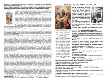 Przedmowa ks. Ryszarda Uklei SDB : Przytaczam tu w obszerniejszych fragmentach wizję siostry Natalii, która dobitnie ilustruje ten Boży plan decydującej rozprawy Niewiasty z mocami zła i starodawnym wężem , której triumfalne zwycięstwo zapoczątkuje tę zapowiedzianą Maryjną epokę pokoju i szczęścia, przypominającą czasy pierwszych ludzi w ziemskim raju przed grzechem. Siostra Natalia opisała tę wizję w następujących słowach : „Widziałam Trójcę Przenajświętszą, jak zastanawiała się nad losem świata pogrążonego w grzechach. Cały niebiański Dwór Aniołów i Świętych klęczał i adorował Trójcę Przenajświętszą w głębokim milczeniu. Ojciec Przedwieczny powiedział: „Pogrążony w grzechu świat musi, zgodnie z moją Sprawiedliwością, być unicestwiony”. Wówczas zobaczyłam, jak Jezus - Miłość miłosierna skłonił się przed Swym Ojcem Przedwiecznym i błagał o łaskę dla świata. Rzucił się do stóp Swego Ojca (chociaż stanowi jedno z Nim, jest odrębną Osobą) mówiąc: „Ojcze, jestem Twoim Synem. To Ty chciałeś. abym umarł za świat ”. W tym samym czasie pokazał Mu Swoje rozpalone rany. Potężna ręka, wcale już nie ojcowska, ale sprawiedliwa i szukająca zapłaty, mocno ciążyła nad kulą ziemską. Wówczas Jezus wsunął swoje ręce pokryte ranami pod rękę Ojca Przedwiecznego i prosił Go: „Miej litość dla nich”. Ale ręka Ojca Niebieskiego obniżyła ręce Jezusa ozdobione promieniującymi ranami. „Nie, mój Synu, powiedział. Grzech musi być unicestwiony!”. Przerażającym było to widzieć, ponieważ miałam wrażenie, że Sprawiedliwość przeważa nad Miłosierdziem. Wówczas Jezus spoglądając w bok, uczynił znak do swej Matki, by przyszła Mu z pomocą i powiedział Jej: Moja Niepokalana Matko, przyjdź mi pomóc wstrzymać odpłacaj ącą rękę mego Ojca, moje ręce nie wystarczają!”. Skoro tylko Święta Dziewica włożyła swe ręce pod ręce Jezusa, Ojciec Przedwieczny uniósł rękę sprawiedliwości i powiedział: „Mój Synu, Miłosierdzie zwyciężyło. Grzeszny świat poznał łaskę przez modlitwy Niepokalanej Matki Bożej. To Przenajświętszej Dziewicy zawierzymy zbawienie świata. Zbawienie świata koniecznie potrzebuje istnienia Mocy. Dlatego przyoblekamy Ją w moc Królowej. Stała się Zwycięską Królową świata , Stała się dla świata pogrążonego w grzechu Współodkupicielką. Niech za Jej pośrednictwem ludzkość osiągnie łaskę i świętość! Jej rozkazom poddajemy również Anielskie Zastępy!”. Na te słowa wypowiedziane przez Ojca Przedwiecznego, Zastępy Anielskie wybuchły radością i oddały cześć Maryi. Matka Boża ukazała się przyozdobiona w Jej trzy największe cnoty: niepokalaną czystość, gorejącą miłość i głęboką pokorę. Zobaczyłam, że Bóg, będąc autorem , w nie mniejszym stopniu je podziwiał. Doświadczyłam wielkiej radości widząc, jak w końcu realizują się słowa skromnej Dziewicy z Nazaretu: „On wywyższa pokornych!”. Następnie Maryja otrzymała królewską koronę Trójcy Przenajświętszej. Korona była potrójna. Symbolizowała Ojca, i Jej Syna i Ducha Świętego. Kiedy przyniesiono Jej królewski płaszcz, zauważyłam, że w klamrze było życie. Ona symbolizow ała Jej związek z Trójcą Przenajświętszą, jako córki Ojca, matki Syna i Oblubienicy Ducha Świętego. Osoby Trójcy Przenajświętszej działały w Błogosławionej Dziewicy. Na nowo Duch Święty osłaniał ją, aby mogła dać światu swego Syna Jezusa; Ojciec Przedwieczny rozciągał nad nią pełnię swych łask, a Syn promieniował ra dością na wzór gratulacji. Jezus powiedział jej: „Moja Niepokalana Matko, Zwycięska Królowo świata, ukaż Twoją władzę! Odtąd jesteś Zbawicielką grzesznej ludzkości. Ponieważ zgodnie z Moją wolą, brałaś udział w zbawieniu ludzkości, udzielam Ci udziału w Mojej władzy. Od tego momentu powierzam Ci zbawienie ludzkości i jako Królowa możesz sprawować tę władzę od teraz. Potrzebuję dzielić wszystko z Tobą ponieważ chcę, abyś była we wszystkim podobna do Mnie. Jesteś Współodkupicielką ludzkości”. Zobaczyłam, że płaszcz Maryi jest skąpany we krwi Jezusa i połyskuje szkarłatem i purpurą. Następnie moja uwaga zwróciła się ku Aniołom przyozdobionym na biało, czerwono i czarno. Otaczali oni czcią swą Królowę. Zrozumiałam symbolikę kolorów; biel czystości przyszłego świata, czerwień męczeństwa przez oczyszczenie i czerń żałoby - którą każe nosić potępienie dusz. Następnie Przenajświętsza Dziewica krokiem spokojnym, ale pełnym godności skierowała się ku Ziemi. Nie zdołałam dostrzec końca Jej trenu. Wydaje mi się, że musiał być jeszcze u Ojca Przedwiecznego. Świat ukazał mi się jako gigantyczna kula otoczona cierniową koroną grzechów i przepełniona wadami. Szatan tam stroił miny węża, kalając wszystko i rozsypując swoje ziarno grzechów. Matka Boża, jako Zwycięska Królowa, swą wysoką sylwetką panowała nad ziemią i rozciągała na niej swój płaszcz zabarwiony Krwią Jezusa. Następnie pobłogosławiła Ziemię i jednocześnie cała ziemia otrzymała błogosławieństwo Trójcy Przenajświętszej. Wówczas rozwścieczony i odważny szatański smok zaatakował Przenajświętszą Dziewicę. Gardziel jego wyrzucała płomienie. Obawiałam się, że spłoną szaty Maryi. Ale płomienie nie mogły ich dosięgnąć. Święta Dziewica zachowywała swój spokój , jakby lekceważyła tę walkę. Pogodna, postawiła Maryja swoją stopę na głowie smoka. Smok pluł ogniem ze swej nienawiści, ale nie mógł w żaden sposób jej zaszkodzić. Glob ziemski utracił swą koronę cierniową, a w jej miejsce zakwitła lilia. Zobaczyłam jak błogosławieństwo Świętej Dziewicy spływało na wszystkie ludy i wszystkie narody. Miała ona głos pełen majestatu, godności i niewysłowionej słodyczy, mówiła: „Przy