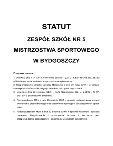 STATUT ZESPÓŁ SZKÓŁ NR 5 MISTRZOSTWA SPORTOWEGO W BYDGOSZCZY PODSTAWA PRAWNA: 1. Ustawa z dnia 7 IX 1991 r. o systemie oświaty – (Dz. U. z 2004 Nr 256 poz. 2572 z późniejszymi zmianami) oraz rozporządzenia wykonawcze. 2. Rozporządzenie Ministra Edukacji Narodowej z dnia 21 maja 2010 r. w sprawie ramowych statutów publicznego przedszkola oraz publicznych szkół. 3. Ustawa z dnia 26 stycznia 1982r. - Karta Nauczyciela (Dz. U. z 2006 r. Nr 97, poz. 674 z późniejszymi zmianami). 4. Rozporządzenie MEN z dnia 23 grudnia 2008 w sprawie podstawy programowej wychowania przedszkolnego oraz kształcenia ogólnego w poszczególnych typach szkół. 5. Rozporządzeniem MEN z dnia 20 sierpnia 2010 r w sprawie warunków i sposobu oceniania, klasyfikowania i promowania uczniów i słuchaczy przeprowadzania sprawdzianów i egzaminów w szkołach publicznych. oraz SPIS TREŚCI Rozdział 1 INFORMACJE OGÓLNE O SZKOLE str. 3 Rozdział 2 CELE I ZADANIA SZKOŁY str. 4 Rozdział 3 ORGANY SZKOŁY str. 6 Rozdział 4 DYREKTOR SZKOŁY str. 6 Rozdział 5 RADA PEDAGOGICZNA – DZIAŁALNOŚĆ str. 8 Rozdział 6 RADA PEDAGOGICZNA – KOMPETENCJE str. 9 Rozdział 7 RADA RODZICÓW – DZIAŁALNOŚĆ I KOMPETENCJE str. 11 Rozdział 8 SAMORZĄD UCZNIOWSKI str. 13 Rozdział 9 UCZNIOWIE SZKOŁY str. 14 Rozdział 10 PRAWA I OBOWIĄZKI UCZNIA str. 15 Rozdział 11 ORGANIZACJA SZKOŁY str. 19 Rozdział 12 BIBLIOTEKA SZKOLNA str. 21 Rozdział 13 POMIESZCZENIA SZKOŁY str. 22 Rozdział 14 NAUCZYCIELE I INNI PRACOWNICY SZKOŁY str. 23 Rozdział 15 ROZWIĄZYWANIE KONFLIKTÓW SZKOLNYCH str. 25 Rozdział 16 PRAWA I OBOWIĄZKI RODZICÓW str. 25 Rozdział 17 REGULAMINY ZESPOŁU SZKÓŁ NR 5 MISTRZOSTWA SPORTOWEGO Rozdział 18 POSTANOWIENIA KOŃCOWE str. 26 str. 27 str. 2 Rozdział 1 Informacje ogólne o szkole 1. Szkoła nosi nazwę: Zespół Szkół nr 5 Mistrzostwa Sportowego i zwana jest w dalszej części Statutu "szkołą". 2. Adres szkoły: ulica Berlinga 13, 85-796 Bydgoszcz, obiekt sportowy ul. Piwnika Ponurego. 3. Organem prowadzącym szkołę jest Gmina Bydgoszcz. 4. Szkoła jest instytucją edukacyjną, działającą na rzecz uczniów i ich rodziców. Będąc szkołą publiczną realizuje także cele ogólnospołeczne. 5. W skład Zespołu wchodzą: 1) XV Liceum Ogólnokształcące, 2) XX Liceum Ogólnokształcące Mistrzostwa Sportowego, 3) Gimnazjum nr 53, 4) Gimnazjum nr 54 Mistrzostwa Sportowego. 6. Na pieczęciach i stemplach nazwa szkoły używana jest w pełnym brzmieniu. Poszczególne organy wchodzące w skład Zespołu Szkół nr 5 Mistrzostwa Sportowego mogą używać odrębnych pieczęci. 7. XV Liceum Ogólnokształcące posiada własny sztandar. 8. Liceum Ogólnokształcące i Gimnazjum mogą wystąpić o nadanie imienia przez organ prowadzący na wniosek Rady Pedagogicznej. 9. Organem nadzorującym szkołę jest Kujawsko-Pomorski Kurator Oświaty w Bydgoszczy. 10. Członkami społeczności szkolnej są: uczniowie, ich rodzice, nauczyciele oraz inni pracownicy szkoły. Czas trwania kształcenia w gimnazjum wynosi 3 lata, w liceum ogólnokształcącym 3 lata. str. 3 11. Profile kształcenia w liceum ogólnokształcącym ustala się zgodnie z przepisami w sprawie ramowych planów nauczania. 12. Kształcenie w Gimnazjum nr 53 odbywa się w klasach o profilu matematycznoinformatycznym. 13. Kształcenie w Gimnazjum nr 54 Mistrzostwa Sportowego odbywa się w klasach o profilu sportowym: pływanie i taekwondo. 14. Profile kształcenia w XV Liceum Ogólnokształcącym to: 1) biologiczno-chemiczny z ukierunkowaniem na ratownictwo medyczne i weterynarię; 2) informatyczny, 3) politechniczny, 4) humanistyczny, 5) piłka ręczna dziewcząt. 15. Kierunki kształcenia w XX Liceum Ogólnokształcące Mistrzostwa Sportowego to: 1) pływanie, 2) taekwondo, 3) koszykówka dziewcząt. 16. Członków społeczności szkolnej obowiązują następujące akty prawne: 1) Konstytucja RP, 2) Ustawa o Systemie Oświaty, 3) Powszechna Deklaracja Praw Człowieka, 4) Deklaracja Praw Dziecka, 5) Statut Szkoły, Kodeks Prawny, 6) Karta Nauczyciela, str. 4 7) regulaminy wewnętrzne z uwzględnieniem obowiązujących w szkole ogólnych przepisów bezpieczeństwa i higieny pracy, 8) Kodeks Ucznia. Rozdział 2 Cele i zadania szkoły 1. Celem szkoły jest kształcenie i wychowanie przygotowujące do dalszej nauki i życia we współczesnym świecie. 2. Kształcenie i wychowanie służy rozwijaniu u uczniów poczucia odpowiedzialności, miłości ojczyzny oraz poszanowania polskiego i ogólnoludzkiego dziedzictwa kulturowego. 3. Szkoła przygotowuje do wypełnienia obowiązków rodzinnych i obywatelskich w oparciu o zasady solidarności, demokracji, sprawiedliwości, tolerancji i wolności. 4. Szkoła przekazuje uczniom ogólną wiedzę o człowieku i społeczeństwie, o problemach społecznych i ekonomicznych kraju i świata, o kulturze, środowisku przyrodniczym i jego ochronie, nauce, technice i pracy. 5. Szkoła zapewnia uczniom warunki do: 1) rozwijania swoich zdolności i zainteresowań, 2) kształcenia umiejętności kierowania się w życiu uniwersalnymi zasadami etyki, budowania systemu wartości moralnych, 3) świadomego stosowania się do różnego typu przepisów szkolnych i prawnych, 4) rozwijania takich cech jak: wrażliwość, godność, samodzielność, odpowiedzialność za własny rozwój, wytrwałość i obowiązkowość, 5) kształcenie umiejętności planowania i organizowania nauki, pracy i wypoczynku, 6) kształcenie umiejętności współżycia w zespole, 7) korzystania z różnych źródeł wiedzy, 8) kształcenie umiejętności formułowania i rozwijania problemów, dyskutowania i prezentowania własnych poglądów, str. 5 9) rozwijania umiejętności samokontroli i samooceny, 10) kształcenia umiejętności posługiwania się powszechnie stosowanymi urządzeniami technicznymi, 11) uzyskania świadectwa maturalnego, 12) przygotowania do wyboru szkoły pomaturalnej lub wyższej uczelni, 13) współuczestniczenia