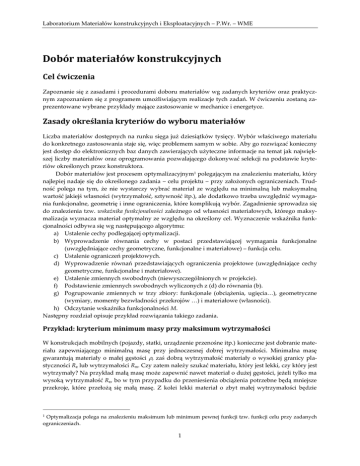 Laboratorium Materiałów konstrukcyjnych i Eksploatacyjnych – P.Wr. – WME Dobór materiałów konstrukcyjnych Cel ćwiczenia Zapoznanie się z zasadami i procedurami doboru materiałów wg zadanych kryteriów oraz praktycznym zapoznaniem się z programem umożliwiającym realizacje tych zadań. W ćwiczeniu zostaną zaprezentowane wybrane przykłady mające zastosowanie w mechanice i energetyce. Zasady określania kryteriów do wyboru materiałów Liczba materiałów dostępnych na runku sięga już dziesiątków tysięcy. Wybór właściwego materiału do konkretnego zastosowania staje się, więc problemem samym w sobie. Aby go rozwiązać konieczny jest dostęp do elektronicznych baz danych zawierających użyteczne informacje na temat jak największej liczby materiałów oraz oprogramowania pozwalającego dokonywać selekcji na podstawie kryteriów określonych przez konstruktora. Dobór materiałów jest procesem optymalizacyjnym1 polegającym na znalezieniu materiału, który najlepiej nadaje się do określonego zadania – celu projektu – przy założonych ograniczeniach. Trudność polega na tym, że nie wystarczy wybrać materiał ze względu na minimalną lub maksymalną wartość jakiejś własności (wytrzymałość, sztywność itp.), ale dodatkowo trzeba uwzględnić wymagania funkcjonalne, geometrię i inne ograniczenia, które komplikują wybór. Zagadnienie sprowadza się do znalezienia tzw. wskaźnika funkcjonalności zależnego od własności materiałowych, którego maksymalizacja wyznacza materiał optymalny ze względu na określony cel. Wyznaczenie wskaźnika funkcjonalności odbywa się wg następującego algorytmu: a) Ustalenie cechy podlegającej optymalizacji. b) Wyprowadzenie równania cechy w postaci przedstawiającej wymagania funkcjonalne (uwzględniające cechy geometryczne, funkcjonalne i materiałowe) – funkcja celu. c) Ustalenie ograniczeń projektowych. d) Wyprowadzenie równań przedstawiających ograniczenia projektowe (uwzględniające cechy geometryczne, funkcjonalne i materiałowe). e) Ustalenie zmiennych swobodnych (niewyszczególnionych w projekcie). f) Podstawienie zmiennych swobodnych wyliczonych z (d) do równania (b). g) Pogrupowanie zmiennych w trzy zbiory: funkcjonale (obciążenia, ugięcia…), geometryczne (wymiary, momenty bezwładności przekrojów …) i materiałowe (własności). h) Odczytanie wskaźnika funkcjonalności M. Następny rozdział opisuje przykład rozwiązania takiego zadania. Przykład: kryterium minimum masy przy maksimum wytrzymałości W konstrukcjach mobilnych (pojazdy, statki, urządzenie przenośne itp.) konieczne jest dobranie materiału zapewniającego minimalną masę przy jednoczesnej dobrej wytrzymałości. Minimalna masę gwarantują materiały o małej gęstości , zaś dobrą wytrzymałość materiały o wysokiej granicy plastyczności Re lub wytrzymałości Rm. Czy zatem należy szukać materiału, który jest lekki, czy który jest wytrzymały? Na przykład małą masę może zapewnić nawet materiał o dużej gęstości, jeżeli tylko ma wysoką wytrzymałość Re, bo w tym przypadku do przeniesienia obciążenia potrzebne będą mniejsze przekroje, które przełożą się małą masę. Z kolei lekki materiał o zbyt małej wytrzymałości będzie 1 Optymalizacja polega na znalezieniu maksimum lub minimum pewnej funkcji tzw. funkcji celu przy zadanych ograniczeniach. 1 Laboratorium Materiałów konstrukcyjnych i Eksploatacyjnych – P.Wr. – WME wymagał większych przekrojów, co może zniwelować wpływ malej na masę konstrukcji. Może lepszym rozwiązaniem będzie znalezienie materiału o najwyższym stosunku Re/? Rys. 1. Schemat obciążenia i utwierdzeń dla wału, dla którego należy dobrać materiał na gwarantujący minimalną masę przy jednoczesnej dobrej wytrzymałości. Aby ten problem rozwiązać należy wyznaczyć odpowiedni do danego zadania wskaźnik funkcjonalności, który pomoże w wyborze właściwego materiału. Rozważmy wał (rys.1.) o końcach zamocowanych w łożyskach obciążony w środku siłą P. Załóżmy, że narzuconym warunkiem konstrukcyjnymi jest długość l, zaś średnica d jest jeszcze nieznana (zmienna swobodna). Zastosujmy do tego wspomniany poprzednio algorytm. (a) Zgodnie z warunkami zadania wielkością podlegającą optymalizacji jest masa wału, która ma osiągać wartość minimalną czyli m min. (b) Masa belki dana jest wzorem 𝑚= (c) 𝜋𝑑 2 𝑙𝜌 4 (1) Ograniczeniem projektowym jest wytrzymałość belki czyli maksymalne naprężenia w wale max, które nie powinny przekraczać wartości dopuszczalnych kz = Re/X, ( X – współczynnik bezpieczeństwa) 𝜎𝑚𝑎𝑥 ≤ 𝑘𝑧 = 𝑅𝑒 /𝑋. (2) (d) Maksymalne naprężenie max, w tak obciążonym i utwierdzonym wale dane jest równaniem: 𝜎𝑚𝑎𝑥 = 𝑀𝑔 16 𝑃𝑙 𝑅𝑒 = ≤ , 𝑤𝑚𝑎𝑥 𝜋 𝑑3 𝑋 (3) gdzie 𝑤𝑚𝑎𝑥 = 𝜋𝑑 3 /32 jest wskaźnikiem na zginanie przekroju kołowego zaś Mg = Pl/2 momentem zginającym. (e) W obu równaniach (1 i 3) nieznana zmienną (zmienną swobodną), którą trzeba wyrugować jest d a wylicza się ją z (3). 3 𝑑=√ 16 𝑋𝑃𝑙 . 𝜋𝑅𝑒 (4) (f) Wyliczoną zmienną swobodną d daną teraz równaniem (4) wstawia się do (1). (g) Ostatecznie, po przekształceniach, równanie na masę wałka ma postać 3 𝑚 = [(𝑃𝑋)2/3 ]( √4𝜋 𝑙 5/3 ) ( 𝜌 2/3 𝑅𝑒 ) = 𝑐𝑜𝑛𝑠𝑡 ∙ 𝜌 2/3 𝑅𝑒 . (5) (h) Po prawej stronie równania (5) dwa pierwsze czynniki, ujęte w nawiasy, grupują parametry funkcjonalne (obciążenie P i współczynnik bezpieczeństwa X) oraz geometryczne (długość wałka l), które są dla określonego zadania stałe gdyż wynikają z założeń projektowych. Ostatni czynnik, czyli 𝜌 2/3 𝑅𝑒 = 𝑀𝑅−1 2 (6) Laboratorium Materiałów konstrukcyjnych i Eksploatacyjnych – P.Wr. – WME reprezentuje własności materiałowe a jego odwro