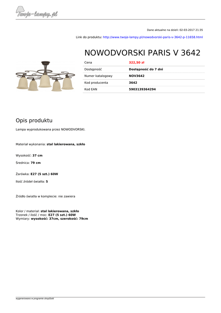 Dane aktualne na dzień: 02-03-2017 21:35 Link do produktu: http://www.twoje-lampy.pl/nowodvorski-paris-v-3642-p-11658.html NOWODVORSKI PARIS V 3642 Cena 322,50 zł Dostępność Dostępność do 7 dni Numer katalogowy NOV3642 Kod producenta 3642 Kod EAN 5903139364294 Opis produktu Lampa wyprodukowana przez NOWODVORSKI. Materiał wykonania: stal lakierowana, szkło Wysokość: 37 cm Średnica: 79 cm Żarówka: E27 (5 szt.) 60W Ilość źródeł światła: 5 Źródło światła w komplecie: nie zawiera Kolor / materiał: stal lakierowana, szkło Trzonek / ilość / moc: E27 (5 szt.) 60W Wymiary: wysokość: 37cm, szerokość: 79cm wygenerowano w programie shopGold Powered by TCPDF (www.tcpdf.org)