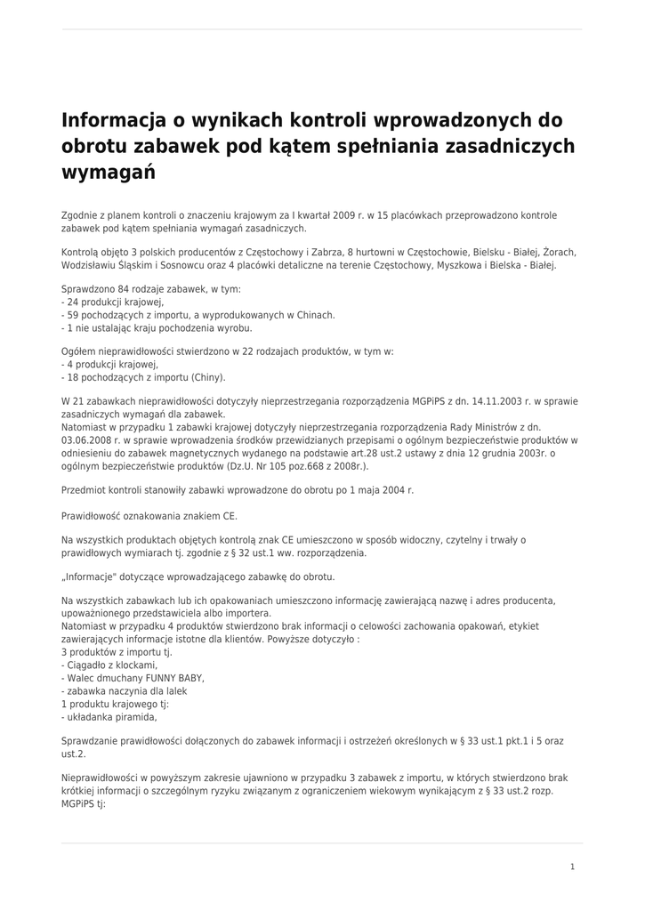 Informacja o wynikach kontroli wprowadzonych do obrotu zabawek pod kątem spełniania zasadniczych wymagań Zgodnie z planem kontroli o znaczeniu krajowym za I kwartał 2009 r. w 15 placówkach przeprowadzono kontrole zabawek pod kątem spełniania wymagań zasadniczych. Kontrolą objęto 3 polskich producentów z Częstochowy i Zabrza, 8 hurtowni w Częstochowie, Bielsku - Białej, Żorach, Wodzisławiu Śląskim i Sosnowcu oraz 4 placówki detaliczne na terenie Częstochowy, Myszkowa i Bielska - Białej. Sprawdzono 84 rodzaje zabawek, w tym: - 24 produkcji krajowej, - 59 pochodzących z importu, a wyprodukowanych w Chinach. - 1 nie ustalając kraju pochodzenia wyrobu. Ogółem nieprawidłowości stwierdzono w 22 rodzajach produktów, w tym w: - 4 produkcji krajowej, - 18 pochodzących z importu (Chiny). W 21 zabawkach nieprawidłowości dotyczyły nieprzestrzegania rozporządzenia MGPiPS z dn. 14.11.2003 r. w sprawie zasadniczych wymagań dla zabawek. Natomiast w przypadku 1 zabawki krajowej dotyczyły nieprzestrzegania rozporządzenia Rady Ministrów z dn. 03.06.2008 r. w sprawie wprowadzenia środków przewidzianych przepisami o ogólnym bezpieczeństwie produktów w odniesieniu do zabawek magnetycznych wydanego na podstawie art.28 ust.2 ustawy z dnia 12 grudnia 2003r. o ogólnym bezpieczeństwie produktów (Dz.U. Nr 105 poz.668 z 2008r.). Przedmiot kontroli stanowiły zabawki wprowadzone do obrotu po 1 maja 2004 r. Prawidłowość oznakowania znakiem CE. Na wszystkich produktach objętych kontrolą znak CE umieszczono w sposób widoczny, czytelny i trwały o prawidłowych wymiarach tj. zgodnie z § 32 ust.1 ww. rozporządzenia. „Informacje" dotyczące wprowadzającego zabawkę do obrotu. Na wszystkich zabawkach lub ich opakowaniach umieszczono informację zawierającą nazwę i adres producenta, upoważnionego przedstawiciela albo importera. Natomiast w przypadku 4 produktów stwierdzono brak informacji o celowości zachowania opakowań, etykiet zawierających informacje istotne dla klientów. Powyższe dotyczyło : 3 produktów z importu tj. - Ciągadło z klockami, - Walec dmuchany FUNNY BABY, - zabawka naczynia dla lalek 1 produktu krajowego tj: - układanka piramida, Sprawdzanie prawidłowości dołączonych do zabawek informacji i ostrzeżeń określonych w § 33 ust.1 pkt.1 i 5 oraz ust.2. Nieprawidłowości w powyższym zakresie ujawniono w przypadku 3 zabawek z importu, w których stwierdzono brak krótkiej informacji o szczególnym ryzyku związanym z ograniczeniem wiekowym wynikającym z § 33 ust.2 rozp. MGPiPS tj: 1 - Zabawki przytulanka (lalka), - Lalki Sally Ann Collection, - zabawki naczynia dla lalek Niezależnie od powyższego w stosunku do trzech rodzajów zabawek tj: - zabawka pluszowa „słoń Oskar duży" - zabawka pluszowa „pies R" - zabawka pluszowa „misiu Kuba średni" wniesiono zastrzeżenia co do określenia grupy wiekowej, dla której zabawki zostały przeznaczone, gdyż wszystkie zostały zakwalifikowane przez kontrolowanego producenta dla dzieci powyżej 3 lat. Biorąc pod uwagę punkt 1 normy PN-EN 71-1:2006 Bezpieczeństwo zabawek. Część 1: Właściwości mechaniczne i fizyczne" oraz normę PKN-CEN/CR 14379;2007 „Klasyfikacja zabawek- wytyczne", w/wym. zabawki jako zabawki wypychane miękkie o prostej budowie powinny być przeznaczone dla dzieci w wieku poniżej 36 miesięcy. Wprowadzający do obrotu dostosował oznakowanie w/wym. zabawek klasyfikując je dla dzieci poniżej 36 m-cy. Nieprawidłowości wynikające z norm zharmonizowanych i rozporządzenia Rady Ministrów z dn. 03.06.2008 r. w sprawie wprowadzenia środków przewidzianych przepisami o ogólnym bezpieczeństwie produktów w odniesieniu do zabawek magnetycznych. W tym zakresie zakwestionowano łącznie 6 produktów (5 zabawek z importu i 1 zabawka wyprodukowana w kraju) z uwagi na nieprzestrzeganie: - pkt. 7.17 normy PN-EN 71-1:2006 „Bezpieczeństwo zabawek. Część 1: Właściwości mechaniczne i fizyczne". Powyższe stwierdzono w 3 rodzajach zabawek pluszowych (lalka), gdzie brak było ostrzeżenia "Ostrożnie! Nieodpowiednie dla dzieci w wieku poniżej 10 miesięcy ze względu na długie włosy". - pkt. 7.1.1 normy PN-EN 62115:2005 (U) „Bezpieczeństwo zabawek elektrycznych". Powyższe stwierdzono w zabawce bateryjnej - Telefon na baterie, gdzie w przedziale dla baterii nieprawidłowo oznaczono ich biegunowość. - pkt. 7.12 normy PN-EN 71-1:2006 „Bezpieczeństwo zabawek. Część 1: Właściwości mechaniczne i fizyczne". Powyższe stwierdzono w zabawce - Gryzak wodny "SMIKI". gdzie uwidoczniono niezgodny zapis w instrukcji użycia podano : „schładzać w lodówce", winno być „schładzać tylko w domowej chłodziarce, nie wkładać do komory" - § 3.1 rozporządzenia Rady Ministrów z dn. 03.06.2008 r. w sprawie wprowadzenia środków przewidzianych przepisami o ogólnym bezpieczeństwie produktów w odniesieniu do zabawek magnetycznych. Powyższe stwierdzono w o przypadku zabawki cyferki magnetyczne do nauki liczenia, gdzie brak było ostrzeżenia o treści: Uwaga! Zabawka zawiera magnesy lub części magnetyczne. Magnesy przyciągnięte do siebie lub przywierające do przedmiotu metalowego w organizmie mogą być przyczyną poważnych, a nawet śmiertelnych obrażeń. W przypadku połknięcia magnesów lub wprowadzenia ich do dróg oddechowych należy natychmiast zwrócić się o pomoc lekarską". Zgodność badanych zabawek z wymaganiami określonymi w § 21 - § 27 ww. rozporządzenia. Nieprawidłowości wynikające z naruszenia § 21 (całkowity lub częściowy brak instrukcji niezbędnej ze względów bezpieczeństwa) stwierdzono w odniesieniu do 3 zabawek bateryjnych tj: - Zestaw kuchenny - ekspres do kawy, - Miecz, - Muzyczna układanka. §23 ust.2 został naruszony w odniesieniu do zabawki Zestaw do zabawy - deska do prasowania będącej miniaturą urządzeń sprzętu przeznaczonego dla dorosłych, gdzie ujawniono brak instrukcji używania zabawki, w k