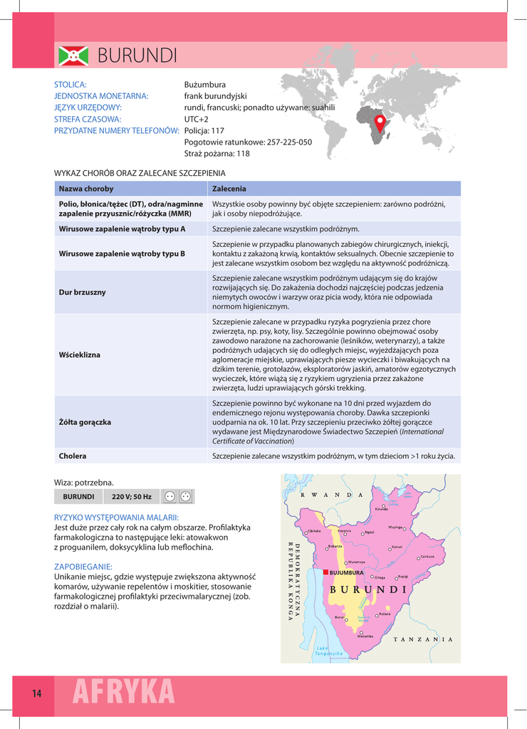 BURUNDI STOLICA: Bużumbura JEDNOSTKA MONETARNA: frank burundyjski JĘZYK URZĘDOWY: rundi, francuski; ponadto używane: suahili STREFA CZASOWA: UTC+2 PRZYDATNE NUMERY TELEFONÓW: Policja: 117 Pogotowie ratunkowe: 257-225-050 Straż pożarna: 118 WYKAZ CHORÓB ORAZ ZALECANE SZCZEPIENIA Nazwa choroby Zalecenia Polio, błonica/tężec (DT), odra/nagminne zapalenie przyusznic/różyczka (MMR) Wszystkie osoby powinny być objęte szczepieniem: zarówno podróżni, jak i osoby niepodróżujące. Wirusowe zapalenie wątroby typu A Szczepienie zalecane wszystkim podróżnym. Wirusowe zapalenie wątroby typu B Szczepienie w przypadku planowanych zabiegów chirurgicznych, iniekcji, kontaktu z zakażoną krwią, kontaktów seksualnych. Obecnie szczepienie to jest zalecane wszystkim osobom bez względu na aktywność podróżniczą. Dur brzuszny Szczepienie zalecane wszystkim podróżnym udającym się do krajów rozwijających się. Do zakażenia dochodzi najczęściej podczas jedzenia niemytych owoców i warzyw oraz picia wody, która nie odpowiada normom higienicznym. Wścieklizna Szczepienie zalecane w przypadku ryzyka pogryzienia przez chore zwierzęta, np. psy, koty, lisy. Szczególnie powinno obejmować osoby zawodowo narażone na zachorowanie (leśników, weterynarzy), a także podróżnych udających się do odległych miejsc, wyjeżdżających poza aglomeracje miejskie, uprawiających piesze wycieczki i biwakujących na dzikim terenie, grotołazów, eksploratorów jaskiń, amatorów egzotycznych wycieczek, które wiążą się z ryzykiem ugryzienia przez zakażone zwierzęta, ludzi uprawiających górski trekking. Żółta gorączka Szczepienie powinno być wykonane na 10 dni przed wyjazdem do endemicznego rejonu występowania choroby. Dawka szczepionki uodparnia na ok. 10 lat. Przy szczepieniu przeciwko żółtej gorączce wydawane jest Międzynarodowe Świadectwo Szczepień (International Certificate of Vaccination) Cholera Szczepienie zalecane wszystkim podróżnym, w tym dzieciom >1 roku życia. Wiza: potrzebna. BURUNDI 220 V; 50 Hz ZAPOBIEGANIE: Unikanie miejsc, gdzie występuje zwiększona aktywność komarów, używanie repelentów i moskitier, stosowanie farmakologicznej profilaktyki przeciwmalarycznej (zob. rozdział o malarii). 14 AFRYKA DE M O K R AT YC Z NA REPUBLIKA KONGA RYZYKO WYSTĘPOWANIA MALARII: Jest duże przez cały rok na całym obszarze. Profilaktyka farmakologiczna to następujące leki: atowakwon z proguanilem, doksycyklina lub meflochina.