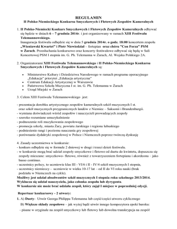 REGULAMIN II Polsko-Niemieckiego Konkursu Smyczkowych i Fletowych Zespołów Kameralnych 1. II Polsko-Niemiecki Konkurs Smyczkowych i Fletowych Zespołów Kameralnych odbywać się będzie w dniach 6 – 7 grudnia 2014r. i jest organizowany w ramach XIII Festiwalu Telemannowskiego. Inauguracja festiwalu odbędzie się w dniu 5 grudnia 2014r. o godz. 18:00 koncertem zespołu „Wieniawski Kwartet” i Piotr Niewiedział – fortepian oraz chóru ”Con Forza” PSM w Żarach. Przesłuchania konkursowe oraz koncerty festiwalowe odbywać się będą w Sali Koncertowej PSM I stopnia im. G. Ph. Telemanna w Żarach, Al. Wojska Polskiego 2A. 2. Organizatorami XIII Festiwalu Telemannowskiego i II Polsko-Niemieckiego Konkursu Smyczkowych i Fletowych Zespołów Kameralnych są: Ministerstwo Kultury i Dziedzictwa Narodowego w ramach programu operacyjnego „Edukacja” priorytet „Edukacja artystyczna” Centrum Edukacji Artystycznej w Warszawie Państwowa Szkoła Muzyczna I st. im. G. Ph. Telemanna w Żarach Urząd Miejski w Żarach 3. Celem XIII Festiwalu Telemannowskiego jest: - prezentacja dorobku artystycznego zespołów kameralnych szkół muzycznych I st. oraz szkół muzycznych przygranicznych landów z Niemiec – Saksonii i Brandenburgii. - wymiana doświadczeń wśród zespołów i nauczycieli prowadzących zespoły - szeroko rozumiane umuzykalnienie - podnoszenie roli muzykowania zespołowego - promocja szkoły, miasta Żary, powiatu żarskiego i regionu lubuskiego - podniesienie rangi i poziomu nauczania gry zespołowej - porównanie dydaktyki zespołowej w Polsce i Niemczech poprzez twórczą dyskusję 4. Zasady uczestnictwa w konkursie: - konkurs odbędzie się w formule 2 dniowej w drugi i trzeci dzień festiwalu. - w konkursie mogą brać udział zespoły smyczkowe i fletowe od duetu do kwintetu, dopuszcza się zespoły mieszane: smyczkowo- fletowe, również z towarzyszeniem fortepianu i akordeonu – jako basso continuo. - uczestnicy polscy, to uczniowie klas III - VI/6 i II - IV/4 szkół muzycznych I stopnia, - uczestnicy niemieccy - uczniowie w wieku 10-17 lat – od II do VI roku nauki (brak podziału w Niemczech na cykle). Możliwy jest udział absolwentów szkół muzycznych I stopnia roku szkolnego 2013/2014. Wyklucza się udział nauczyciela, jako członka zespołu lub dyrygenta. W konkursie nie może brać udziału zespół, który zajął I miejsce w poprzedniej edycji. Repertuar konkursowy - 2 utwory: 1. A) Duety- Utwór Georga Philippa Telemanna lub część/części utworu cyklicznego B) Większe składy zespołowe – jak wyżej bądź utwór innego kompozytora epoki baroku: - pisane w oryginale na zespół smyczkowy lub fletowy lub dowolna transkrypcja na zespół smyczkowy, fletowy bądź mieszany – smyczkowo-fletowy. 2. 1 lub 2 utwory dowolne do wyboru przez nauczyciela prowadzącego Czas trwania programu – 6-10 min. - laureaci konkursu zobowiązani są do nieodpłatnego uczestnictwa w Koncercie Laureatów, uczestnicy konkursu wyrażają zgodę na rejestrację audio i video oraz dokumentację zdjęciową występów konkursowych i w ramach Koncertu Laureatów, które będą wykorzystywane w realizacji płyty DVD i materiałach promocyjnych szkoły. Warunkiem udziału w Festiwalu jest dostarczenie organizatorom wypełnionej (komputerowo) karty zgłoszenia wraz z dowodem wpłaty wpisowego w wysokości 100 zł. od zespołu do 6 listopada 2014 r. (termin ostateczny). W razie rezygnacji zespołu wpisowe nie podlega zwrotowi. Z UWAGI NA OGRANICZENIE CZASOWE – 2 DNI PRZESŁUCHAŃ, MAKSYMALNA ILOŚĆ WYSTĘPUJĄCYCH W KONKURSIE ZESPOŁÓW – Z POLSKI – 30, Z NIEMIEC – 12. O przyjęciu decyduje czas wpływu kart zgłoszenia z wpisowym do PSM wg kolejności nadsyłanych zgłoszeń – nie data stempla pocztowego, dlatego najlepszą możliwością jest wysłanie scanu. Wpisowe należy wpłacić na wyznaczone w ramach programu operacyjnego MKiDN konto z dopiskiem „Konkurs Kameralny – nazwa zespołu i szkoła”. Państwowa Szkoła Muzyczna I st. im. G. Ph. Telemanna w Żarach NBP o/Zielona Góra Nr konta 51 1010 1704 0033 3313 9134 0000 Karta zgłoszenia dostępna również na stronie internetowej szkoły - www.psm.zary.pl Przesłanie karty zgłoszenia oznacza akceptację Regulaminu Konkursu . Zgłoszenia wraz z dowodem wpłaty można przesłać: - pocztą elektroniczną – scan - na adres: [email protected] lub - faxem na nr 68 363 44 13 lub - zwykłą pocztą na adres Państwowej Szkoły Muzycznej I st. w Żarach 5. Przesłuchania festiwalowe odbywać się będą w kolejności ustalonej przez organizatorów i podane do szkół muzycznych wraz z harmonogramem występów i planem XIII Festiwalu Telemannowskiego w terminie do 21 listopada 2014r. poprzez umieszczenie na stronie internetowej PSM I stopnia w Żarach oraz drogą mailową. 6. Występy zespołów oceniać będzie Jury powołane przez Ministra Kultury i Dziedzictwa Narodowego. 7. Decyzje Jury są ostateczne i nieodwołalne. 8. Oprócz przewidywanych nagród finansowych, wybrani laureaci konkursu wystąpią na Koncercie Galowym XIII Festiwalu Telemannowskiego i znajdą się obok innych wykonawców koncertów festiwalowych na płycie DVD, którą również otrzymają po realizacji nagrania i wydaniu płyty droga pocztową. W Konkursie oprócz nagród przewidziane są również wyróżnienia I i II stopnia. Wszystkie zespoły otrzymają dyplomy uczestnictwa, a nagrodzeni dyplom laureata bądź z wyróżnieniem. Nagrody finansowe przeznaczone są dla Laureatów I, II, III miejsca oraz wyróżnień I stopnia. 9. Festiwal i Konkurs są otwarte dla publiczności, wstęp na koncerty jest wolny!!! 10. Biuro Organizacyjne Festiwalu: Państwowa Szkoła Muzyczna I st. im. G. Ph. Telemanna, 68-200 Żary, Al. Wojska Polskiego 2A, Tel/fax 68 363 44 13, e-mail: [email protected], http://www.psm.zary.pl Informujemy, że w dniach 6 i 7 grudnia 2014r. organizowane będą w ramach XIII Festiwalu Telemannowskiego równie