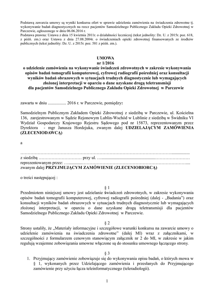 Podstawą zawarcia umowy są wyniki konkursu ofert w sprawie udzielenia zamówienia na świadczenia zdrowotne tj. wykonywanie badań diagnostycznych na rzecz pacjentów Samodzielnego Publicznego Zakładu Opieki Zdrowotnej w Parczewie, ogłoszonego w dniu 06.06.2016 r. Podstawa prawna: Ustawa z dnia 15 kwietnia 2011r. o działalności leczniczej (tekst jednolity: Dz. U. z 2015r. poz. 618, z późń. zm.) oraz Ustawa z dnia 27.08.2004r. o świadczeniach opieki zdrowotnej finansowanych ze środków publicznych (tekst jednolity: Dz. U. z 2015r. poz. 581 z późń. zm.). UMOWA nr 1/2016 o udzielenie zamówienia na wykonywanie świadczeń zdrowotnych w zakresie wykonywania opisów badań tomografii komputerowej, cyfrowej radiografii pośredniej oraz konsultacji wyników badań obrazowych w sytuacjach trudnych diagnostycznie lub wymagających złożonej interpretacji w oparciu o dane uzyskane drogą teletransmisji dla pacjentów Samodzielnego Publicznego Zakładu Opieki Zdrowotnej w Parczewie zawarta w dniu ................. 2016 r. w Parczewie, pomiędzy: Samodzielnym Publicznym Zakładem Opieki Zdrowotnej z siedzibą w Parczewie, ul. Kościelna 136, zarejestrowanym w Sądzie Rejonowym Lublin-Wschód w Lublinie z siedzibą w Świdniku VI Wydział Gospodarczy Krajowego Rejestru Sądowego pod nr 15873, reprezentowanym przez Dyrektora - mgr Janusza Hordejuka, zwanym dalej UDZIELAJĄCYM ZAMÓWIENIA (ZLECENIODAWCĄ) a ……………………………………………………………………………………………................. z siedzibą ………………………… przy ul. …..................................................…………………… reprezentowanym przez: ….............……………………………………………………………….... zwanym dalej PRZYJMUJĄCYM ZAMÓWIENIE (ZLECENIOBIORCĄ) o treści następującej : §1 Przedmiotem niniejszej umowy jest udzielanie świadczeń zdrowotnych, w zakresie wykonywania opisów badań tomografii komputerowej, cyfrowej radiografii pośredniej (dalej - „Badania”) oraz konsultacji wyników badań obrazowych w sytuacjach trudnych diagnostycznie lub wymagających złożonej interpretacji, w oparciu o dane uzyskane drogą teletransmisji dla pacjentów Samodzielnego Publicznego Zakładu Opieki Zdrowotnej w Parczewie. §2 Strony ustaliły, że „Materiały informacyjne i szczegółowe warunki konkursu na zawarcie umowy o udzielenie zamówienia na świadczenia zdrowotne” (dalej MI) wraz z załącznikami, w szczególności z formularzem cenowym stanowiącym załącznik nr 2 do MI, w zakresie w jakim regulują wzajemne zobowiązania umowne włączone są do stosunku umownego łączącego strony. §3 1. Przyjmujący zamówienie zobowiązuje się do wykonywania opisu badań, o których mowa w § 1, wykonanych przez Udzielającego zamówienia i przesłanych do Przyjmującego zamówienie przy użyciu łącza teleinformatycznego (teleradiologii). 1 2. Opisy i konsultacje wykonywane będą: 1) przez lekarzy posiadających odpowiednie kwalifikacje i doświadczenie, co najmniej przez osoby wymienione w wykazie osób załączonym do oferty, 2) zgodnie z obowiązującą wiedzą medyczną i standardami, 3) z zachowaniem najwyższej staranności. 3. Przyjmujący zamówienie zobowiązuje się do przeprowadzenia stosownych szkoleń dla wskazanego przez Udzielającego zamówienia personelu medycznego i technicznego w siedzibie Udzielającego zamówienia, w celu realizacji świadczeń z zakresu diagnostyki obrazowej, zgodnie z obowiązującymi zasadami przy uwzględnieniu najnowszych standardów. 4. Opisy badań oraz konsultacje będą wykonywane i dostarczane Udzielającemu zamówienia całodobowo, przez 7 dni w tygodniu w terminie: 1) opis/konsultacja w trybie zwykłym w ciągu 24 godzin od chwili otrzymania danych, 2) opis/konsultacja w trybie nagłym w ciągu 2 godzin od chwili otrzymania danych, 3) opis/konsultacja badań TK wielourazowych tzw. Polytrauma w ciągu 3 godzin od chwili otrzymania danych. 5. „Chwilę otrzymania danych” strony rozumieją jako datę i godzinę widocznego w systemie PACS potwierdzenia otrzymania kompletnych danych w formie elektronicznej. Każde odstępstwo od opisu zwykłego wymaga potwierdzenia statusu opisu przez Zleceniodawcę. 6. Zleceniobiorca umożliwi dostęp do wyników badań w systemie informatycznym PACS osobom uprawnionym wskazanym przez Zleceniodawcę. 7. Oryginały wyników Badań będą doręczane Zleceniodawcy raz w miesiącu w przeciągu 7 dni od zakończenia miesiąca kalendarzowego pocztą kurierską na koszt Zleceniobiorcy. Zleceniodawca zobowiązuje się zapewnić, iż przesłane przez Zleceniobiorcę oryginały wyników Badań będą przekazane do rąk własnych jednej z osób upoważnionych, o których mowa w § 11 niniejszej Umowy. 8. Zleceniodawca oświadcza, iż dysponuje niezbędną wiedzą, doświadczeniem, personelem oraz warunkami technicznymi i lokalowymi umożliwiającymi należyte wykonanie Umowy. 9. Zleceniodawca umożliwi przeprowadzenie wizji lokalnej i/lub audytu kontrolnego w celu sprawdzenia zastosowania środków bezpieczeństwa informacji przez audytora wskazanego przez Zleceniobiorcę. 10. Zleceniobiorca zapewni zastosowanie środków bezpieczeństwa fizycznego, organizacyjnego oraz technicznego odpowiedniego dla poziomu wysokiego zgodnie z wytycznymi Rozporządzenia Ministra Spraw Wewnętrznych i Administracji z dnia 29 kwietnia 2004 r. w sprawie dokumentacji przetwarzania danych osobowych oraz warunków technicznych i organizacyjnych, jakim powinny odpowiadać urządzenia i systemy informatyczne służące do przetwarzania danych osobowych (Dz. U. z 2004 r. Nr 100, poz. 1024). 11. W razie wątpliwości co do poprawności opisu badania Zleceniodawca może zwrócić się telefonicznie do Zleceniobiorcy o wyjaśnienie wątpliwości. W przypadku niewystarczających wyjaśnień Zleceniodawca może zwrócić się do Zleceniobiorcy o wyjaśnienie pisemne lub