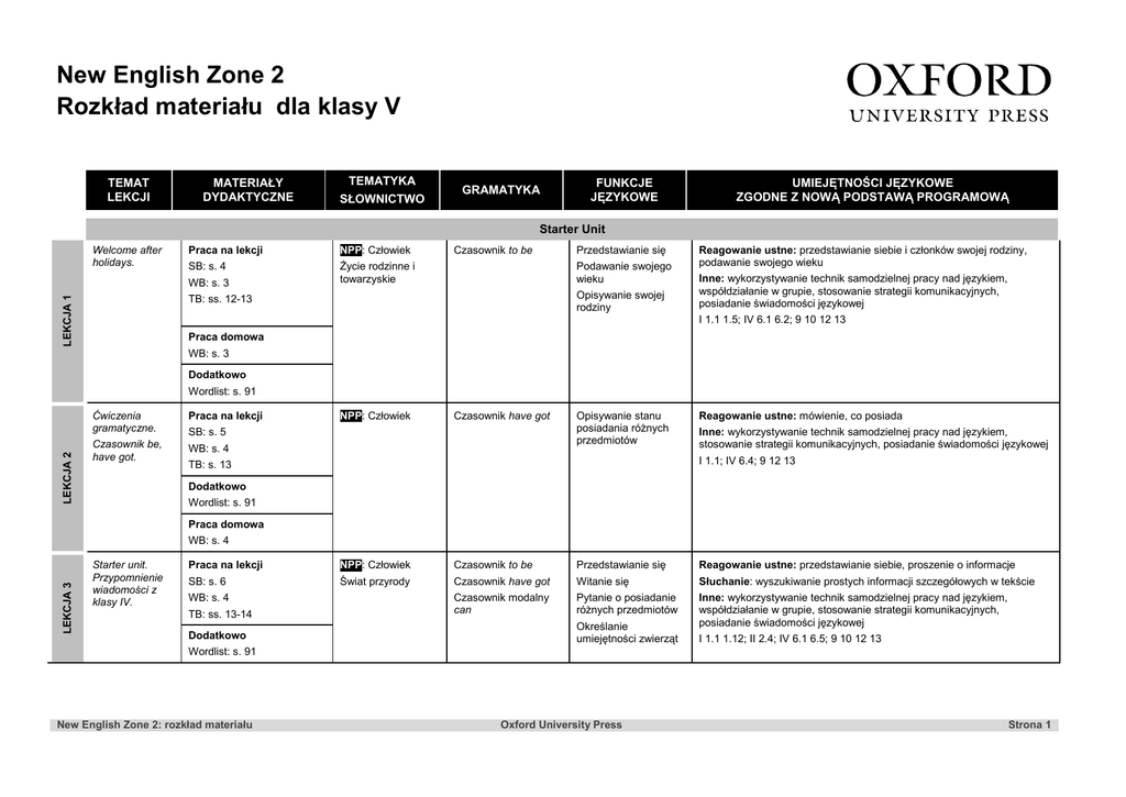 New English Zone 2 Rozkład materiału dla klasy V TEMAT LEKCJI MATERIAŁY DYDAKTYCZNE TEMATYKA SŁOWNICTWO GRAMATYKA FUNKCJE JĘZYKOWE UMIEJĘTNOŚCI JĘZYKOWE ZGODNE Z NOWĄ PODSTAWĄ PROGRAMOWĄ Starter Unit Welcome after holidays. Praca na lekcji NPP: Człowiek SB: s. 4 Życie rodzinne i towarzyskie LEKCJA 1 WB: s. 3 Czasownik to be Przedstawianie się Podawanie swojego wieku Opisywanie swojej rodziny TB: ss. 12-13 Reagowanie ustne: przedstawianie siebie i członków swojej rodziny, podawanie swojego wieku Inne: wykorzystywanie technik samodzielnej pracy nad językiem, współdziałanie w grupie, stosowanie strategii komunikacyjnych, posiadanie świadomości językowej I 1.1 1.5; IV 6.1 6.2; 9 10 12 13 Praca domowa WB: s. 3 Dodatkowo LEKCJA 2 Wordlist: s. 91 Ćwiczenia gramatyczne. Praca na lekcji Czasownik be, have got. WB: s. 4 NPP: Człowiek Czasownik have got SB: s. 5 Opisywanie stanu posiadania różnych przedmiotów Reagowanie ustne: mówienie, co posiada Inne: wykorzystywanie technik samodzielnej pracy nad językiem, stosowanie strategii komunikacyjnych, posiadanie świadomości językowej I 1.1; IV 6.4; 9 12 13 TB: s. 13 Dodatkowo Wordlist: s. 91 Praca domowa LEKCJA 3 WB: s. 4 Starter unit. Przypomnienie wiadomości z klasy IV. Praca na lekcji NPP: Człowiek Czasownik to be Przedstawianie się Reagowanie ustne: przedstawianie siebie, proszenie o informacje SB: s. 6 Świat przyrody Czasownik have got Witanie się Słuchanie: wyszukiwanie prostych informacji szczegółowych w tekście Czasownik modalny can Pytanie o posiadanie różnych przedmiotów Inne: wykorzystywanie technik samodzielnej pracy nad językiem, współdziałanie w grupie, stosowanie strategii komunikacyjnych, posiadanie świadomości językowej WB: s. 4 TB: ss. 13-14 Dodatkowo Określanie umiejętności zwierząt I 1.1 1.12; II 2.4; IV 6.1 6.5; 9 10 12 13 Wordlist: s. 91 New English Zone 2: rozkład materiału Oxford University Press Strona 1 LEKCJA 4 Where are you from? – pytania o różne dane. Praca na lekcji NPP: Człowiek SB: s. 7 WB: s. 5 TB: ss. 14-15 Praca domowa Zaimki pytające Przedstawianie się Pytania szczegółowe w czasie present simple Witanie się Przyimki miejsca i czasu Pytanie o dane osobowe Pytanie o posiadanie różnych przedmiotów Reagowanie ustne: przedstawianie siebie, proszenie o informacje, podawanie swojego wieku. mówienie, co posiada Inne: wykorzystywanie technik samodzielnej pracy nad językiem, współdziałanie w grupie, stosowanie strategii komunikacyjnych, posiadanie świadomości językowej I 1.1; IV 6.16.2 6.4 6.5; 9 10 12 13 Przedimki a/an WB: s. 5 Dodatkowo LEKCJA 5 Wordlist: s. 91 Podawanie godziny. Przedmioty w klasie. Praca na lekcji NPP: Szkoła SB: s. 8 Świat przyrody Liczebniki Podawanie godziny Słuchanie: wyszukiwanie prostych informacji szczegółowych w tekście Liczenie przedmiotów Inne: wykorzystywanie technik samodzielnej pracy nad językiem, współdziałanie w grupie, stosowanie strategii komunikacyjnych, posiadanie świadomości językowej WB: s. 6 TB: ss. 15-16 I 1.3 1.12; II 2.4; 9 10 12 13 Dodatkowo Wordlist: s. 91 Praca domowa WB: s. 6 LEKCJA 6 Me and my family – czytanie ze zrozumieniem, opisywanie ludzi. Praca na lekcji NPP: Człowiek Czas present simple Opisywanie ubrań Słuchanie: wyszukiwanie prostych informacji szczegółowych w tekście SB: s. 9 Życie rodzinne i towarzyskie Czasownik have got Opisywanie siebie i członków swojej rodziny Reagowanie ustne: proszenie o informacje WB: s. 7 TB: s. 16 Czytanie: rozumienie ogólnego sensu tekstu, wyszukiwanie informacji szczegółowych w tekście Mówienie: opisywanie ludzi Dodatkowo Pisanie: opisywanie ludzi Wordlist: s. 91 Reagowanie pisemne: udzielanie podstawowych informacji na swój temat Przetwarzanie tekstu: zapisywanie informacji uzyskanych z tekstu czytanego Praca domowa WB: s. 7 Inne: wykorzystywanie technik samodzielnej pracy nad językiem, współdziałanie w grupie, stosowanie strategii komunikacyjnych, posiadanie świadomości językowej LEKCJA 7 I 1.1 1.5; II 2.4 3.1 3.2; III 4.1 5.1; IV 6.5 7.1; V 8.2; 9 10 12 13 Powtórzenie i utrwalenie materiału przed sprawdzianem z rozdziału Starter. New English Zone 2: rozkład materiału Oxford University Press Strona 2 LEKCJA 8 Sprawdzian obejmujący materiał z rozdziału Starter. LEKCJA 9 UNIT 1 There’s a spider in the bath – czytanie dialogu, zwroty dnia codziennego. Praca na lekcji NPP: Dom SB: s. 10 Przyimki miejsca Określanie położenia Czas present simple WB: s. 8 Słuchanie: rozumienie znaczenia zwrotów dnia codziennego, rozumienie ogólnego sensu prostego tekstu, wyszukiwanie prostych informacji szczegółowych w tekście Czytanie: rozumienie ogólnego sensu tekstu, wyszukiwanie informacji szczegółowych w tekście TB: s. 17 Inne: wykorzystywanie technik samodzielnej pracy nad językiem, współdziałanie w grupie, stosowanie strategii komunikacyjnych, posiadanie świadomości językowej Dodatkowo Wordlist: ss. 91-92 I 1.2; II 2.2 2.3 2.4 3.1 3.2; 9 10 12 13 Praca domowa LEKCJA 10 WB: s. 8 At home – słownictwo związane z domem. Praca na lekcji NPP: Dom SB: s. 11 Przyimki miejsca Czas present simple WB: s. 9 Opisywanie wyposażenia pomieszczeń w domu Słuchanie: rozumienie ogólnego sensu prostego tekstu, wyszukiwanie prostych informacji szczegółowych w tekście Reagowanie ustne: proszenie o informacje Dodatkowo Inne: wykorzystywanie technik samodzielnej pracy nad językiem, współdziałanie w grupie, stosowanie strategii komunikacyjnych, posiadanie świadomości językowej Wordlist: ss. 91-92 I 1.2; II 2.3 2.4; 9 10 12 13 TB: ss. 17-18 Praca domowa LEKCJA 11 WB: s. 9 Language zone – wyrażenie There is/are, przyimki miejsca, przedimki. SB: ss. 12-13 Wyrażenie There is/There are WB: ss. 10-11 Przyimki miejsca TB: ss. 19-20 Przedimki a, an, the Praca na lekcji Praca domowa NPP: Dom Określanie istnienia i położenia przedmiotów w różnych pomieszczeniach Any Słuchanie: wyszukiwanie prostych informacji sz