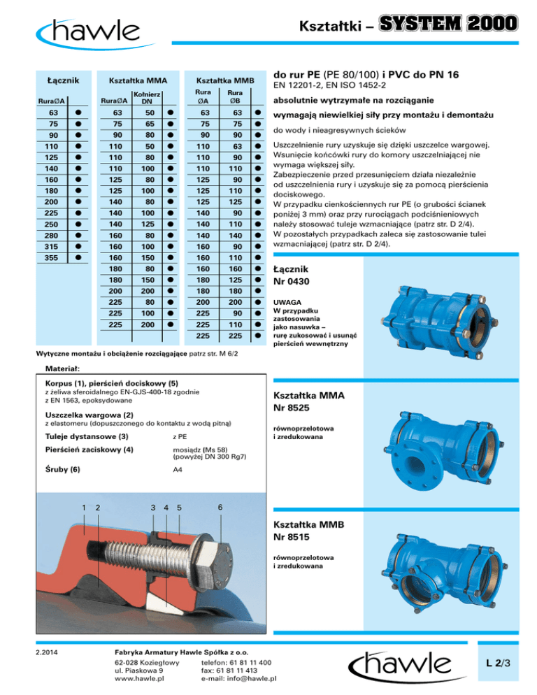 Kszta∏tki – ¸àcznik Ko∏nierz RuraØA DN RuraØA 63 75 90 110 125 140 160 180 200 225 250 280 315 355 w w w w w w w w w w w w w w 63 75 90 110 110 110 125 125 140 140 140 160 160 160 180 180 200 225 225 225 50 65 80 50 80 100 80 100 80 100 125 80 100 150 80 150 200 80 100 200 do rur PE (PE 80/100) i PVC do PN 16 Kszta∏tka MMB Kszta∏tka MMA w w w w w w w w w w w w w w w w w w w w Rura ØA Rura ØB 63 75 90 110 110 110 125 125 125 140 140 140 160 160 160 180 180 200 225 225 225 63 75 90 63 90 110 90 110 125 90 110 140 90 110 160 125 180 200 90 110 225 EN 12201-2, EN ISO 1452-2 absolutnie wytrzyma∏e na rozciàganie w w w w w w w w w w w w w w w w w w w w w wymagajà niewielkiej si∏y przy monta˝u i demonta˝u do wody i nieagresywnych Êcieków Uszczelnienie rury uzyskuje si´ dzi´ki uszczelce wargowej. Wsuni´cie koƒcówki rury do komory uszczelniajàcej nie wymaga wi´kszej si∏y. Zabezpieczenie przed przesuni´ciem dzia∏a niezale˝nie od uszczelnienia rury i uzyskuje si´ za pomocà pierÊcienia dociskowego. W przypadku cienkoÊciennych rur PE (o gruboÊci Êcianek poni˝ej 3 mm) oraz przy rurociàgach podciÊnieniowych nale˝y stosowaç tuleje wzmacniajàce (patrz str. D 2/4). W pozostałych przypadkach zaleca si´ zastosowanie tulei wzmacniajàcej (patrz str. D 2/4). ¸àcznik Nr 0430 UWAGA W przypadku zastosowania jako nasuwka – rur´ zukosowaç i usunàç pierÊcieƒ wewn´trzny Wytyczne monta˝u i obcià˝enie rozciàgajàce patrz str. M 6/2 Materia∏: Korpus (1), pierÊcieƒ dociskowy (5) z ˝eliwa sferoidalnego EN-GJS-400-18 zgodnie z EN 1563, epoksydowane Kszta∏tka MMA Nr 8525 Uszczelka wargowa (2) z elastomeru (dopuszczonego do kontaktu z wodà pitnà) Tuleje dystansowe (3) z PE PierÊcieƒ zaciskowy (4) mosiàdz (Ms 58) (powy˝ej DN 300 Rg7) Âruby (6) A4 1 2 3 4 5 równoprzelotowa i zredukowana 6 Kszta∏tka MMB Nr 8515 równoprzelotowa i zredukowana 2.2014 Fabryka Armatury Hawle Spó∏ka z o.o. 62-028 Kozieg∏owy ul. Piaskowa 9 www.hawle.pl telefon: 61 81 11 400 fax: 61 81 11 413 e-mail: [email protected] L 2/3 Kszta∏tki – Nr 0430 RuraØA L E B 63 75 90 110 125 140 160 180 200 225 250 280 315 355 171 175 181 181 185 197 221 241 261 265 300 306 358 464 80 82 85 85 87 93 105 113 125 128 145 148 174 237 124 138 152 172 193 210 236 258 284 314 347 376 422 472 ¸àcznik Nr 8525 Kszta∏tka MMA równoprzelotowa i zredukowana Nr 8515 równoprzelotowa i zredukowana L 2/4 RuraØA DN L E h 63 75 90 110 110 110 125 125 140 140 140 160 160 160 180 180 200 225 225 225 50 65 80 50 80 100 80 100 80 100 125 80 100 150 80 150 200 80 100 200 236 250 268 240 270 290 274 294 288 308 334 300 320 380 310 415 480 356 376 488 83 85 85 85 85 85 87 87 93 93 93 105 105 105 113 113 130 130 130 130 100 110 140 150 150 150 160 160 170 170 170 180 180 180 200 200 220 220 220 230 RuraØA RuraØB Kszta∏tka MMB Masa kg 3,2 4,0 5,4 6,4 7,8 9,0 12,0 14,5 21,5 26,0 33,0 38,5 58,5 96,0 63 75 90 110 110 110 125 125 125 140 140 140 160 160 160 180 180 200 225 225 225 W odniesieniu do ilustracji, danych technicznych, wymiarów i podanych mas zastrzegamy sobie prawo wnoszenia zmian, wynikajàcych z post´pu technicznego. 63 75 90 63 90 110 90 110 125 90 110 140 90 110 160 125 180 200 90 110 225 L E1 E2 h 236 250 268 240 270 290 274 294 306 288 305 344 310 330 380 360 415 460 356 376 488 83 85 85 85 85 85 87 97 90 93 93 96 105 105 105 113 113 128 128 128 130 83 85 85 80 85 85 85 85 90 85 85 96 85 85 105 87 113 128 85 128 130 118 125 134 140 145 145 150 150 153 158 160 167 170 170 190 180 207,5 230 200 200 244 Masa kg 8,0 9,0 11,0 10,0 11,5 12,0 14,0 14,2 14,8 15,3 16,0 16,5 17,0 20,0 23,0 31,0 47,0 33,5 33,0 55,0 Masa kg 6,0 7,7 9,0 7,7 8,9 9,2 10,4 10,7 15,0 12,2 12,5 19,0 14,1 14,3 16,6 24,0 29,0 35,0 29,5 30,0 55,0 2.2014