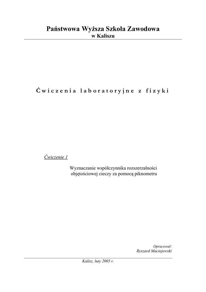 Państwowa Wyższa Szkoła Zawodowa w Kaliszu Ćwiczenia laboratoryjne z fizyki Ćwiczenie 1 Wyznaczanie współczynnika rozszerzalności objętościowej cieczy za pomocą piknometru Opracował: Ryszard Maciejewski Kalisz, luty 2005 r. Ćwiczenie 1 – współczynnik rozszerzalnościα Laboratorium fizyczne PWSZ „Wszystko jest z wody, z wody powstało i z wody się składa” Tales z Miletu (624 – 547 p.n.e.) 1. Część doświadczalna 1.1. Wyznaczanie współczynnika rozszerzalności objętościowej cieczy Materiały i przyrządy: ¾ ¾ ¾ ¾ ¾ wanienka z wodą destylowaną, piknometr, grzałka z termostatem, termometr, badane ciecze Przebieg ćwiczenia. Aby wyznaczyć współczynnik rozszerzalności objętościowej cieczy, należy min. 3 krotne przeprowadzić pomiary i obliczyć wartości średnie mierzonych wielkości. Przebieg czynności: 1. wlej do wanienki przyrządu wody i ustaw termostat pokrętłem na zadaną temperaturę początkową; Uwaga: temperaturę początkową t0 oraz wartości jej przyrostu ∆t poda Ci prowadzący zajęcia, Rys. 1 Widok termostatu przyrządu -2- Ćwiczenie 1 – współczynnik rozszerzalnościα Laboratorium fizyczne PWSZ 2. nalej do piknometru (do pełna!) badanej cieczy, 3. zamknij od góry piknometr korkiem z cienką rurką (kapilarą) na której naniesiona jest podziałka liniowa do odczytu zmiany objętości cieczy, 4. ewentualnie strzykawką dopełnij cieczy (przez rurkę piknometru) do objętości początkowej Vo, tak aby poziom cieczy w kapilarze był na wysokości pierwszej kreski podziałki kapilary, Uwaga! Do obliczeń przyjmij następujące wartości: 9 objętość cieczy w piknometrze (gdy nalejesz do niego do pełna! – patrz pkt.4) V= 131cm3 9 średnica rurki kapilary zamykającej piknometr d=4mm oblicz objętość cieczy w rurce kapilarnej - Vr , oblicz objętość początkową cieczy w piknometrze Vo=V+ Vr, włóż ostrożnie piknometr do wanienki z wodą, sprawdź czy ustaliła się temperatura początkowa t0 wody w wannie, przez czas ok. 3 min. odczytaj 3 krotnie wartości początkowe temperatury t01, t02, t03 i objętości V01, V02, V03, 10. dla następnego pomiaru zwiększ pokrętłem temperaturę ( o przyrost ∆t - podał Ci go na początku prowadzący zajęcia - pkt.1), 11. odczytaj wartości końcowe Vk i tk kolejnego pomiaru i zapisz je do tabeli pomiarowej, 12. pomiary od pkt.8 do pkt.11 powtórz 5 krotnie, 13. oblicz: 13.1. wykorzystując średnią arytmetyczną - wartości średnie temperatury początkowej t0 i objętości początkowej V0 , 13.2. przyrost temperatury ∆t= tk - t0 dla każdego pomiaru, 13.3. przyrost objętości ∆V= Vk - V0 cieczy dla zadanych przyrostów temperatur ∆t, 13.4. współczynnik α rozszerzalności objętościowej cieczy, 14. Odszukaj w tablicach wartość współczynnika α dla cieczy i odpowiadający mu rodzaj cieczy. 15. Wpisz do tabeli rodzaj badanej cieczy i wartość współczynnika α odczytaną z tablic oraz wyznaczoną doświadczalnie, 16. Wykonaj obliczenia rachunku błędów pomiarowych: 5. 6. 7. 8. 9. 9 zasadniczy błąd to pomiar wielkości Vk i tk 9 wartości średnie Vk i tk obliczyć ze wzoru: 9 x śr = 1 n ∑ xi n i =1 - gdzie: n – ilość pomiarów, xi – wynik każdego pomiaru. 9 Obliczyć błąd poszczególnego pomiaru jako odchylenie wartości pomiaru od wartości średniej ze wzoru: εi = xi - xśr -3- Ćwiczenie 1 – współczynnik rozszerzalnościα Laboratorium fizyczne PWSZ 9 Obliczyć odchylenie standardowe (błąd średni kwadratowy średniej wartości) ze wzoru: σs = n 1 ∑ ε i2 n(n − 1) i =1 9 określić błąd odczytu V0, Vk, t0 i tk 9 oblicz błąd maksymalny i minimalny wartości Vk i tk 9 aby wyeliminować błąd paralaksy, oko w chwili odczytywania odpowiedniej podziałki skali winno być umieszczone w płaszczyźnie prostopadłej do skali. Tabela pomiarowa Zaproponowaną tabelę pomiarową możesz powtórzyć 3 krotnie dla trzech zakresów zmian temperatury Rodzaje pomiarów Pomiar 1 Pomiar 2 Pomiar 3 Wartość średnia Objętość początkowa cieczy - Vo [m3] Objętość końcowa cieczy - Vk [m3] Temperatura początkowa – t0 [K] Temperatura końcowa – tk [K] Zmiana temperatury - ∆t [K] Współczynnik rozszerzalności objętościowej cieczy - α [1/K] Doświadczalny α= Odczytany z tablic αt = Rodzaj badanej cieczy 2.2 Ocena błędów 9 Warunkiem koniecznym otrzymania dobrych wyników jest dokładne oczyszczenie piknometru przed każdym napełnieniem cieczą. 9 Każdy pomiar powinno się wykonywać jak najszybciej, aby uniknąć strat spowodowanych parowaniem cieczy. -4- Ćwiczenie 1 – współczynnik rozszerzalnościα Laboratorium fizyczne PWSZ Błędy poszczególnych wyników obliczeń należy liczyć metoda średniej. 9 Błąd współczynnika rozszerzalności objętościowej α można obliczyć metodą różniczki logarytmicznej ∆V α= V0 ⋅ ∆t 9 Wyrażenie logarytmujemy: ln α = ln(∆V ) − ln(V0 ) − ln(∆t ) - następnie różniczkujemy: dα α = d (∆V ) d (V0 ) d (∆t ) − − V0 ∆t ∆V zamieniamy różniczki „d” na przyrosty makroskopowe „ ∆”, a wszystkie znaki „-” na „+” (b ł ę d y s i ę d o d a j ą ) otrzymujemy: ∆α α = ∆ (∆V ) ∆ (V0 ) ∆ (∆t ) + + V0 ∆t ∆V Ostatecznie mamy: ⎛ ∆ (∆V ) ∆ (V0 ) ∆ (∆t ) ⎞ ⎟ ∆α = α ⋅ ⎜⎜ + + V0 ∆t ⎟⎠ ⎝ ∆V ale: ∆(∆t )= 2*∆t, więc: ⎛ 2 ⋅ (∆V ) ∆ (V0 ) 2 ⋅ (∆t ) ⎞ ⎟⎟ ∆α = α ⋅ ⎜⎜ + + V V t ∆ ∆ 0 ⎝ ⎠ 9 Błędy poszczególnych pomiarów są równe dokładności mierzenia. 9 Pęcherzyki powietrza są znacznym źródłem błędu – postaraj się je usunąć! 2.3 Pojęcia kluczowe Gęstość ciała, ciężar ciała, ciężar właściwy, zależność gęstości od temperatury, rozszerzalność termiczna cieczy, zasada działania termometrów cieczowych, anomalna rozszerzalność wody, energia kinetyczna cząstek, zasada działania termostatów. -5- Ćwiczenie 1 – wspó