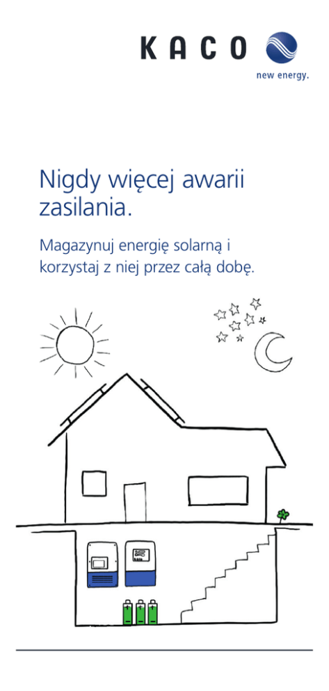 Nigdy więcej awarii zasilania. Magazynuj energię solarną i korzystaj z niej przez całą dobę. Systemy produkcji KACO new energy do magazynowania energii z ogniw solarnych. Korzyści dla użytkownika: zaawansowany poziom niezależności od zewnętrznych źródeł energii i wzrostu cen dzięki korzystaniu z własnej energii solarnej, możliwość doposażenia istniejącej instalacji solarnej w akumulator, przełączanie na tryb awaryjny w przypadku awarii publicznej sieci elektrycznej, ekologiczne zasilanie prądem, monitorowanie instalacji solarnej za pomocą wbudowanego systemu monitoringu, możliwość dopasowania do przyszłych wymagań dzięki inteligentnemu zarządzaniu energią, podniesienie wartości nieruchomości poprzez przyszłościowe zasilanie elektryczne, przyjazny dla klimatu produkt niemieckiej firmy KACO new energy. Zapraszamy do zasięgnięcia informacji na temat Państwa drogi do niezależności solarnej. Dane kontaktowe specjalisty ds. instalacji solarnych w Państwa okolicy znajdują się na odwrocie. Poniedziałek rano: Pan Nowak otwiera oczy i ze zdumieniem stwierdza, że jest wyspany. Spogląda na budzik. Ten radośnie miga i wyświetla godzinę 0:00. O nie! Następne spojrzenie kieruje na zegarek obok: 7:45. Spał dziewięć godzin. Za 15 minut jego syn musi być w szkole, a on sam ma pierwsze spotkanie już za pół godziny. Co się stało? W drodze słucha radia: w nocy nastąpiła awaria sieci elektrycznej, która trwała godzinę i dotknęła całe miasto. (Teraz powoli – za rogiem zamontowany jest fotoradar). Jego koledzy również przychodzą do pracy spóźnieni, awaria wprowadziła bowiem chaos w rozkładzie jazdy kolei miejskiej. Musi przesunąć spotkanie i uspokoić klientów. A wszystko to na pusty żołądek. Co teraz? W drodze do domu pan Nowak kupuje budzik na baterie. Dzwoni żona: „Cześć kochanie! Ryba rozmroziła się w zamrażarce i nie nadaje się do jedzenia. Skoczysz jeszcze szybko do sklepu?” – Co też czyni. „Nigdy więcej jakichkolwiek półśrodków,” myśli. Oddaje budzik na baterie do sklepu i umawia się na spotkanie ze swoim elektrykiem. Poniedziałek rano: Pan Nowak otwiera oczy i ze zdumieniem stwierdza, że jest wyspany. Spogląda na budzik. Ten radośnie miga i wyświetla godzinę 0:00. O nie! Następne spojrzenie kieruje na zegarek obok: 7:45. Spał dziewięć godzin. Za 15 minut jego syn musi być w szkole, a on sam ma pierwsze spotkanie już za pół godziny. Co się stało? Po drodze słucha radia: w nocy nastąpiła awaria sieci elektrycznej, która trwała godzinę i dotknęła całe miasto. (Teraz powoli – za rogiem zamontowany jest fotoradar). Jego koledzy również przychodzą do pracy spóźnieni, awaria wprowadziła bowiem chaos w rozkładzie jazdy kolei miejskiej. Musi przesunąć spotkanie i uspokoić klientów. A wszystko to na pusty żołądek. Co teraz? W drodze do domu pan Nowak kupuje budzik na baterie. Dzwoni żona: „Cześć kochanie! Ryba rozmroziła się w zamrażarce i nie nadaje się do jedzenia. Skoczysz jeszcze szybko do sklepu?” – Co też czyni. „Nigdy więcej jakichkolwiek półśrodków,” myśli. Oddaje budzik na baterie do sklepu i umawia się na spotkanie ze swoim elektrykiem. Co dalej? Najlepsze na koniec. Niedziela wieczór, dwa miesiące później: jest burza, u sąsiadów Nowaków gaśnie nagle światło w całym domu. Awaria zasilania? Pan Nowak schodzi do piwnicy do swoich nowych „zabawek”. Rodzina Nowaków rękę produkuje teraz energię z ogniw solarnych na dachu i gromadzi ją w akumulatorze. Rodzina wykorzystuje energię solarną również bezpośrednio na potrzeby własnego gospodarstwa domowego. Przy zużyciu wynoszącym 4000 kWh rocznie może zastąpić 60% energii pobieranej z zakładu energetycznego energią z własnej instalacji solarnej (o mocy 5 kW). Spogląda na wyświetlacz falownika akumulatora. Rzeczywiście: tryb awaryjny. Do tego urządzenie pobiera energię zgromadzoną w akumulatorze i dostarcza ją do wszystkich sprzętów domowych. Za dnia falownik solarny typu blueplanet przetwarza prąd stały z ogniw solarnych na „gotowy do użycia” prąd zmienny. Więcej o KACO new energy. KACO new energy GmbH Carl-Zeiss-Straße 1 74172 Neckarsulm Niemcy Tel.: +49 7132 3818 333 Faks: +49 7132 3818 703 [email protected] www.kaco-newenergy.com PL 5000982_01_151102 Twój Doradca.