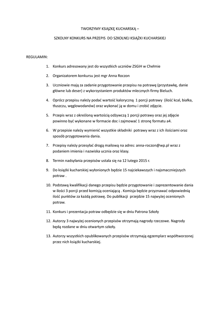TWORZYMY KSIĄZKĘ KUCHARSKĄ – SZKOLNY KONKURS NA PRZEPIS DO SZKOLNEJ KSIĄŻKI KUCHARSKIEJ REGULAMIN: 1. Konkurs adresowany jest do wszystkich uczniów ZSGiH w Chełmie 2. Organizatorem konkursu jest mgr Anna Roczon 3. Uczniowie mają za zadanie przygotowanie przepisu na potrawę (przystawkę, danie główne lub deser) z wykorzystaniem produktów mlecznych firmy Bieluch. 4. Oprócz przepisu należy podać wartość kaloryczną 1 porcji potrawy (ilość kcal, białka, tłuszczu, węglowodanów) oraz wykonać ją w domu i zrobić zdjęcie. 5. Przepis wraz z określoną wartością odżywczą 1 porcji potrawy oraz jej zdjęcie powinno być wykonane w formacie doc i zajmować 1 stronę formatu a4. 6. W przepisie należy wymienić wszystkie składniki potrawy wraz z ich ilościami oraz sposób przygotowania dania. 7. Przepisy należy przesyłać drogą mailową na adres: [email protected] wraz z podaniem imienia i nazwiska ucznia oraz klasy. 8. Termin nadsyłania przepisów ustala się na 12 lutego 2015 r. 9. Do książki kucharskiej wyłonionych będzie 15 najciekawszych i najsmaczniejszych potraw . 10. Podstawą kwalifikacji danego przepisu będzie przygotowanie i zaprezentowanie dania w ilości 3 porcji przed komisją oceniającą . Komisja będzie przyznawać odpowiednią ilość punktów za każdą potrawę. Do publikacji przejdzie 15 najwyżej ocenionych potraw. 11. Konkurs i prezentacja potraw odbędzie się w dniu Patrona Szkoły 12. Autorzy 3 najwyżej ocenionych przepisów otrzymają nagrody rzeczowe. Nagrody będą rozdane w dniu otwartym szkoły. 13. Autorzy wszystkich opublikowanych przepisów otrzymają egzemplarz współtworzonej przez nich książki kucharskiej.