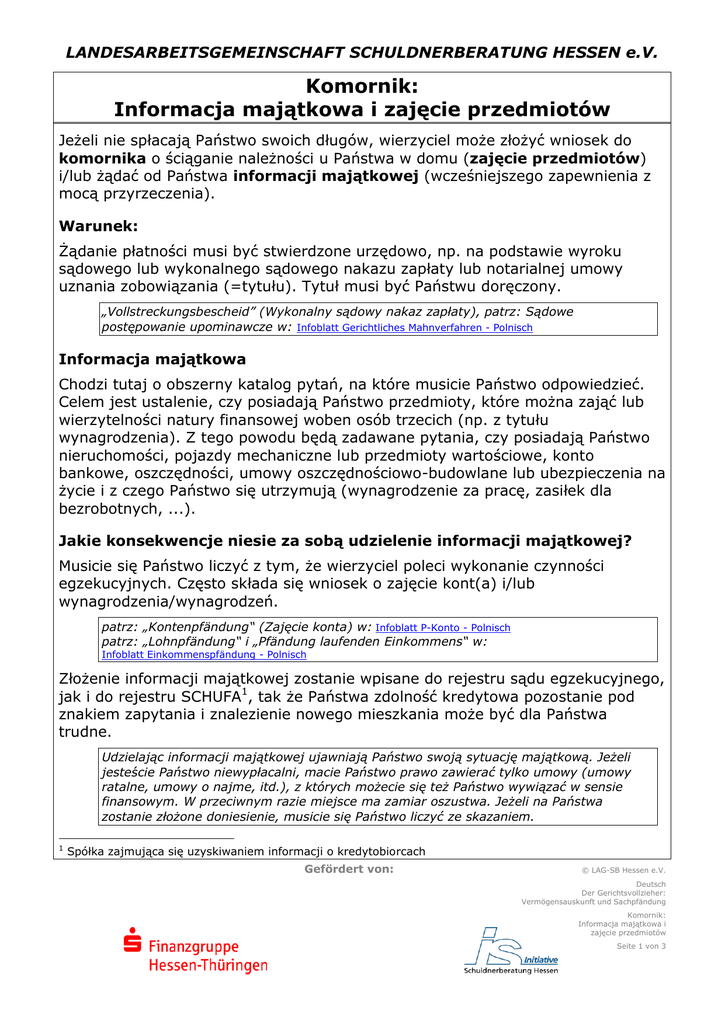 LANDESARBEITSGEMEINSCHAFT SCHULDNERBERATUNG HESSEN e.V. Komornik: Informacja majątkowa i zajęcie przedmiotów Jeżeli nie spłacają Państwo swoich długów, wierzyciel może złożyć wniosek do komornika o ściąganie należności u Państwa w domu (zajęcie przedmiotów) i/lub żądać od Państwa informacji majątkowej (wcześniejszego zapewnienia z mocą przyrzeczenia). Warunek: Żądanie płatności musi być stwierdzone urzędowo, np. na podstawie wyroku sądowego lub wykonalnego sądowego nakazu zapłaty lub notarialnej umowy uznania zobowiązania (=tytułu). Tytuł musi być Państwu doręczony. „Vollstreckungsbescheid” (Wykonalny sądowy nakaz zapłaty), patrz: Sądowe postępowanie upominawcze w: Infoblatt Gerichtliches Mahnverfahren - Polnisch Informacja majątkowa Chodzi tutaj o obszerny katalog pytań, na które musicie Państwo odpowiedzieć. Celem jest ustalenie, czy posiadają Państwo przedmioty, które można zająć lub wierzytelności natury finansowej woben osób trzecich (np. z tytułu wynagrodzenia). Z tego powodu będą zadawane pytania, czy posiadają Państwo nieruchomości, pojazdy mechaniczne lub przedmioty wartościowe, konto bankowe, oszczędności, umowy oszczędnościowo-budowlane lub ubezpieczenia na życie i z czego Państwo się utrzymują (wynagrodzenie za pracę, zasiłek dla bezrobotnych, ...). Jakie konsekwencje niesie za sobą udzielenie informacji majątkowej? Musicie się Państwo liczyć z tym, że wierzyciel poleci wykonanie czynności egzekucyjnych. Często składa się wniosek o zajęcie kont(a) i/lub wynagrodzenia/wynagrodzeń. patrz: „Kontenpfändung“ (Zajęcie konta) w: Infoblatt P-Konto - Polnisch patrz: „Lohnpfändung“ i „Pfändung laufenden Einkommens“ w: Infoblatt Einkommenspfändung - Polnisch Złożenie informacji majątkowej zostanie wpisane do rejestru sądu egzekucyjnego, jak i do rejestru SCHUFA1, tak że Państwa zdolność kredytowa pozostanie pod znakiem zapytania i znalezienie nowego mieszkania może być dla Państwa trudne. Udzielając informacji majątkowej ujawniają Państwo swoją sytuację majątkową. Jeżeli jesteście Państwo niewypłacalni, macie Państwo prawo zawierać tylko umowy (umowy ratalne, umowy o najme, itd.), z których możecie się też Państwo wywiązać w sensie finansowym. W przeciwnym razie miejsce ma zamiar oszustwa. Jeżeli na Państwa zostanie złożone doniesienie, musicie się Państwo liczyć ze skazaniem. 1 Spółka zajmująca się uzyskiwaniem informacji o kredytobiorcach Gefördert von: © LAG-SB Hessen e.V. Deutsch Der Gerichtsvollzieher: Vermögensauskunft und Sachpfändung Komornik: Informacja majątkowa i zajęcie przedmiotów Seite 1 von 3 LANDESARBEITSGEMEINSCHAFT SCHULDNERBERATUNG HESSEN e.V. Informacja majątkowa nie chroni Państwa przed dalszymi próbami egzekucji (długów). Mogą Państwo jednakże poinformować o tym wszystkich wierzycieli, że udzielili Państwo informacji majątkowej. Wierzyciele zastanowią się wtedy, czy obecnie ma sens składanie wniosku o wykonanie czynności egzekucyjnej. Czy muszę złożyć informację majątkową? Tak. Jeżeli się Państwo będziecie wzbraniać, z reguły zostanie przeciwko Państwu wystosowany nakaz aresztowania. Jeżeli nadal jej Państwo nie udzielicie, musicie Państwo pójść do więzienia, jeżeli wierzyciel złoży w tym celu wniosek i uiści opłatę (areszt dłużnika). Jeżeli roszczenia wobec Państwa wynoszą przynajmniej 500 €, komornik może zażądać udzielenia informacji od kasy chorych i od ubezpieczycieli rentowoemerytalnych. Może dowiedzieć się, czy posiadacie Państwo konto bankowe lub czy jest na Państwa zarejestrowany samochód. Czy muszę prawidłowo odpowiedzieć na wszystkie pytania? Tak, w każdym razie tak powinniście Państwo uczynić! Fałszywe odpowiedzi to czyn karalny. Zajęcie przedmiotów Komornik ma za zadanie sprawdzić u państwa w domu, czy istnieją przedmioty, które można zająć. Jeżeli posiadacie Państwo książeczkę oszczędnościową, biżuterię lub papiery wartościowe, zabierze je on ze sobą (zajęcie). W wypadku większych przedmiotów (np. antyków) komornik postawi na tym pieczęć. Przedmiot został wtedy zajęty. Do momentu zabrania go przez komornika, możecie Państwo dalej go używać, ale nie możecie go więcej sprzedać lub podarować. Wszystkie zajęte przedmioty będą sprzedane na publicznej licytacji przez komornika (również przez internet). Stanie się to tylko wtedy, jeżeli dochód pokryje koszty i pozostanie wystarczająco dużo dla komornika. Co zostanie zajęte? Egzekucji nie podlegają przedmioty, których Państwo i Państwa rodzina potrzebuje do życia (odzież, meble, telewizor, środki żywności, medyczne środki pomocnicze, itd.). Zwierzęta domowe nie podlegają egzekucji. Egzekucji nie podlegają również przedmioty, które są nieodzowne w celu pobierania nauki przez Państwa (np. komputer) lub dla potrzeb Państwa pracy (np. Państwa samochód, jeżeli nie ma porównywalnej alternatywy, by móc dotrzeć do miejsca pracy). Gefördert von: © LAG-SB Hessen e.V. Deutsch Der Gerichtsvollzieher: Vermögensauskunft und Sachpfändung Komornik: Informacja majątkowa i zajęcie przedmiotów Seite 2 von 3 LANDESARBEITSGEMEINSCHAFT SCHULDNERBERATUNG HESSEN e.V. W zasadzie przedmiot, który nie podlega zajęciu, ale posiada bardzo wysoką wartość komornik może jednak wymienić. Jeżeli dany przedmiot nie należy do Państwa lub nie został jeszcze opłacony, proszę koniecznie powiedzieć o tym komornikowi. Zwykle on tego przedmiotu wtedy nie zajmie. Jeżeli jednak miałby zabrać przedmiot ze sobą, właścicel może przeciwko temu zastosować środki prawne. Uwaga: Przedmioty, które jeszcze nie zostały zapłacone, dostawca może kazać odebrać (np. dom sprzedaży wysyłkowej, handlarz samochodami) w wypadku zaległości płatniczych, ale i też i w takim wypadku, jeżeli przedmiot z zasady nie podlega egzekucji. Czy zg