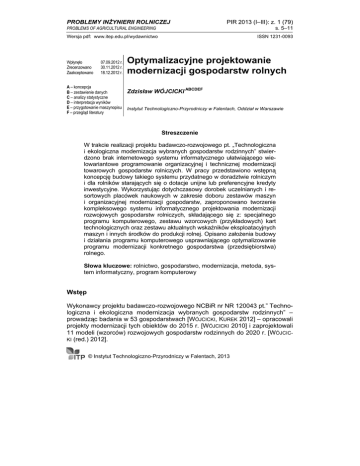 PROBLEMY INŻYNIERII ROLNICZEJ PIR 2013 (I–III): z. 1 (79) s. 5–11 PROBLEMS OF AGRICULTURAL ENGINEERING Wersja pdf: www.itep.edu.pl/wydawnictwo Wpłynęło Zrecenzowano Zaakceptowano 07.09.2012 r. 30.11.2012 r. 18.12.2012 r. A – koncepcja B – zestawienie danych C – analizy statystyczne D – interpretacja wyników E – przygotowanie maszynopisu F – przegląd literatury ISSN 1231-0093 Optymalizacyjne projektowanie modernizacji gospodarstw rolnych Zdzisław WÓJCICKI ABCDEF Instytut Technologiczno-Przyrodniczy w Falentach, Oddział w Warszawie Streszczenie W trakcie realizacji projektu badawczo-rozwojowego pt. „Technologiczna i ekologiczna modernizacja wybranych gospodarstw rodzinnych” stwierdzono brak internetowego systemu informatycznego ułatwiającego wielowariantowe programowanie organizacyjnej i technicznej modernizacji towarowych gospodarstw rolniczych. W pracy przedstawiono wstępną koncepcję budowy takiego systemu przydatnego w doradztwie rolniczym i dla rolników starających się o dotacje unijne lub preferencyjne kredyty inwestycyjne. Wykorzystując dotychczasowy dorobek uczelnianych i resortowych placówek naukowych w zakresie doboru zestawów maszyn i organizacyjnej modernizacji gospodarstw, zaproponowano tworzenie kompleksowego systemu informatycznego projektowania modernizacji rozwojowych gospodarstw rolniczych, składającego się z: specjalnego programu komputerowego, zestawu wzorcowych (przykładowych) kart technologicznych oraz zestawu aktualnych wskaźników eksploatacyjnych maszyn i innych środków do produkcji rolnej. Opisano założenia budowy i działania programu komputerowego usprawniającego optymalizowanie programu modernizacji konkretnego gospodarstwa (przedsiębiorstwa) rolnego. Słowa kluczowe: rolnictwo, gospodarstwo, modernizacja, metoda, system informatyczny, program komputerowy Wstęp Wykonawcy projektu badawczo-rozwojowego NCBiR nr NR 120043 pt.” Technologiczna i ekologiczna modernizacja wybranych gospodarstw rodzinnych” – prowadząc badania w 53 gospodarstwach [WÓJCICKI, KUREK 2012] – opracowali projekty modernizacji tych obiektów do 2015 r. [WÓJCICKI 2010] i zaprojektowali 11 modeli (wzorców) rozwojowych gospodarstw rodzinnych do 2020 r. [WÓJCICKI (red.) 2012]. © Instytut Technologiczno-Przyrodniczy w Falentach, 2013 Zdzisław Wójcicki Autorzy tych projektów i modeli, wykonanych według wspólnie uzgodnionej jednolitej metodyki [WÓJCICKI i in. 2009] z zastosowaniem metody bilansowej i technologicznej, postulowali konieczność usprawnienia metod projektowania modernizacji i rozwoju gospodarstw, informując o działaniach podjętych w tym zakresie w swoich placówkach naukowych [KOCIRA 2012; PARAFINIUK 2012; PEPLIŃSKI 2012; SAWA 2012; TABOR 2012; WÓJCICKI 2012a]. W trakcie realizacji tego projektu stwierdzono brak programu komputerowego usprawniającego wielowariantowe (optymalizacyjne) projektowanie modernizacji towarowych gospodarstw rolnych oraz brak niezbędnego systemu informatycznego do takiego projektowania lub modelowania rolniczych przedsiębiorstw rodzinnych. W skład systemu, poza programem komputerowym, powinny także wchodzić zestawy wzorcowych kart technologicznych i zestawy aktualnych wskaźników eksploatacyjno-ekonomicznych maszyn i innych środków trwałych oraz niezbędnych materiałów do produkcji rolnej. Także realizujący projekt dziedzinowy pt. ”Ocena racjonalności doboru i wykorzystania maszyn i urządzeń rolniczych w gospodarstwach rolnych Lubelszczyzny w kontekście poprawy ich efektywności i konkurencyjności na rynku” [LORENCOWICZ, CUPIAŁ 2012] uważają, że konieczne jest stworzenie nowoczesnej platformy komunikacyjnej z wykorzystaniem technologii internetowych, która umożliwi rolnikom podjęcie właściwych decyzji inwestycyjnych dotyczących techniki rolniczej. Dorobek projektowy w zakresie doboru maszyn i mechanizacji gospodarstw mają też inne placówki badawcze, w tym Instytut Inżynierii Rolniczej i Informatyki Uniwersytetu Rolniczego w Krakowie, w którym opracowano i upowszechniono komputerowy program „Optymalizator Techniki Rolniczej – OTR-7”, przeznaczony do projektowania metodą technologiczną doboru zestawów ciągników i maszyn dla gospodarstw rolnych [CUPIAŁ, KOBUSZEWSKI 2011]. Duże osiągnięcia w zakresie informatyzacji badań i rozwoju inżynierii rolniczej mają odpowiednie katedry i instytuty Uniwersytetów Przyrodniczych w Poznaniu i Lublinie [MAKSYM i in. 2011; WERES 2010]. Dorobek tych i innych ośrodków naukowych będzie wykorzystany jako podstawa nowych rozwiązań projektowych w zakresie technicznej (mechanizacyjnej) modernizacji gospodarstw rolnych. W koncepcji systemu modernizacji gospodarstw przewiduje się powiązanie przemian technicznych z niezbędnymi zmianami organizacyjnymi i agrotechnicznymi, aby powstał kompleksowy system projektowania technologicznej i ekologicznej modernizacji przedsiębiorstw rolniczych. Trzeba również zaktualizować dotychczasową metodykę badania wyposażenia i działalności istniejących i modelowych gospodarstw rolnych. Analizując porównawczo 11 modeli gospodarstw [WÓJCICKI 2012b], stwierdzono zbyt duży, często nieuzasadniony, rozrzut parametrów modernizacji przeliczanych na ha UR i na rbh, wynikający z dowolnego szacowania cen zaopatrzenia i zbytu, nakładów pracy i energii w działalności ogólnogospodarczej, okresów (lat) trwania środków trwałych, nakładów na utrzymanie domu rodziny rolnika i innych. 6 © ITP w Falentach; PIR 2013 (I–III): z. 1 (79) Optymalizacyjne projektowanie modernizacji gospodarstw rolnych Celem niniejszej publikacji jest próba zaprezentowania koncepcji usprawnienia i automatyzowania projektowania modernizacji gospodarstw metodą technologiczno-optymalizacyjną z wykorzystaniem odpowiedniego systemu informatycznego. Opracowany system może być przydatny w doradztwie rolniczym i dla rolników starających się o dotacje unijne lub preferencyjne kredyty 