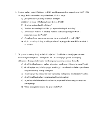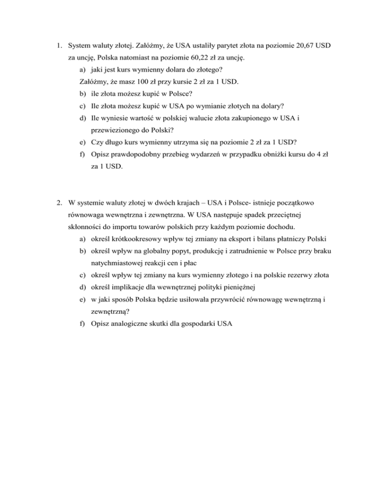 1. System waluty złotej. Załóżmy, że USA ustaliły parytet złota na poziomie 20,67 USD za uncję, Polska natomiast na poziomie 60,22 zł za uncję. a) jaki jest kurs wymienny dolara do złotego? Załóżmy, że masz 100 zł przy kursie 2 zł za 1 USD. b) ile złota możesz kupić w Polsce? c) Ile złota możesz kupić w USA po wymianie złotych na dolary? d) Ile wyniesie wartość w polskiej walucie złota zakupionego w USA i przewiezionego do Polski? e) Czy długo kurs wymienny utrzyma się na poziomie 2 zł za 1 USD? f) Opisz prawdopodobny przebieg wydarzeń w przypadku obniżki kursu do 4 zł za 1 USD. 2. W systemie waluty złotej w dwóch krajach – USA i Polsce- istnieje początkowo równowaga wewnętrzna i zewnętrzna. W USA następuje spadek przeciętnej skłonności do importu towarów polskich przy każdym poziomie dochodu. a) określ krótkookresowy wpływ tej zmiany na eksport i bilans płatniczy Polski b) określ wpływ na globalny popyt, produkcję i zatrudnienie w Polsce przy braku natychmiastowej reakcji cen i płac c) określ wpływ tej zmiany na kurs wymienny złotego i na polskie rezerwy złota d) określ implikacje dla wewnętrznej polityki pieniężnej e) w jaki sposób Polska będzie usiłowała przywrócić równowagę wewnętrzną i zewnętrzną? f) Opisz analogiczne skutki dla gospodarki USA