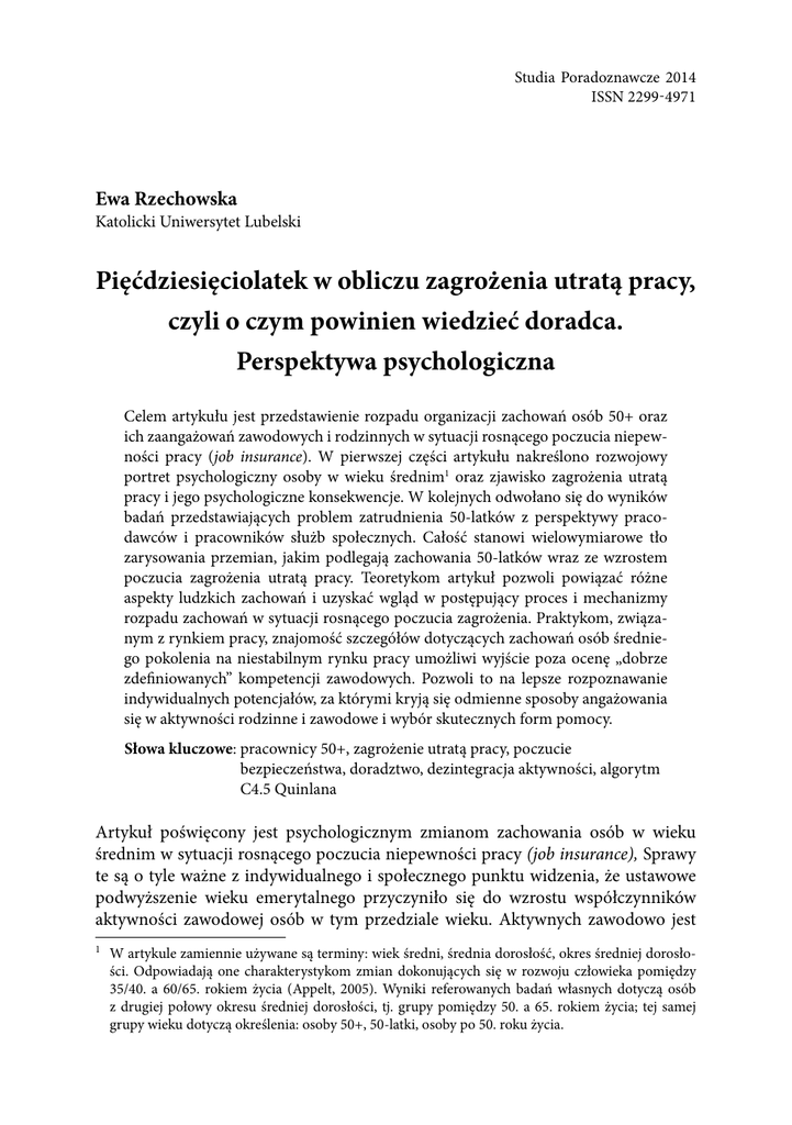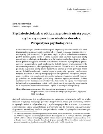 Studia Poradoznawcze 2014 ISSN 2299-4971 Ewa Rzechowska Katolicki Uniwersytet Lubelski Pięćdziesięciolatek w obliczu zagrożenia utratą pracy, czyli o czym powinien wiedzieć doradca. Perspektywa psychologiczna Celem artykułu jest przedstawienie rozpadu organizacji zachowań osób 50+ oraz ich zaangażowań zawodowych i rodzinnych w sytuacji rosnącego poczucia niepewności pracy (job insurance). W pierwszej części artykułu nakreślono rozwojowy portret psychologiczny osoby w wieku średnim1 oraz zjawisko zagrożenia utratą pracy i jego psychologiczne konsekwencje. W kolejnych odwołano się do wyników badań przedstawiających problem zatrudnienia 50-latków z perspektywy pracodawców i pracowników służb społecznych. Całość stanowi wielowymiarowe tło zarysowania przemian, jakim podlegają zachowania 50-latków wraz ze wzrostem poczucia zagrożenia utratą pracy. Teoretykom artykuł pozwoli powiązać różne aspekty ludzkich zachowań i uzyskać wgląd w postępujący proces i mechanizmy rozpadu zachowań w sytuacji rosnącego poczucia zagrożenia. Praktykom, związanym z rynkiem pracy, znajomość szczegółów dotyczących zachowań osób średniego pokolenia na niestabilnym rynku pracy umożliwi wyjście poza ocenę „dobrze zdefiniowanych” kompetencji zawodowych. Pozwoli to na lepsze rozpoznawanie indywidualnych potencjałów, za którymi kryją się odmienne sposoby angażowania się w aktywności rodzinne i zawodowe i wybór skutecznych form pomocy. Słowa kluczowe: pracownicy 50+, zagrożenie utratą pracy, poczucie bezpieczeństwa, doradztwo, dezintegracja aktywności, algorytm C4.5 Quinlana Artykuł poświęcony jest psychologicznym zmianom zachowania osób w wieku średnim w sytuacji rosnącego poczucia niepewności pracy (job insurance), Sprawy te są o tyle ważne z indywidualnego i społecznego punktu widzenia, że ustawowe podwyższenie wieku emerytalnego przyczyniło się do wzrostu współczynników aktywności zawodowej osób w tym przedziale wieku. Aktywnych zawodowo jest 1 W artykule zamiennie używane są terminy: wiek średni, średnia dorosłość, okres średniej dorosłości. Odpowiadają one charakterystykom zmian dokonujących się w rozwoju człowieka pomiędzy 35/40. a 60/65. rokiem życia (Appelt, 2005). Wyniki referowanych badań własnych dotyczą osób z drugiej połowy okresu średniej dorosłości, tj. grupy pomiędzy 50. a 65. rokiem życia; tej samej grupy wieku dotyczą określenia: osoby 50+, 50-latki, osoby po 50. roku życia. 76 Studia Poradoznawcze 2014 54% 50-latków i 44,8% 55-64-latków (MPiPS 2013; Eurostat, 2014). Znacząca część z nich żyje w poczuciu zagrożenia utratą pracy. Pokolenie dzisiejszych 50-latków bezpośrednio na sobie doświadczało rezultatów kolejnych ustrojowych i gospodarczych transformacji, a przedłużający się kryzys gospodarczy i niestabilność rynku pracy nie gwarantują im bezpiecznego zatrudnienia. Potwierdzają to prowadzone badania2. Procesualne ujęcie problemu i zastosowanie Strategii Rekonstruowania Transformacji Procesu (Rzechowska, 2014) pozwoliło ujawnić różne postaci dezintegracji jednostkowych zachowań. Ich analiza stała się podstawą budowania empirycznego modelu odzwierciedlającego postępującą – wraz ze wzrostem poczucia zagrożenia – dezorganizację aktywności 50-latków. Bliższe jej poznanie może być w różny sposób przydatne. Praktykom, związanym z rynkiem pracy, znajomość szczegółów dotyczących aktywności osób średniego pokolenia na niestabilnym rynku pracy umożliwi wyjście poza ocenę „dobrze zdefiniowanych” kompetencji zawodowych. Pozwoli to na lepsze rozpoznawanie indywidualnych potencjałów, za którymi kryją się odmienne sposoby angażowania się w aktywności rodzinne i zawodowe. Badaczom, artykuł da możliwość powiązania różnych aspektów ludzkich zachowań i uzyskania wglądu w proces i mechanizmy ich rozpadu w sytuacji rosnącego poczucia zagrożenia. Dla jednych i drugich może być inspiracją do budowania nowych metod pracy poradniczej, doradczej i badawczej. Psychologiczny portret pracownika w wieku średnim: autonomia, dystans, generatywność, mądrość Okres po 50. roku życia to czas znaczących zmian w rozwoju osobowym człowieka, konfrontacji z samym sobą, dokonywania życiowych bilansów, stawiania pytań o sens życia (Oleś, 2012; Oleś, Batory, 2008; Appelt, 2005). Badacze kreśląc obraz średniej dorosłości, najczęściej przyjmują jedną z perspektyw: eksponują negatywy (m.in. obniżenie sprawności, wydolności, problemy zdrowotne) lub pozytywy (zwracają uwagę na rozwojowy potencjał i znaczące zdolności kompensacyjne 50-latków). Coraz częściej podważany jest fakt istnienia kryzysu wieku średniego (Shweder, 1998; Freund, Ritter, 2009), a w zestawieniach rozwojowych charakterystyk wieku średniego i młodszych pokoleń podkreślany jest iluzoryczny charakter dobrodziejstw młodości (Strenger, Rottenberg, 2008). Pozytywów wieku średniego badacze upatrują w rosnącej autonomii, u której podstaw leży świadomość własnych priorytetów, zdolność do samokontroli i autorefleksji. 2 Pełny opis zrealizowanych badań i stosowanych narzędzi oraz wstępnego opracowania wyników zamieszczony został w: Rzechowska (red.), (2010) Dojrzały pracownik na rynku pracy: Jak zabezpieczyć przed wykluczeniem społecznym osoby 50+? Łącznie zbadano 500 osób 50+, w tym: osoby zagrożone utratą pracy, bezrobotne oraz na wcześniejszej emeryturze (por. przypis 4). Zgromadzona bardzo obszerna baza danych stała się podstawą dla dokonywania dalszych szczegółowych opracowań. W artykule zaprezentowano wyniki jednego z opracowań. Przykłady innych opracowań przedstawiono m.in. w: Rzechowska, Dacka, 2014; 2015 (w druku). II. Komunikaty z badań i opinie 77 Wiek średni to czas największej niezależności osobistej i społecznej oraz szczytowych osiągnięć zawodowych. W okresie średniej dor