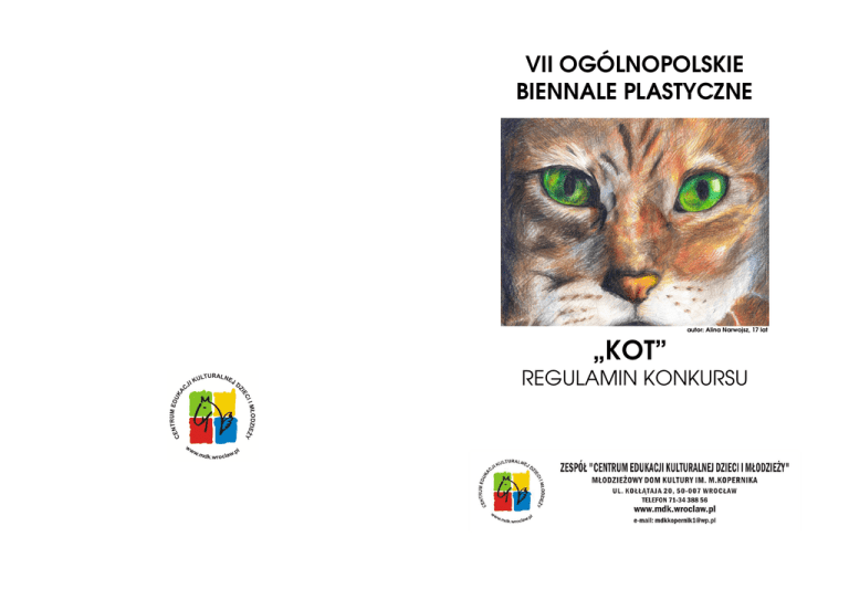 VII OGÓLNOPOLSKIE BIENNALE PLASTYCZNE autor: Alina Narwojsz, 17 lat „KOT” REGULAMIN KONKURSU VII OGÓLNOPOLSKIE BIENNALE PLASTYCZNE „KOT” ORGANIZATOR: Zespół „Centrum Edukacji Kulturalnej Dzieci i Młodzieży” ul. Kołłątaja 20, 50-007 Wrocław tel. 71 343 88 56 KOORDYNATOR: MARTA JAROSZ; e-mail: [email protected] CELE: Biennale ma na celu pobudzenie wyobraźni plastycznej na temat kota. Przykładowe tropy: • Kot na przestrzeni wieków - w wielu kulturach miał znaczenie symboliczne, metafizyczne i religijne. Jego kult istnieje nadal w wielu krajach. • Kot i jego charakter - mimo wrażenia zwierzęcia domowego, jest drapieżnikiem chodzącym „własnymi drogami”. Jego charakter i zachowanie burzą myśl o miękkiej przytulance. Jego charakter, to symbol przeciwności: miłości i agresji, przywiązania i odrębności… • Kot to zwierzątko - zwinne i zwinięte, puszyste i zupełnie łyse, białe i czarne. Jego postaci mogą być różne… • Kot i człowiek - wrażliwość na potrzeby zwierząt żyjących wśród nas… • Kot w rodzinie – kot jako część ogniska domowego… • Kocia mama i tata – koty ze swoim potomstwem… • Kot i pies – miłość czy nienawiść… • Kot i jego legenda – kot czarownicy, czarny kot… • i inne….. Biennale będzie prezentacją możliwości twórczych dzieci i młodzieży w dziedzinie plastyki oraz wymianą doświadczeń i poszerzania wiedzy z zakresu różnych technik plastycznych. WARUNKI KONKURSU: 1.Biennale skierowane jest do dzieci i młodzieży w wieku 5-20 lat, uczestników zajęć placówek wychowania pozaszkolnego oraz do wszystkich typów szkół . 2. Jedna osoba może przedstawić tylko jedną pracę. Maksymalna ilość prac z placówki - 15 3. Prace powinny być wykonane w technikach: malarstwo, malarstwo na szkle, tkanina artystyczna, batik, grafika, rysunek, ceramika i inne trwałe techniki. 4.Format pracy nie może przekraczać wymiarów: - 100 x 70 cm - dla malarstwa, rysunku i grafiki; - 40 x 40 x 40 cm - dla ceramiki i form przestrzennych. 5. Prace nie powinny być oprawione. Na odwrocie pracy należy umieścić czytelne informacje o autorze: tytuł pracy, imię i nazwisko, wiek, nazwa i adres placówki/szkoły oraz imię i nazwisko nauczyciela, pod kierunkiem którego praca została wykonana. Do wysyłki należy dołączyć listę zbiorczą autorów prac opatrzoną pieczęcią placówki. 6. Prace należy przesyłać na adres organizatora: Zespół „Centrum Edukacji Kulturalnej Dzieci i Młodzieży”, ul. Kołłątaja 20, 50-007 do 31 maja 2013r. (decyduje data stempla pocztowego), z dopiskiem KOT. 7. Warunkiem uczestnictwa w biennale jest opłata w wysokości 35 zł od placówki na konto: Rada Rodziców MDK im. M. Kopernika ul. Kołłątaja 20, 50-007 Wrocław, 89 1020 5242 0000 2202 0018 7526, tytuł opłaty „Konkurs KOT”. Opłatę należy dokonać do dnia 31.05.2013r. 8. Prace będą oceniane w kategoriach wiekowych: 0-3 kl., 4-6 kl., gimnazjum, szkoły ponadgimnazjalne W skład Jury wchodzić będą profesjonalni artyści plastycy. Organizatorzy przewidują nagrody i wyróżnienia we wszystkich kategoriach wiekowych. 9. Prace nadesłane na biennale, zakwalifikowane do wystawy oraz nagrodzone i wyróżnione przechodzą na własność organizatora i nie będą zwracane uczestnikom. 11. Udział w biennale jest równoznaczny z akceptacją regulaminu oraz ze zgodą na prezentowanie i reprodukowanie prac. INNE INFORMACJE: Wyniki biennale będą dostępne na strone www.mdk.wroclaw.pl od 25.06.2013r. Wystawa pokonkursowa w Centrum Edukacji Kulturalnej Dzieci i Młodzieży we Wrocławiu, przy ul. Kołłątaja 20 czynna będzie o okresie od 28.06 – 21.09.2013 i zakończy się 21.09.2013 uroczystym finisażem oraz aukcją charytatywną na rzecz wrocławskiego Schroniska dla zwierząt. Laureaci biennale i ich opiekunowie, otrzymają bezpłatny nocleg w Szkolnym Schronisku Młodzieżowym na terenie Zespołu „CEKDiM” Informujemy, że Ogólnopolski Konkurs Plastyczny „Kot” od roku 2013 przybiera formę biennale i będzie organizowany co dwa lata zamiennie z Kokursem Plastycznym „Świat dinozaurów”.