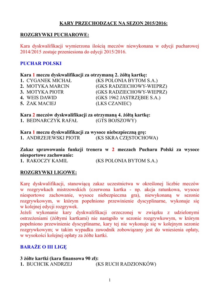 KARY PRZECHODZĄCE NA SEZON 2015/2016: ROZGRYWKI PUCHAROWE: Kara dyskwalifikacji wymierzona ilością meczów niewykonana w edycji pucharowej 2014/2015 zostaje przeniesiona do edycji 2015/2016. PUCHAR POLSKI Kara 1 meczu dyskwalifikacji za otrzymaną 2. żółtą kartkę: 1. CYGANEK MICHAŁ (KS POLONIA BYTOM S.A.) 2. MOTYKA MARCIN (GKS RADZIECHOWY-WIEPRZ) 3. MOTYKA PIOTR (GKS RADZIECHOWY-WIEPRZ) 4. WEIS DAWID (GKS 1962 JASTRZĘBIE S.A.) 5. ŻAK MACIEJ (LKS CZANIEC) Kara 2 meczów dyskwalifikacji za otrzymaną 4. żółtą kartkę: 1. BEDNARCZYK RAFAŁ (GTS BOJSZOWY) Kara 1 meczu dyskwalifikacji za wysoce niebezpieczną grę: 1. ANDRZEJEWSKI PIOTR (KS SKRA CZĘSTOCHOWA) Zakaz sprawowania funkcji trenera w 2 meczach Pucharu Polski za wysoce niesportowe zachowanie: 1. RAKOCZY KAMIL (KS POLONIA BYTOM S.A.) ROZGRYWKI LIGOWE: Karę dyskwalifikacji, stanowiącą zakaz uczestnictwa w określonej liczbie meczów w rozgrywkach mistrzowskich (czerwona kartka - np. akcja ratunkowa, wysoce niesportowe zachowanie, wysoce niebezpieczna gra), niewykonaną w sezonie rozgrywkowym, w którym popełniono przewinienie dyscyplinarne, wykonuje się w kolejnej edycji rozgrywek. Jeżeli wykonanie kary dyskwalifikacji orzeczonej w związku z udzielonymi ostrzeżeniami (żółtymi kartkami) nie nastąpiło w sezonie rozgrywkowym, w którym popełniono przewinienie dyscyplinarne, kary tej nie wykonuje się w kolejnym sezonie rozgrywkowym; w takim wypadku zawodnik zobowiązany jest do wniesienia opłaty, w wysokości kolejnej opłaty za żółte kartki. BARAŻE O III LIGĘ 3 żółte kartki (kara finansowa 90 zł): 1. BUCHCIK ANDRZEJ (KS RUCH RADZIONKÓW) 1 IV LIGA GRUPA I 3 żółte kartki (kara finansowa 90 zł): 1. BĄK JAROSŁAW (TS GWAREK TARNOWSKIE GÓRY) 2. ŚCISŁOWSKI KAMIL (LKS POLONIA PORAJ) 4 żółte kartki - opłata, jak za 6. żółtą kartkę (kara finansowa 120 zł): 1. RADEK SEBASTIAN (LKS PRZYSZŁOŚĆ CIOCHOWICE) 2. REJMANOWSKI TOMASZ (KS SLAVIA RUDA ŚLĄSKA) 3. SULIŃSKI KAMIL (LKS POLONIA PORAJ) 6 żółtych kartek (kara finansowa 120 zł): 1. PODLEJSKI KAROL (LKS ZIELONI ŻARKI) 9 żółtych kartek (kara finansowa 210 zł): 1. SMARZYŃSKI MARCIN (KS UNIA ZĄBKOWICE) 2. WROŃSKI MARCIN (MLKS PILICA KONIECPOL) 12 żółtych kartek (kara finansowa 210 zł): NOWAK ŁUKASZ (KS UNIA ZĄBKOWICE) Kara 1 meczu dyskwalifikacji za wysoce niesportowe zachowanie: 1. ZACZYŃSKI MATEUSZ (MLKS WOŹNIKI) IV LIGA GRUPA II 3 żółte kartki (kara finansowa 90 zł): 1. BŁASIAK ŁUKASZ (GKS RADZIECHOWY-WIEPRZ) 2. MICHALSKI KRZYSZTOF (LGKS 38 PODLESIANKA KATOWICE) 3. PAPATANASIU KRYSTIAN (LKS DRZEWIARZ JASIENICA) 4. ŻEMŁA KAMIL (MKS ISKRA PSZCZYNA) 4 żółte kartki - opłata, jak za 6. żółtą kartkę (kara finansowa 120 zł): 1. FRAŚ PRZEMYSŁAW (GKS GWAREK ORNONTOWICE) 2. HERASYMOV ARKADII (LKS UNIA TURZA ŚLĄSKA) 3. WIECZOREK MACIEJ (LKS FORTECA ŚWIERKLANY) 6 żółtych kartek (kara finansowa 120 zł): 1. GRZESIK MATEUSZ (KS UNIA RACIBÓRZ) 2. JASTRZĘBSKI ŁUKASZ (GKS RADZIECHOWY-WIEPRZ) 3. MIKOŁAJEC DAWID (GKS KRUPIŃSKI SUSZEC) 4. ŚLUSARCZYK DAWID (GKS GIEKSA II KATOWICE S.A.) 2 8 żółtych kartek - opłata, jak za 9. żółtą kartkę (kara finansowa 210 zł): 1. KRAUS DAMIAN (MKS ISKRA PSZCZYNA) 1. ŻBIKOWSKI RADOSŁAW (LKS FORTECA ŚWIERKLANY) 9 żółtych kartek (kara finansowa 210 zł): 1. KUCZOK KAMIL (LKS FORTECA ŚWIERKLANY) 2. PIWCZYK ŁUKASZ (LGKS 38 PODLESIANKA KATOWICE) 3. ZIMOŃ DAWID (LKS FORTECA ŚWIERKLANY) 4. ŻBIKOWSKI RADOSŁAW (LKS FORTECA ŚWIERKLANY) 12 żółtych kartek (kara finansowa 210 zł): 1. MOROŃ ARTUR (GTS BOJSZOWY) Kara 1 meczu dyskwalifikacji za „akcję ratunkową”: 1. WONIAKOWSKI PAWEŁ (KS UNIA RACIBÓRZ) Kara 1 meczu dyskwalifikacji za wysoce niesportowe zachowanie: 1. MICHALSKI KRZYSZTOF (LGKS 38 PODLESIANKA KATOWICE) 2. ZDRZAŁEK JAKUB (GKS GWAREK ORNONTOWICE) KLASA OKRĘGOWA GRUPA I 3 żółte kartki (kara finansowa 60 zł): 1. JUROWICZ DANIEL (UKS MK GÓRNIK KATOWICE) 2. LIMANÓWKA MATEUSZ (AKS MIKOŁÓW) 3. MARCINIAK ADAM (AKS MIKOŁÓW) 4. ŚLUFCIK BARTŁOMIEJ (AKS NIWKA W SOSNOWCU) 4 żółte kartki - opłata, jak za 6. żółtą kartkę (kara finansowa 90 zł): 1. CZAPLA MARIUSZ (AKS NIWKA W SOSNOWCU) 2. KOZŁOWSKI PIOTR (LKS OGRODNIK TYCHY) 3. LIMANÓWKA MATEUSZ (AKS MIKOŁÓW) 4. MASTALERZ ROBERT (AKS NIWKA W SOSNOWCU) 5. OLTMAN WOJCIECH (AKS MIKOŁÓW) 6. ŚLIWA MATEUSZ (MKS LĘDZINY) 6 żółtych kartek (kara finansowa 90 zł): 1. BOGDAŃSKI ADRIAN (KS GÓRNIK 09 MYSŁOWICE) 2. UNIEJEWSKI KAMIL (MKS LĘDZINY) 8 żółtych kartek - opłata, jak za 9. żółtą kartkę (kara finansowa 150 zł): 1. KARLIK DAWID (MKS LĘDZINY) 2. TWARDAWA TOMASZ (AKS MIKOŁÓW) 3 9 żółtych kartek (kara finansowa 150 zł): 1. CIASTO KRZYSZTOF (AKS MIKOŁÓW) 12 żółtych kartek (kara finansowa 150 zł): 1. GORKI ŁUKASZ (LKS UNIA KOSZTOWY) 2. LUTY JAROSŁAW (LKS UNIA KOSZTOWY) Kara 1 meczu dyskwalifikacji za „akcję ratunkową”: 1. WÓJCIK MATEUSZ (UKS MK GÓRNIK KATOWICE) Kara 1 meczu dyskwalifikacji za wysoce niesportowe zachowanie: 1. ŻYŁKA JAKUB (AKS MIKOŁÓW) Kara 2 meczów dyskwalifikacji za wysoce niesportowe zachowanie: 2. SIMLAT TOMASZ (KS ŻORY) Kara 3 meczów dyskwalifikacji za wysoce niesportowe zachowanie: 1. LIMANÓWKA MATEUSZ (AKS MIKOŁÓW) Zakaz sprawowania funkcji kierownika drużyny w 1 meczu za wysoce niesportowe zachowanie: 1. BRYSZ KRZYSZTOF (AKS MIKOŁÓW) KLASA OKRĘGOWA GRUPA II 3 żółte kartki (kara finansowa 60 zł): 1. BAŃCZYK MICHAŁ (MKS SOKÓŁ ORZESZE) 2. STEFAŃSKI ŁUKASZ (MKSR CZARNI PYSKOWICE) 3. WIECZOREK ŁUKASZ (MKS SOKÓŁ ORZESZE) 4. WOLSKI TOMASZ (LKS 1908 NĘDZA) 4 żółte kartki - opłata, jak za 6. żółtą kartkę (kara finansowa 90 zł): 1. GUZY ŁUKASZ (ŁTS ŁABĘDY) 2. KĘSIK JACEK (LKS BUK RUDY) 3. KUROPKA ŁUKASZ (MKS ZABRZE-KOŃCZYCE) 4. PROCEK MATEUSZ (LKS BUK RUDY) 5. ZNISZCZOŁ KAROL (LKS BUK RUDY) 6 żółtych kartek (kara finansowa 90 zł): 1. KOWALSKI WOJCIECH (MKSR CZARNI PYSKOWICE) 2. SOLA