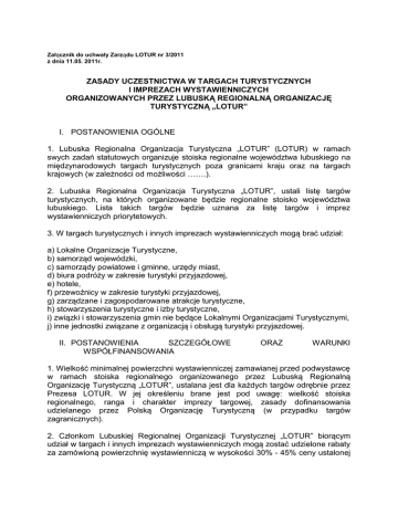 Załącznik do uchwały Zarządu LOTUR nr 3/2011 z dnia 11.05. 2011r. ZASADY UCZESTNICTWA W TARGACH TURYSTYCZNYCH I IMPREZACH WYSTAWIENNICZYCH ORGANIZOWANYCH PRZEZ LUBUSKĄ REGIONALNĄ ORGANIZACJĘ TURYSTYCZNĄ „LOTUR” I. POSTANOWIENIA OGÓLNE 1. Lubuska Regionalna Organizacja Turystyczna „LOTUR” (LOTUR) w ramach swych zadań statutowych organizuje stoiska regionalne województwa lubuskiego na międzynarodowych targach turystycznych poza granicami kraju oraz na targach krajowych (w zależności od możliwości …….). 2. Lubuska Regionalna Organizacja Turystyczna „LOTUR”, ustali listę targów turystycznych, na których organizowane będzie regionalne stoisko województwa lubuskiego. Lista takich targów będzie uznana za listę targów i imprez wystawienniczych priorytetowych. 3. W targach turystycznych i innych imprezach wystawienniczych mogą brać udział: a) Lokalne Organizacje Turystyczne, b) samorząd wojewódzki, c) samorządy powiatowe i gminne, urzędy miast, d) biura podróży w zakresie turystyki przyjazdowej, e) hotele, f) przewoźnicy w zakresie turystyki przyjazdowej, g) zarządzane i zagospodarowane atrakcje turystyczne, h) stowarzyszenia turystyczne i izby turystyczne, i) związki i stowarzyszenia gmin nie będące Lokalnymi Organizacjami Turystycznymi, j) inne jednostki związane z organizacją i obsługą turystyki przyjazdowej. II. POSTANOWIENIA SZCZEGÓŁOWE WSPÓŁFINANSOWANIA ORAZ WARUNKI 1. Wielkość minimalnej powierzchni wystawienniczej zamawianej przed podwystawcę w ramach stoiska regionalnego organizowanego przez Lubuską Regionalną Organizację Turystyczną „LOTUR”, ustalana jest dla każdych targów odrębnie przez Prezesa LOTUR. W jej określeniu brane jest pod uwagę: wielkość stoiska regionalnego, ranga i charakter imprezy targowej, zasady dofinansowania udzielanego przez Polską Organizację Turystyczną (w przypadku targów zagranicznych). 2. Członkom Lubuskiej Regionalnej Organizacji Turystycznej „LOTUR” biorącym udział w targach i innych imprezach wystawienniczych mogą zostać udzielone rabaty za zamówioną powierzchnię wystawienniczą w wysokości 30% - 45% ceny ustalonej przez organizatora targów. Rabat nie jest udzielany w stosunku do: opłat rejestracyjnych, wpisów do katalogu wystawców, kart wstępu. 3. Warunkiem udziału w stoisku regionalnym jest podpisanie umowy z LOTUR oraz wpłacenie zaliczki w wysokości ustalonej w umowie lub zamówieniu powierzchni wystawienniczej. 4. Członkowie Lubuskiej Regionalnej Organizacji Turystycznej „LOTUR”, niewykupujący powierzchni wystawienniczej na targach mają prawo przekazać bezpłatnie na stoisko regionalne swoje materiały promocyjne. 5. Podmioty działające w branży turystycznej niebędące członkami LOTUR lub będące członkami wspierającymi mogą przekazać swe materiały promocyjne na stoisko regionalne za opłatą (każdorazowo ustalaną dla poszczególnych targów). Wysokość opłaty będzie ustalana przez LOTUR w zależności od rangi targów, wielkości stoiska i ilości przekazywanych materiałów. 6. Zgodnie z „Zasadami uczestnictwa w polskich stoiskach narodowych organizowanych na międzynarodowych targach turystycznych i przemysłu kongresowego” ustalonych przez Polską Organizację Turystyczną, Regionalne Organizacje Turystyczne są jedyną właściwą instytucją do występowania do POT lub POIT –ów o przydział powierzchni wystawienniczej przeznaczonej na organizację stoiska regionalnego dla wszystkich uczestników stoiska z własnego regionu. Wyjątek stanowią imprezy objęte dofinansowaniem udziału przez Ministerstwo Gospodarki i Pracy (w tym przypadku o dofinansowanie podmioty gospodarcze winny się zgłaszać indywidualnie) oraz imprezy dotyczące turystyki biznesowej. Biura podróży, hotele, zarządzane atrakcje turystyczne oraz inne jednostki związane z organizacją i obsługą turystyki przyjazdowej występują o przydział powierzchni wystawienniczej do LOTUR, nawet gdy LOTUR nie bierze udziału w danej imprezie targowej (targi spoza listy priorytetowej). W tym przypadku zainteresowany podmiot ponosi 100% kosztów organizacji takiej imprezy targowej. W przypadku, gdy podmiotem tym jest nie członek LOTUR Lubuska Regionalna Organizacja Turystyczna „LOTUR” może żądać zwrotu kosztów związanych z załatwianiem sprawy. III. ZASADY ORGANIZACYJNE 1. Zamówienie na powierzchnię wystawienniczą należy składać do biura Lubuskiej Regionalnej Organizacji Turystycznej „LOTUR”. 2. Zamówienia na powierzchnię wystawienniczą przyjmowane są tylko od wystawców niezalegających z opłatami za udział we wcześniejszych targach. 3. Rezygnacja z udziału w stoisku regionalnym powoduje naliczenie kar umownych określonych każdorazowo w umowie uczestnictwa. 4. W ramach stoiska regionalnego podwystawca: - otrzymuje własną ladę wystawienniczą lub jej część w zależności od wielkości zakupionej powierzchni i rodzaju imprezy targowej, - ma prawo wysłać na targi swego przedstawiciela, który podporządkuje się regulaminowi stoiska i poleceniom koordynatora ustanowionego przez LOTUR, - ma prawo korzystać bezpłatnie ze wspólnego zaplecza na stoisku, - ma prawo umieścić napis nad swą ladą z nazwą firmy, organizacji lub jednostki w przypadku targów krajowych lub z nazwą regionu w przypadku targów zagranicznych. 5. Podwystawcy wysyłający na targi swego przedstawiciela pokrywają ze swych środków: - koszty osobowe przedstawiciela (noclegi, diety, karty wstępów), - koszt wpisu do katalogu i ewentualnej opłaty rejestracyjnej, - proporcjonalnie koszt artykułów spożywczych na stoisku, - proporcjonalnie część ogólnego wystroju stoiska, - ewentualne koszty koordynacji stoiska. 6. Uczestnicy stoiska regionalnego korzystają z przyjętego przez LOTUR wystroju. Wszelkie ewentualne zmiany w wystroju poszczególnych stoisk będą dokonywane tylko w uzasadnionych przypadkach, na podstawie indywidualnych dec