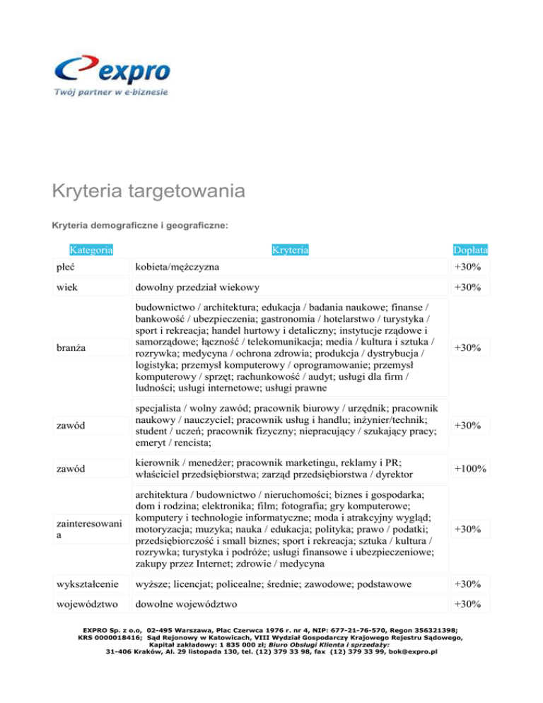 Kryteria targetowania Kryteria demograficzne i geograficzne: Kategoria Kryteria Dopłata płeć kobieta/mężczyzna +30% wiek dowolny przedział wiekowy +30% branża budownictwo / architektura; edukacja / badania naukowe; finanse / bankowość / ubezpieczenia; gastronomia / hotelarstwo / turystyka / sport i rekreacja; handel hurtowy i detaliczny; instytucje rządowe i samorządowe; łączność / telekomunikacja; media / kultura i sztuka / rozrywka; medycyna / ochrona zdrowia; produkcja / dystrybucja / logistyka; przemysł komputerowy / oprogramowanie; przemysł komputerowy / sprzęt; rachunkowość / audyt; usługi dla firm / ludności; usługi internetowe; usługi prawne +30% zawód specjalista / wolny zawód; pracownik biurowy / urzędnik; pracownik naukowy / nauczyciel; pracownik usług i handlu; inżynier/technik; student / uczeń; pracownik fizyczny; niepracujący / szukający pracy; emeryt / rencista; +30% zawód kierownik / menedżer; pracownik marketingu, reklamy i PR; właściciel przedsiębiorstwa; zarząd przedsiębiorstwa / dyrektor +100% zainteresowani a architektura / budownictwo / nieruchomości; biznes i gospodarka; dom i rodzina; elektronika; film; fotografia; gry komputerowe; komputery i technologie informatyczne; moda i atrakcyjny wygląd; motoryzacja; muzyka; nauka / edukacja; polityka; prawo / podatki; przedsiębiorczość i small biznes; sport i rekreacja; sztuka / kultura / rozrywka; turystyka i podróże; usługi finansowe i ubezpieczeniowe; zakupy przez Internet; zdrowie / medycyna +30% wykształcenie wyższe; licencjat; policealne; średnie; zawodowe; podstawowe +30% województwo dowolne województwo +30% EXPRO Sp. z o.o, 02-495 Warszawa, Plac Czerwca 1976 r. nr 4, NIP: 677-21-76-570, Regon 356321398; KRS 0000018416; Sąd Rejonowy w Katowicach, VIII Wydział Gospodarczy Krajowego Rejestru Sądowego, Kapitał zakładowy: 1 835 000 zł; Biuro Obsługi Klienta i sprzedaży: 31-406 Kraków, Al. 29 listopada 130, tel. (12) 379 33 98, fax (12) 379 33 99, [email protected] miejscowość dowolna miejscowość +50% wielkość miejscowości do 20 tys. mieszkańców od 20 do 50 tys. mieszkańców od 50 do 100 tys. mieszkańców od 100 do 200 tys. mieszkańców powyżej 200 tys. mieszkańców +30% kraj Polska +30% kraj dowolny poza Polską +50% Pozostałe opcje: Kategoria Kryteria Dopłata krótszy okres dowolna ilość dni w trakcie których mailing musi się zrealizować realizacji mailingu (minimum 7 dni, maksimum 13 dni) +10% mailing w częściach wysyłanie mailingu w częściach – za drugą i każdą następną część +10% retargeting według dostarczeń/otwarć usługa pozwalająca zbierać dane nt. kont które dostały/otworzyły pierwszą wysyłkę. Dane te pozwalają na dodanie lub wykluczenie tych kont z kolejnego mailingu. Dopłata obowiązuje zarówno w przypadku zbierania danych jak i ponownej wysyłki +30% personalizacja umieszczanie w treści maila imienia lub loginu użytkownika +30% generowanie umieszczanie w treści maila unikalnego kodu promocyjnego unikalnych kodów +30% EXPRO Sp. z o.o, 02-495 Warszawa, Plac Czerwca 1976 r. nr 4, NIP: 677-21-76-570, Regon 356321398; KRS 0000018416; Sąd Rejonowy w Katowicach, VIII Wydział Gospodarczy Krajowego Rejestru Sądowego, Kapitał zakładowy: 1 835 000 zł; Biuro Obsługi Klienta i sprzedaży: 31-406 Kraków, Al. 29 listopada 130, tel. (12) 379 33 98, fax (12) 379 33 99, [email protected]