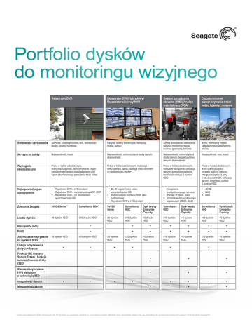 Portfolio dysków do monitoringu wizyjnego Rejestrator DVR Rejestrator DVR/Hybrydowy/ Rejestrator sieciowy NVR System zarządzania obrazem (VMS)/Analizy treści obrazu (VCA) Długoterminowe przechowywanie treści wideo i pamięć masowa Środowisko użytkowania Domowe, przedsiębiorstwa MiŚ, restauracje/ sklepy, obiekty handlowe Kasyna, obiekty komercyjne, kampusy, hotele, fabryki Centra dowodzenia i sterowania, kasyna, monitoring miejski, kontrola graniczna, lotniska Banki, monitoring miejski, bezpieczeństwo wewnętrzne, lotniska Na czym im zależy Niezawodność, koszt Niezawodność, ochrona przed utratą danych, skalowalność Niezawodność, ochrona przed utratą danych, bezpieczeństwo danych, skalowalność Niezawodność, moc, koszt Wymagania eksploatacyjne Praca w trybie całodobowym, energooszczędność, wytrzymywanie ciepła i wysokich temperatur, zoptymalizowane pod kątem strumieniowego przesyłania treści wideo Praca w trybie całodobowym, realizacja wielu operacji zapisu, obsługa wielu strumieni w rozdzielczości HD/MP Praca w trybie całodobowym, mieszane obciążenie, utylizacja danych, energooszczędność, możliwość obsługi 5 dysków HDD Praca w trybie całodobowym, wiele operacji zapisu/ niewiele operacji odczytu, energooszczędność przy wielu dyskach HDD, utylizacja danych, możliwość obsługi 5 dysków HDD Najodpowiedniejsze zastosowania • Rejestrator DVR z ≤16 kanałami • Rejestrator DVR z rozdzielczością 4CIF, 2CIF • Rejestrator DVR z <4 strumieniami w rozdzielczości HD • Do 20 nagrań treści wideo w rozdzielczości HD • Wykorzystanie macierzy RAID jako nadmiarowej • Rejestrator DVR z ≥16 kanałami • Urządzenie zwirtualizowanego serwera • Pamięć IP (NAS, SAN) • Urządzenie do tworzenia kopii zapasowych (JBOD, DAS) • JBOD • NAS • DAS Zalecenia Seagate SV35.6 Series™ Surveillance HDD1 SV35.6 Series Surveillance HDD Dysk twardy Enterprise Capacity Surveillance HDD Dysk twardy Enterprise Capacity Surveillance HDD Dysk twardy Enterprise Capacity Liczba dysków ≤8 dysków HDD ≤16 dysków HDD1 ≤8 dysków HDD ≤16 dysków HDD >5 dysków HDD ≤16 dysków HDD >5 dysków HDD ≤16 dysków HDD >5 dysków HDD Niski pobór mocy • • • • • • RAID • • • • • • Jednoczesne nagrywanie na dyskach HDD Usługa odzyskiwania danych +Rescue • ≤16 dysków HDD1 • ≤8 dysków HDD • ≤16 dysków HDD >5 dysków HDD • ≤16 dysków HDD >5 dysków HDD • ≤16 dysków HDD • >5 dysków HDD • Funkcja ISE (Instant Secure Erase) i funkcja samoszyfrowania dysku (SED) • • • Standard szyfrowania FIPS Validation z technologią SED • • • Integralność danych Mieszane obciążenie 1 ≤8 dysków HDD • • • • • • • • • • • Dysk Surveillance HDD obsługuje do 16 dysków w systemie dysków z czujnikami drgań. Modele bez czujników drgań nie są zalecane do systemów liczących więcej niż 8 dysków twardych. • • Dyski zoptymalizowane pod kątem monitoringu wizyjnego SV35 Series™ Surveillance HDD (bez czujnika drgań) Surveillance HDD (z czujnikiem drgań) Środowisko użytkowania Zabezpieczenie domu i firmy Bezpieczeństwo miejsc publicznych i imprez Analiza i optymalizacja treści wideo Bezpieczeństwo miejsc publicznych i imprez Analiza i optymalizacja treści wideo Zastosowanie: Niskie koszty, niska rozdzielczość, prosta instalacja i obsługa dla MiŚ, zastosowań w handlu detalicznym i komercyjnym lub dla zastosowań domowych Centralne aplikacje monitorujące, stosujące zazwyczaj kamery IP, dla firm średniej wielkości takich jak banki, kasyna lub lotniska Aplikacje pamięci masowej, aplikacje centrum danych, zastosowania rządowe lub korporacyjne, w których liczy się analiza treści wideo i wideo HD Grupa docelowa Integratorzy systemu, przedsiębiorstwa sektora MiŚ, użytkownicy końcowi Pojemność1 1, 2, 3 TB 1, 2, 3 TB 4, 5, 6 TB 1, 2, 3, 4, 5, 6 TB Zalety Niezawodne działanie w systemach obsługujących wiele kamer Energooszczędność, cicha praca, niezawodna pamięć do systemów monitoringu obsługujących wiele kamer w zastosowaniach konsumenckich lub małych i średnich firmach Niezawodne działanie w systemach obsługujących wiele kamer, odporność na drgania dzięki czujnikom drgań wywołanych ruchem obrotowym, przeznaczonym do obsługi systemów RAID, krótki czas osiągnięcia gotowości do pracy Szybka losowa wydajność i krótki czas do osiągnięcia stanu gotowości w wielodyskowych aplikacjach Czas do osiągnięcia gotowości Dobry: obsługa stanu bezczynności Idle 1, 2 Najlepszy: obsługa stanu bezczynności Idle 1, 2, 3 Kamera Do 32 System 1 do 8 dysków Zabezpieczenia — Funkcja ISE w konfiguracjach SED lub FIPS Obciążenie robocze 1 mln godz. MTBF; interfejs SATA 2 mln godz. MTBF; interfejs SAS/SATA Odzyskiwanie danych Dostępna opcja +Rescue — Integratorzy systemu, menedżerzy infrastruktury IT Najlepszy: technologia PowerChoice™ z dostosowaniem czasu do osiągnięcia stanu gotowości i energooszczędność 100+ 1 do 16 dysków Gwarancja, ograniczona 3 lata 1 Enterprise Capacity 3.5 HDD >5 dysków RV przy 1500 Hz = 12,5 rd/s2 Silnik montowany na górnej pokrywie 5 lat W przypadku oznaczania pojemności dysków, jeden gigabajt (oznaczany także jako „GB”) jest równy jednemu miliardowi bajtów; jeden terabajt (oznaczany także jako „TB”) jest równy jednemu bilionowi bajtów. www.seagate.com AMERYKA PŁN. I PŁD. AZJA/PACYFIK EUROPA, BLISKI WSCHÓD I AFRYKA Seagate Technology LLC 10200 South De Anza Boulevard, Cupertino, California 95014, USA, +1 408 658 1000 Seagate Singapore International Headquarters Pte. Ltd. 7000 Ang Mo Kio Avenue 5, Singapur 569877, +65 6485 3888 Seagate Technology SAS 16-18 rue du Dôme, 92100 Boulogne-Billancourt, Francja, +33 1 41 86 10 00 © 2014 Seagate Technology LLC. Wszelkie prawa zastrzeżone. Seagate, Seagate Technology i logo Wave są zastrzeżonymi znakami towarowymi firmy Seagate Te