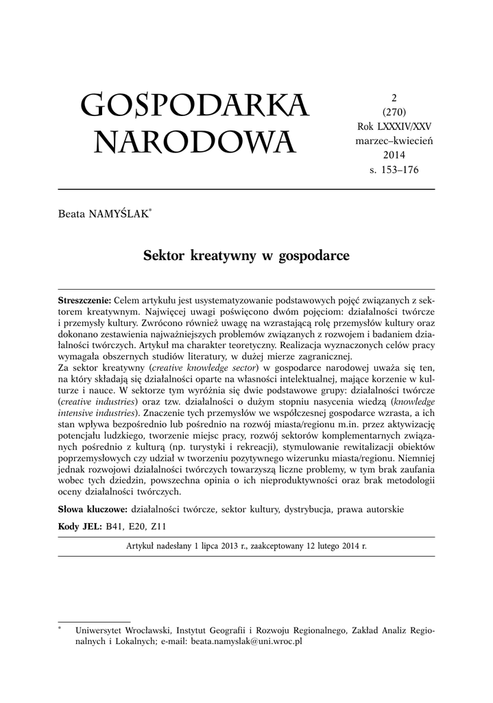 153 Beata Namyślak, Sektor kreatywny w gospodarce Gospodarka narodowa 2 (270) Rok LXXXIV/XXV marzec–kwiecień 2014 s. 153–176 Beata Namyślak* Sektor kreatywny w gospodarce Streszczenie: Celem artykułu jest usystematyzowanie podstawowych pojęć związanych z sek‑ torem kreatywnym. Najwięcej uwagi poświęcono dwóm pojęciom: działalności twórcze i przemysły kultury. Zwrócono również uwagę na wzrastającą rolę przemysłów kultury oraz dokonano zestawienia najważniejszych problemów związanych z rozwojem i badaniem dzia‑ łalności twórczych. Artykuł ma charakter teoretyczny. Realizacja wyznaczonych celów pracy wymagała obszernych studiów literatury, w dużej mierze zagranicznej. Za sektor kreatywny (creative knowledge sector) w gospodarce narodowej uważa się ten, na który składają się działalności oparte na własności intelektualnej, mające korzenie w kul‑ turze i nauce. W sektorze tym wyróżnia się dwie podstawowe grupy: działalności twórcze (creative industries) oraz tzw. działalności o dużym stopniu nasycenia wiedzą (knowledge intensive industries). Znaczenie tych przemysłów we współczesnej gospodarce wzrasta, a ich stan wpływa bezpośrednio lub pośrednio na rozwój miasta/regionu m.in. przez aktywizację potencjału ludzkiego, tworzenie miejsc pracy, rozwój sektorów komplementarnych związa‑ nych pośrednio z kulturą (np. turystyki i rekreacji), stymulowanie rewitalizacji obiektów poprzemysłowych czy udział w tworzeniu pozytywnego wizerunku miasta/regionu. Niemniej jednak rozwojowi działalności twórczych towarzyszą liczne problemy, w tym brak zaufania wobec tych dziedzin, powszechna opinia o ich nieproduktywności oraz brak metodologii oceny działalności twórczych. Słowa kluczowe: działalności twórcze, sektor kultury, dystrybucja, prawa autorskie Kody JEL: B41, E20, Z11 Artykuł nadesłany 1 lipca 2013 r., zaakceptowany 12 lutego 2014 r. * Uniwersytet Wrocławski, Instytut Geografii i Rozwoju Regionalnego, Zakład Analiz Regio‑ nalnych i Lokalnych; e‑mail: [email protected] 154 GOSPODARKA NARODOWA nr 2/2014 Wprowadzenie Celem artykułu jest usystematyzowanie takich pojęć jak sektor kreatywny, działalności twórcze, przemysły kultury w różnych aspektach i według róż‑ nych badaczy oraz wyjaśnienie nieścisłości bądź różnic między tymi ujęciami. Ponadto szerzej omówiono cechy wyróżniające działalności twórcze w gospo‑ darce. Zwrócono również uwagę na wzrastającą rolę przemysłów kultury. Opra‑ cowanie kończy prezentacja najważniejszych problemów związanych z roz‑ wojem i badaniem działalności twórczych jako wiodącej składowej sektora kreatywnego. Wyjaśnienie pojęć W literaturze przedmiotu za sektor kreatywny (creative knowledge sector) w gospodarce narodowej uważa się ten, na który składają się działalności oparte na własności intelektualnej, mające swe korzenie w kulturze i nauce. W sek‑ torze tym wyróżnia się dwie podstawowe grupy: działalności twórcze (creative industries) oraz tzw. działalności o dużym stopniu nasycenia wiedzą (knowledge intensive industries) [Throsby 2010; Stryjakiewicz i Stachowiak 2010]. W róż‑ nych klasyfikacjach zauważalne jest, że lista działalności zaliczanych do creative industries nie zawsze jest taka sama. Pod tym względem zestaw działalno‑ ści o dużym stopniu nasycenia wiedzą nie budzi tyle kontrowersji i zazwyczaj wygląda bardzo podobnie. Badacze sektora kreatywnego najczęściej powołują się na opracowania Departamentu Mediów, Kultury i Sportu (DCMS) w rządzie brytyjskim, zgodnie z którymi do działalności twórczych zalicza się te dziedziny, które oparte są na ludzkiej kreatywności, talencie i umiejętnościach, wytwarzają i wykorzystują własności intelektualne, jak również zawierają potencjał do tworzenia dobro‑ bytu i przyczyniają się do powstawania nowych miejsc pracy. Według DCMS do działalności tych zalicza się: reklamę, działalność wydawniczą, fotografię, architekturę, rynek sztuki i antyków, radio i telewizję, film i wideo, działal‑ ność muzyczną, wzornictwo i projektowanie (graficzne, wnętrz, form przemy‑ słowych, multimediów, mody), działalność artystyczną i rozrywkową, rzemiosło artystyczne, działalność związaną z oprogramowaniem oraz gry wideo i gry komputerowe [Department of Culture... 2001]. Z takim podziałem zgadza się m.in. Hall [2000] czy Mackiewicz i in. [2009]. Wspomniane różnice polegają na tym, że niektórzy badacze zaliczają do działal‑ ności twórczych jeszcze sport i rekreację (spędzanie wolnego czasu), np. Kong [2000], inni tylko działalność rekreacyjną, bez uwzględnienia sportu, m.in. Stry‑ jakiewicz i Stachowiak [2010], Throsby [2010]. Czasami zaliczana jest też tury‑ styka kulturowa, np. [UNESCO 2009]. Jeśli za podstawowy wyznacznik twór‑ czości zostanie wybrana nowa jakość chroniona prawami autorskimi („wartość dodana”), to wówczas pomija się handel antykami [np. Jankowska 2012] czy turystykę kulturową. Bywa też, że wyróżniona zostaje kategoria „inne” lub Beata Namyślak, Sektor kreatywny w gospodarce 155 „pozostałe”, w której gromadzi się bardziej szczegółowe rodzaje działalności albo typy działalności związane z kilkoma kategoriami, jak np. tłumaczenia [Smoleń 2003]. Poza tym można zaobserwować zmiany nazw niektórych skła‑ dowych, co w praktyce oznacza rozszerzenie lub zawężenie problemu, np. dzie‑ dzictwo kultury w miejsce architektury. Zestaw tzw. działalności o dużym stopniu nasycenia wiedzą (knowledge intensive industries) jest stały. Tę część sektora kreatywnego tworzą: produkcja i usługi w zakresie technologii informacyjno‑komunikacyjnych (ICT) z wyjąt‑ kiem oprogramowania, usługi finansowe, usługi prawne i inne usługi dla biz‑ nesu (np. konsulting, badania rynku), działalność badawczo‑rozwoj