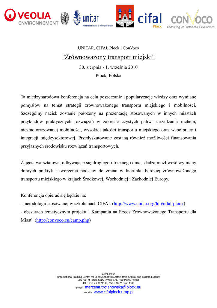 Consulting for Sustainable Development UNITAR, CIFAL Płock i ConVoco "Zrównoważony transport miejski" 30. sierpnia - 1. września 2010 Płock, Polska Ta międzynarodowa konferencja na celu poszerzanie i popularyzację wiedzy oraz wymianę pomysłów na temat strategii zrównoważonego transportu miejskiego i mobilności. Szczególny nacisk zostanie położony na prezentację stosowanych w innych miastach przykładów praktycznych rozwiązań w zakresie czystych paliw, zarządzania ruchem, niezmotoryzowanej mobilności, wysokiej jakości transportu miejskiego oraz współpracy i integracji międzysektorowej. Przedyskutowane zostaną również możliwości finansowania przyjaznych środowisku rozwiązań transportowych. Zajęcia warsztatowe, odbywające się drugiego i trzeciego dnia, dadzą możliwość wymiany dobrych praktyk i tworzenia podstaw do zmian w kierunku bardziej zrównoważonego transportu miejskiego w krajach Środkowej, Wschodniej i Zachodniej Europy. Konferencja opierać się będzie na: - metodologii stosowanej w szkoleniach CIFAL (http://www.unitar.org/ldp/cifal-plock) - obszarach tematycznym projektu „Kampania na Rzecz Zrównoważonego Transportu dla Miast” (http://convoco.eu/camp.php) CIFAL Płock (International Training Centre for Local Authorities/Actors from Central and Eastern Europe) City Hall of Płock, Stary Rynek 1, 09-400 Płock, Poland tel.: +48-24 3671430, fax: +48-24 3671430; e-mail: [email protected] www.cifalplock.ump.pl website: Wsparcie udzielone przez Islandię, Liechtenstein i Norwegię poprzez dofinansowanie ze środków Mechanizmu Finansowego Europejskiego Obszaru Gospodarczego oraz Norweskiego Mechanizmu Finansowego, a także ze środków budżetu Rzeczpospolitej Polskiej w ramach Funduszu dla Organizacji Pozarządowych UNITAR, CIFAL Płock i ConVoco "Zrównoważony transport w miastach" 30. sierpnia - 1. września 2010 Płock, Polska PROGRAM: Sesja plenarna (miejsce: Hotel Tumski, ul. Piekarska 9) 9.30-10.00 Rejestracja uczestników / Poranna kawa 10.00-10.10 Mirosław Milewski, Prezydent Miasta Płocka- otwarcie konferencji 10.10-10.50 Prezentacje współorganizatorów (UNITAR, CIFAL Płock, ConVoco) 11.00-12.30 Zrównoważony transport i mobilność w miastach – perspektywa ogólna Heather Allen, Senior Manager, Zrównoważony rozwój, przedstawiciel UITP (Międzynarodowe Stowarzyszenie Transportu Publicznego) Działania Unii Europejskiej w zakresie wspierania miejskiego transportu i mobilności przedstawiciel Komisji Europejskiej, DG MOVE, Wydział czystego transportu, Transport Miejski i inteligentne systemy transportowe Rola władz lokalnych w kreowaniu transportu i mobilności miejskiej, TRL (Transport Research Laboratory) Dyskusja panelowa: Rola władz lokalnych w kreowaniu transportu i mobilności miejskiej 12.30-12.45 Przerwa kawowa Workshops 12.45 – 14.15 Warsztat I (miejsce: Hotel Tumski): Strategie kreowania zrównoważonego transportu i mobilności w miastach; wizja i przykłady - prezentacje dobrych praktyk Moderator: Jonas Ericson (Sztokholm) 13.00 – 14.30 Warsztat II (miejsce: Aula Ratusza, Stary Rynek 1, I piętro): Rozwój i finansowanie zrównoważonego transportu miejskiego - prezentacje dobrych praktyk Moderator: Sylwia Klatka (ConVoco) 14.15 – 14.30 Przerwa (kawa + przekąski) 14.30 – 15.30 Warsztat I: Strategie kreowania zrównoważonego transportu i mobilności w miastach – c.d. - dyskusja panelowa (z udziałem m.in. UITP i Komisji Europejskiej) - pytania i odpowiedzi 14.30 – 14.45 Przerwa (kawa + przekąski) 14.45 – 15.45 Warsztat II: Rozwój i finansowanie zrównoważonego transportu miejskiego – c.d. - dyskusja panelowa (z udziałem m.in. Europejskiego banku Inwestycyjnego, Miasta Gdynia) - pytania i odpowiedzi Moderator: Jonas Ericson (Sztokholm) Dominik Zalewski (ConVoco) Moderator: Sylwia Klatka (ConVoco) Holger Dalkmann (Transport Research Laboratory) 15.30 Obiad (miejsce: Hotel Tumski)