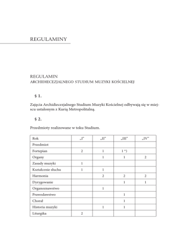 Regulaminy Regulamin § 1. Zajęcia Archidiecezjalnego Studium Muzyki Kościelnej odbywają się w miejscu ustalonym z Kurią Metropolitalną. § 2. Przedmioty realizowane w toku Studium. Rok „I” „II” „III” „IV” 2 1 1 *) 1 1 2 2 2 1 1 Przedmiot Fortepian Organy Zasady muzyki 1 Kształcenie słuchu 1 Harmonia 1 2 Dyrygowanie Organoznawstwo 1 Prawodawstwo 1 Chorał 1 Historia muzyki Liturgika 1 2 1 DOK UM EN T Y A RCY BISK U PA POZ NA ŃSK I EG O / R EGU L A M I N Y Emisja głosu 1 Chór 1 1 1 1 *) dla słuchaczy, którzy zdaniem komisji egzaminacyjnej nie zrealizowali minimum programowego. § 3. Dyrektor Studium ustala szczegółowy kalendarz zajęć zbiorowych oraz indywidualnych i przedstawia go wykładowcom i słuchaczom. § 4. Plany zajęć indywidualnych zatwierdza Dyrektor Studium po przedstawieniu ich przez pedagogów prowadzących te zajęcia. § 5. Wykładowcy zobowiązani są do odbycia zajęć według ustalonego z Dyrektorem Studium planu. § 6. Pod koniec miesiąca wykładowcy przedkładają Dyrektorowi Studium pisemny wykaz przeprowadzonych zajęć. § 7. Zajęcia które się nie odbyły z przyczyn niezawinionych przez słuchacza, należy przeprowadzić z nim w innym, uzgodnionym wcześniej terminie. O zaistniałych zmianach należy powiadomić Dyrektora Studium. § 8. Rok nauki podzielony jest na dwa semestry. Postępy w nauce gry na instrumentach ocenia komisja egzaminacyjna po każdym zakończonym semestrze. Skład komisji egzaminacyjnej ustala Dyrektor Studium. Przedmioty tzw. teoretyczne (zbiorowe) kończą się egzaminem na koniec całego cyklu nauki danego przedmiotu. Oceny z egzaminów wpisywane są przez pedagogów do indeksów. 495 496 TOM II. STAT U T Y / A N EKSY § 9. Podstawą zaliczenia semestru i poszczególnych lat nauki jest przedstawienie Dyrektorowi Studium indeksu z pozytywnymi ocenami z wszystkich przedmiotów przewidzianych w danym semestrze lub roku w terminie do końca stycznia dla pierwszego semestru i końca czerwca dla drugiego semestru. § 10. Dyrektor Studium dopuszcza do egzaminu dyplomowego po uzyskaniu przez słuchacza absolutorium na podstawie wpisów do indeksu. Warunkiem otrzymania Dyplomu jest zdanie egzaminu dyplomowego. Na egzamin dyplomowy składa się: – gra liturgiczna podczas Mszy św., – recital organowy, – dyrygowanie zespołem chóralnym. Na ocenę końcową egzaminu dyplomowego składają się: – średnia ocen z całego toku studiów, – ocena z gry liturgicznej, – ocena z recitalu organowego, – ocena z dyrygowania zespołem chóralnym. Po zatwierdzeniu końcowej oceny przez Radę Pedagogiczną, absolwent otrzymuje Dyplom ukończenia Studium. § 11. Słuchacze wnoszą comiesięczne ofiary za naukę w wysokości określonej przez Kurię Metropolitalną do piątego dnia każdego miesiąca, w którym odbywa się nauka. W przypadku nieobecności słuchacza na zajęciach ofiary nie będą zwracane. § 12. W przypadku zalegania z ofiarą na rzecz Studium Dyrektor Studium zawiesza słuchacza w jego prawach. § 13. Dyrektor Studium wyznacza terminy egzaminów komisyjnych. DOK UM EN T Y A RCY BISK U PA POZ NA ŃSK I EG O / R EGU L A M I N Y § 14. Wynagrodzenie za udział w pracach komisji dokonuje się według zwyczajnej stawki lekcyjnej. † Stanisław Gądecki Arcybiskup Metropolita Poznański Ks. Ireneusz Dosz Kanclerz Kurii Poznań, dnia 1 marca 2004 roku N. 1440/2004 497 Regulamin I. Dom Księży Emerytów 1. Dom Księży Emerytów, zwany dalej Domem, znajdujący się przy ul. Sędziwoja 46 w Poznaniu Antoninku jest instytucją Archidiecezji Poznańskiej. 2. Fundusz Domu stanowią: a) dotacje Archidiecezji Poznańskiej, b) dopłaty z Braterskiej Opieki Kapłańskiej, c) 70% podstawowej państwowej emerytury lub renty kapłanów zamieszkujących w Domu, d) ofiary i darowizny. II. Dyrektor Domu Księży Emerytów 1. Domem zarządza Dyrektor Domu Księży Emerytów, zwany dalej Dyrektorem, którego mianuje Arcybiskup Poznański. 2. Zadaniem Dyrektora jest troskliwa opieka nad księżmi zamieszkującymi w Domu, pomoc w tworzeniu braterskiej atmosfery kapłańskiej i opieka nad chorymi kapłanami. Do jego obowiązków należy także administrowanie budynkami i gruntami przynależącymi do Domu Księży Emerytów. Dyrektor uczestniczy w konferencjach Księży Dziekanów, a następnie informuje księży mieszkających w Domu o ich przebiegu. 3. Dyrektora wspiera Rada złożona z trzech kapłanów, wybranych przez księży zamieszkujących w Domu z ich grona, na okres trzech lat. Radę stanowią: a) Dziekan Domu Księży Emerytów, który pośredniczy między mieszkańcami Domu a Dyrektorem we wszystkich sprawach dotyczących mieszkańców Domu oraz organizuje wewnętrzne uroczystości. b) Moderator, który troszczy się o formację duchową mieszkańców Domu. c) Bibliotekarz, który opiekuje się biblioteką. DOK UM EN T Y A RCY BISK U PA POZ NA ŃSK I EG O / R EGU L A M I N Y 4. Dyrektor do dnia 31 października winien przekazać budżet i preliminarz napraw i remontów przewidzianych na następny rok kalendarzowy Ekonomowi Archidiecezji Poznańskiej, który go przedstawia Archidiecezjalnej Radzie Ekonomicznej. Dyrektor jest zobowiązany także do składania rocznych sprawozdań rzeczowo-finansowych z działalności Domu i przedkładania ich Archidiecezjalnej Radzie Ekonomicznej do dnia 31 stycznia. 5. Dyrektor organizuje zebrania kapłanów zamieszkujących w Domu, celem omówienia bieżących spraw i wydarzeń. Zebrania są protokołowane. III. Przyjęcie do Domu Księży Emerytów 1. Kapłan, który otrzymał zgodę Arcybiskupa Poznańskiego na zamieszkanie w Domu, w chwili przyjęcia wypełnia kwestionariusz osobowy i przedstawia Dyrektorowi następujące dokumenty: a) dowód osobisty, b) legitymację ubezpieczeniową, c) dokumenty związane z aktualnym stanem zdrowia, celem przedstawienia lekarzowi domowemu, d) potwierdzenie Kurii Metropolitalnej o złożeniu testamentu. 2. Mieszkanie w Domu wskazuje prz